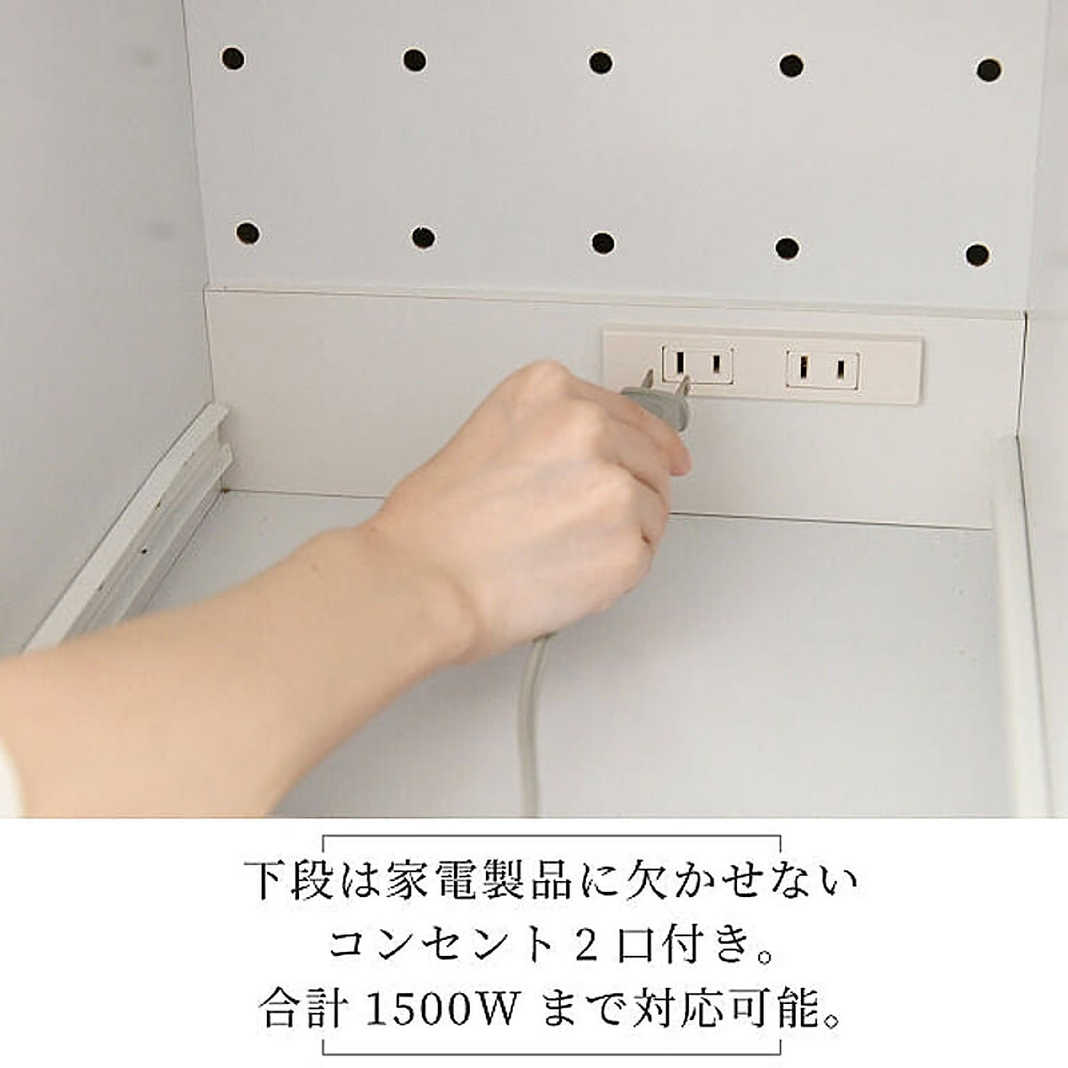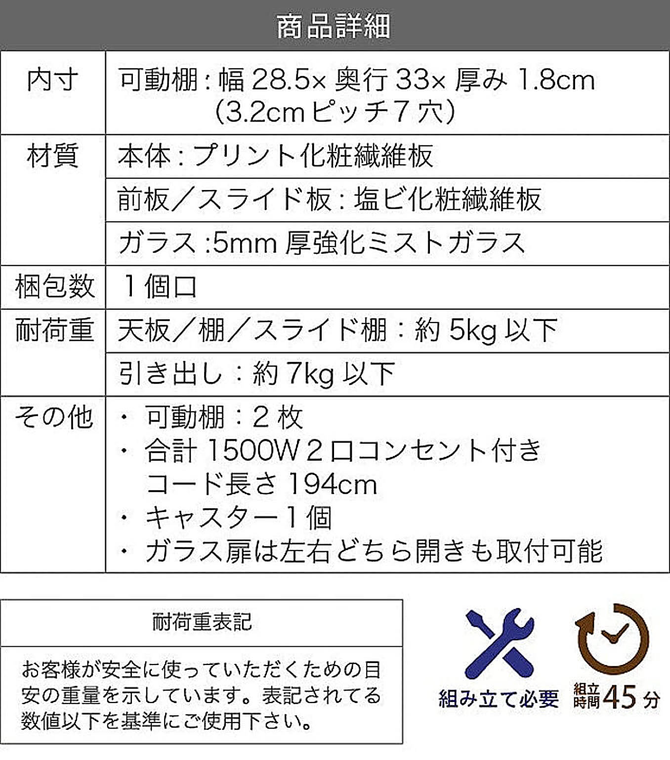 ・可動棚:2枚 ・合計1500W2口コンセント付(コード長さ194cm) ・キャスター1個 ・ガラス扉は左右どちら開きも取り付け可能
