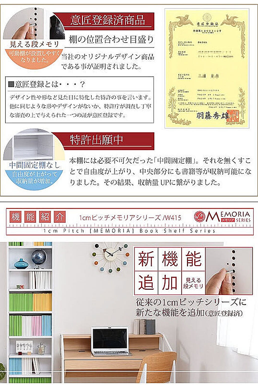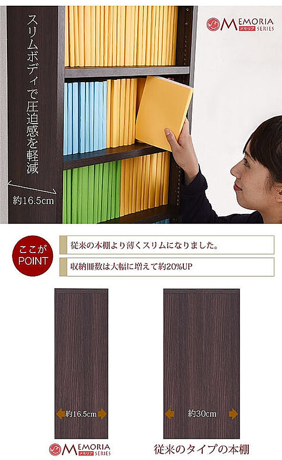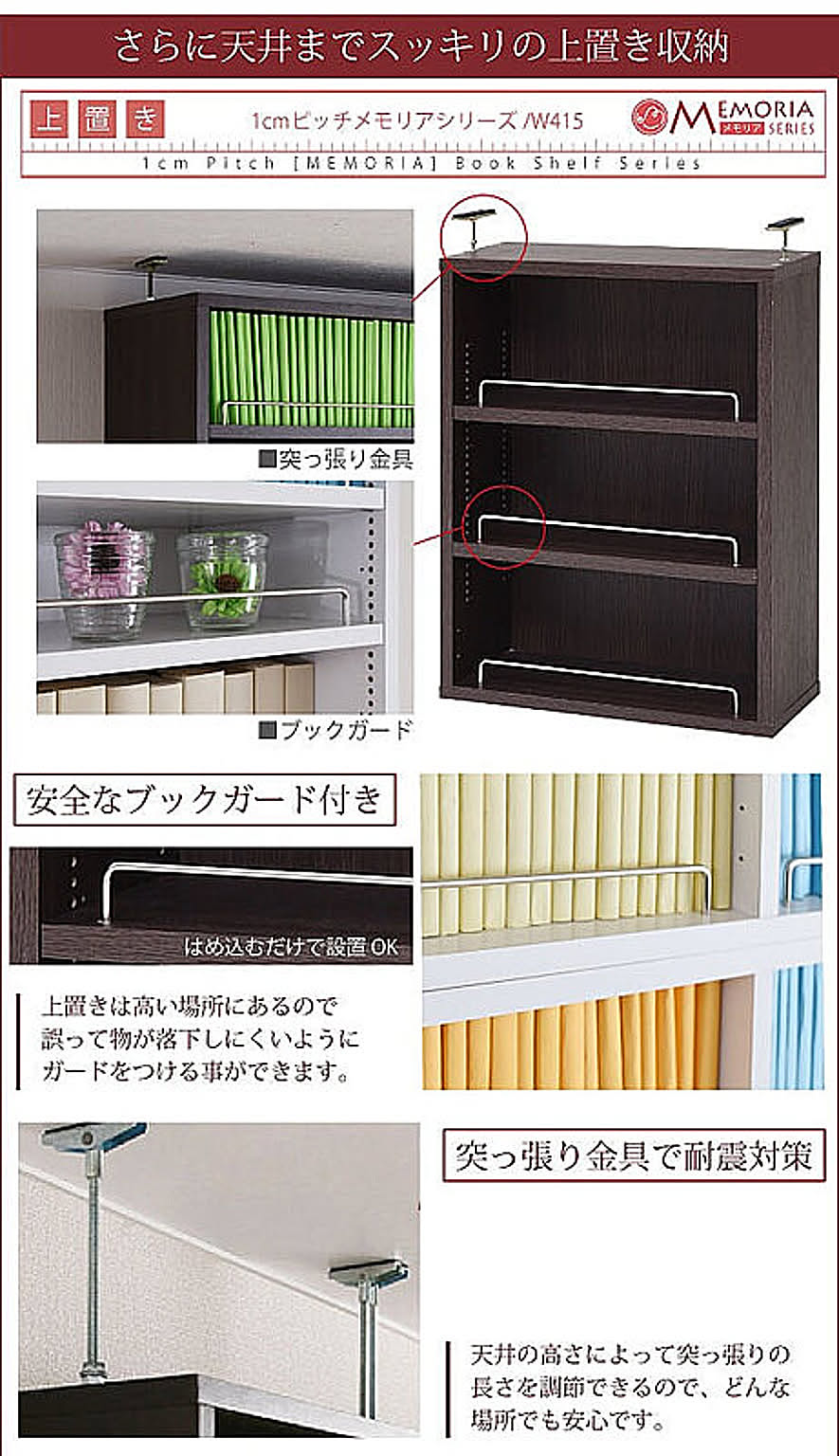 突っ張り上置きセットなので天井まで空間の無駄を省いて大量収納。1cm間隔で棚板が設置でき、固定棚の無い画期的な仕様により、従来よりも自在な棚割りを可能にしました。ラックの中にデッドスペースを作らず、より多くの物が収納できます。薄型だからリビングだけでなく廊下や、狭いスぺースでも収納を確保できます。シリーズで揃えればまるで図書館 。スリムなサイズの薄型幅41.5はリビングにも、プライベートルームにも。