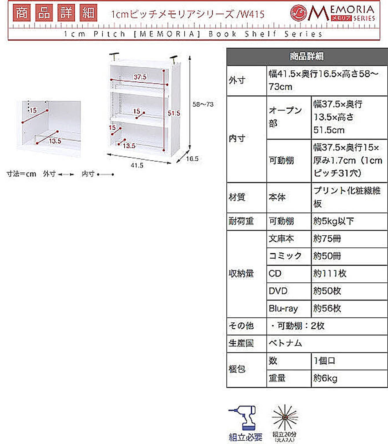 [外寸]幅41.5×奥行16.5×高さ58.0~73.0cm [内寸] (オープン部)幅37.5×奥行13.5×高さ51.5cm (可動棚)幅37.5×奥行15×厚み1.7cm(1cmピッチ31穴)