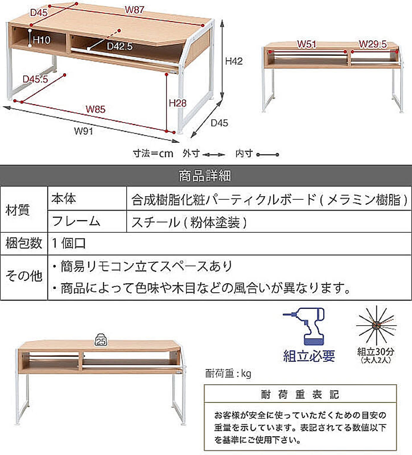 [外寸] 幅91×奥行45×高さ42cm [内寸] (天板)幅87×奥行45cm (オープン部小)幅29.5×奥行42.5×高さ10cm (オープン部大)幅51×奥行42.5×高さ10cm (テーブル下)幅85×奥行45.5×高さ28cm