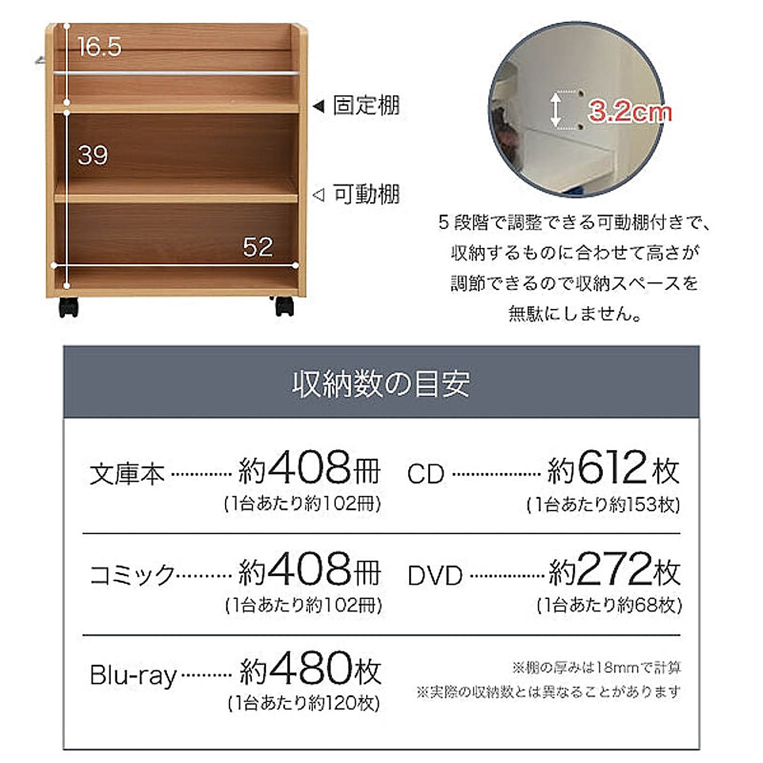 【収納数(1個あたり)】 [文庫本]約102冊 [コミック]約102冊 [CD]約153枚 [DVD]約68枚 [Blu-ray]約120枚 【耐荷重】 [固定棚]約10kg以下 [可動棚]約7kg以下