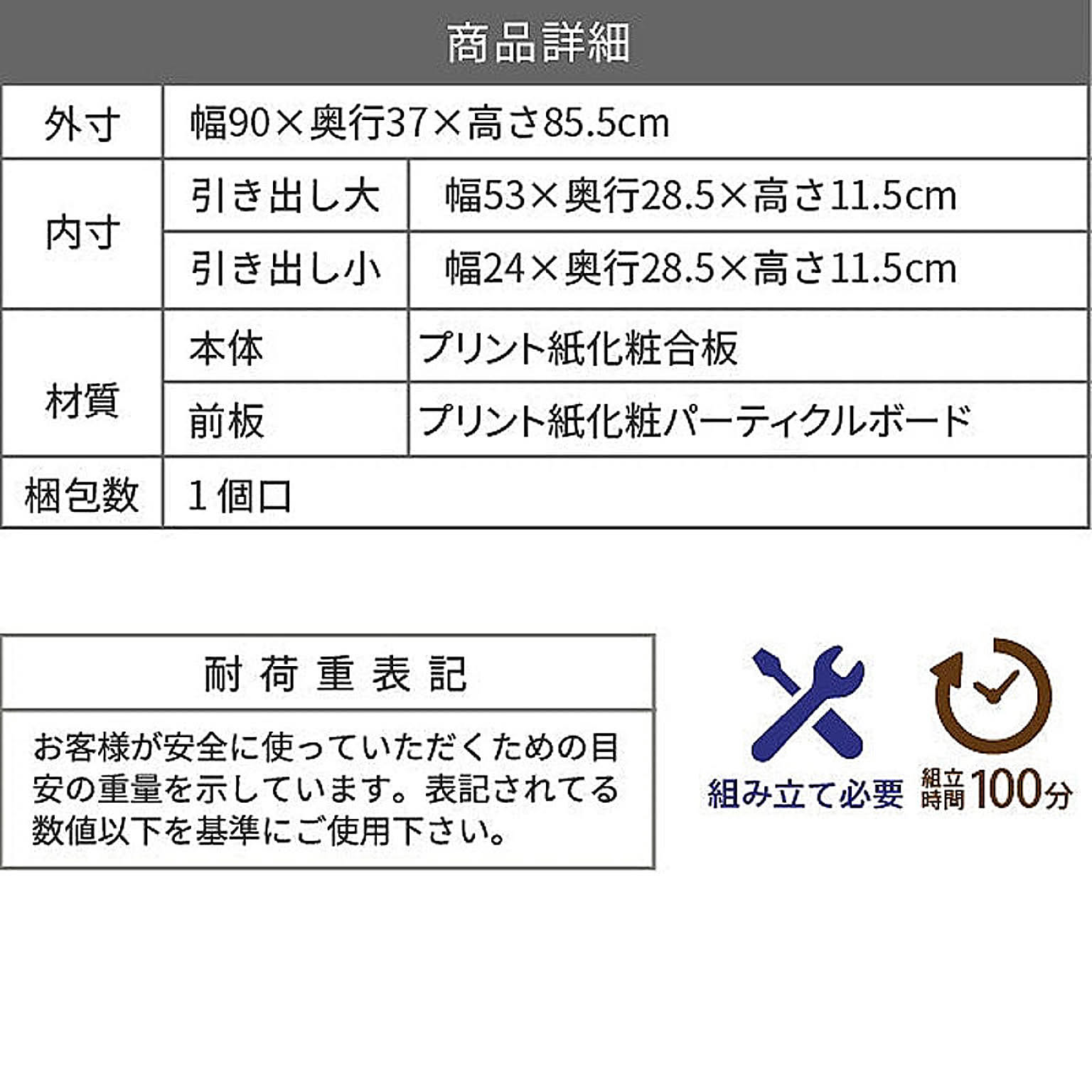 [外寸]幅90×奥行37×高さ85.5cm [内寸] (引き出し大)幅53×奥行28.5×高さ11.5cm (引き出し小)幅24×奥行28.5×高さ11.5cm