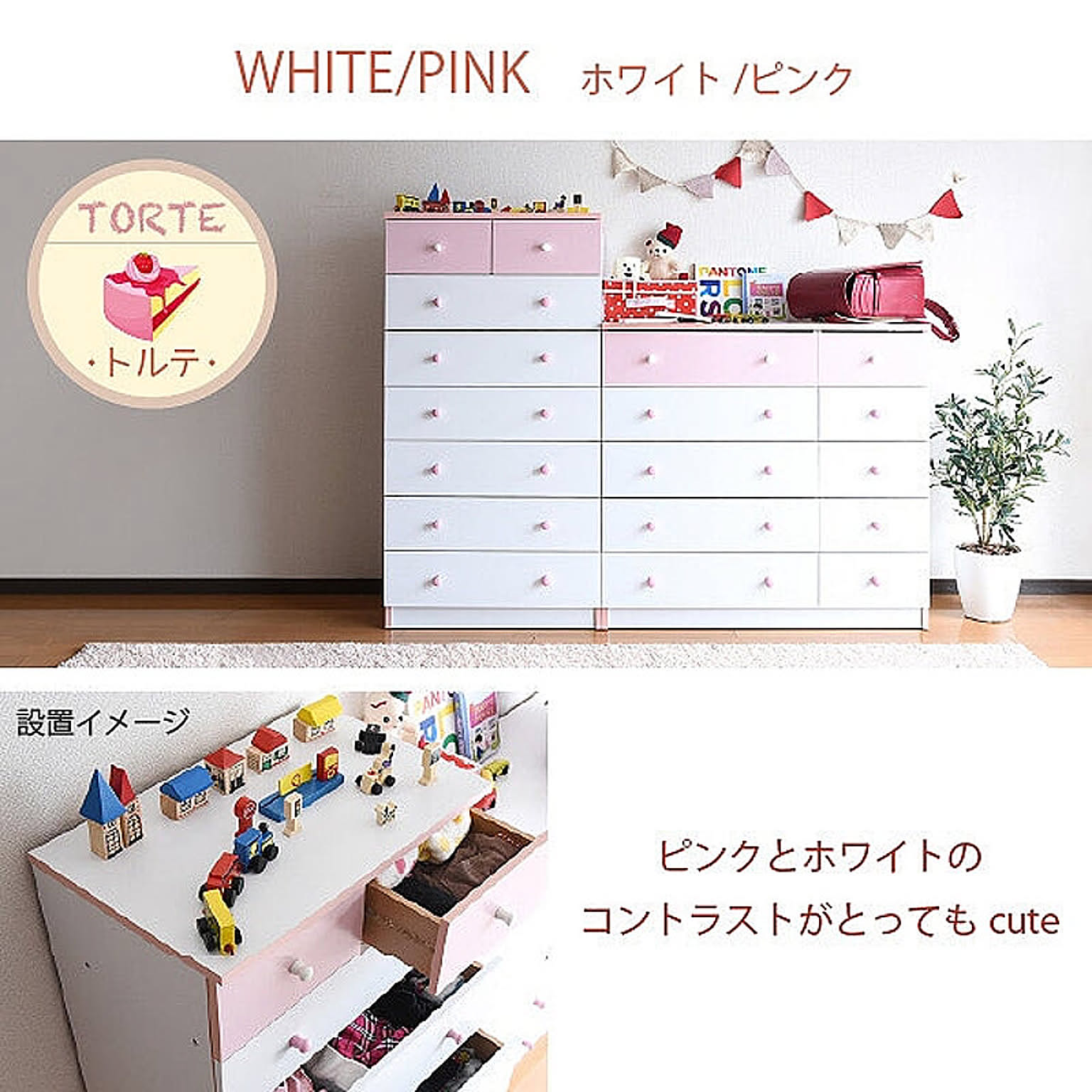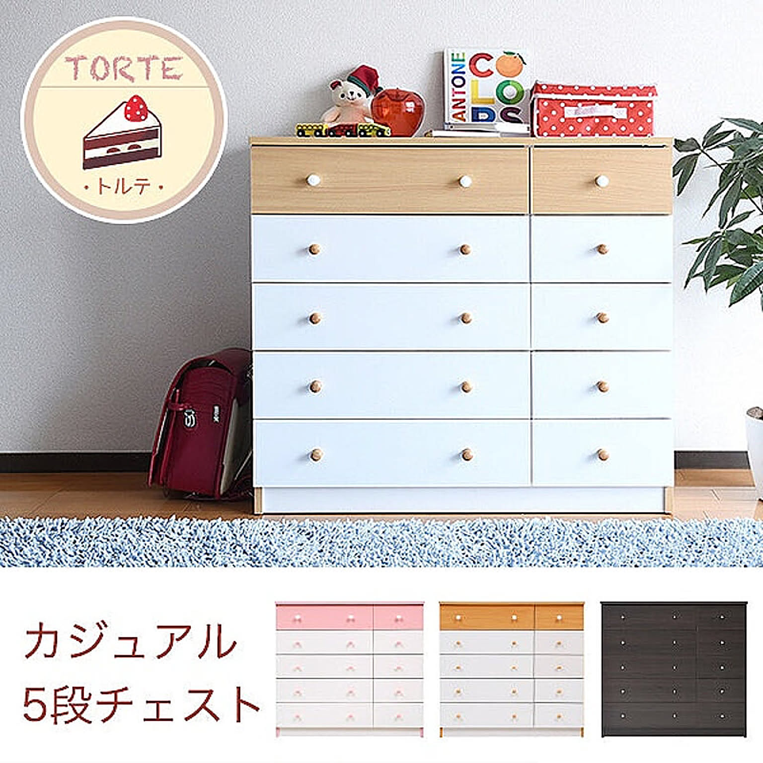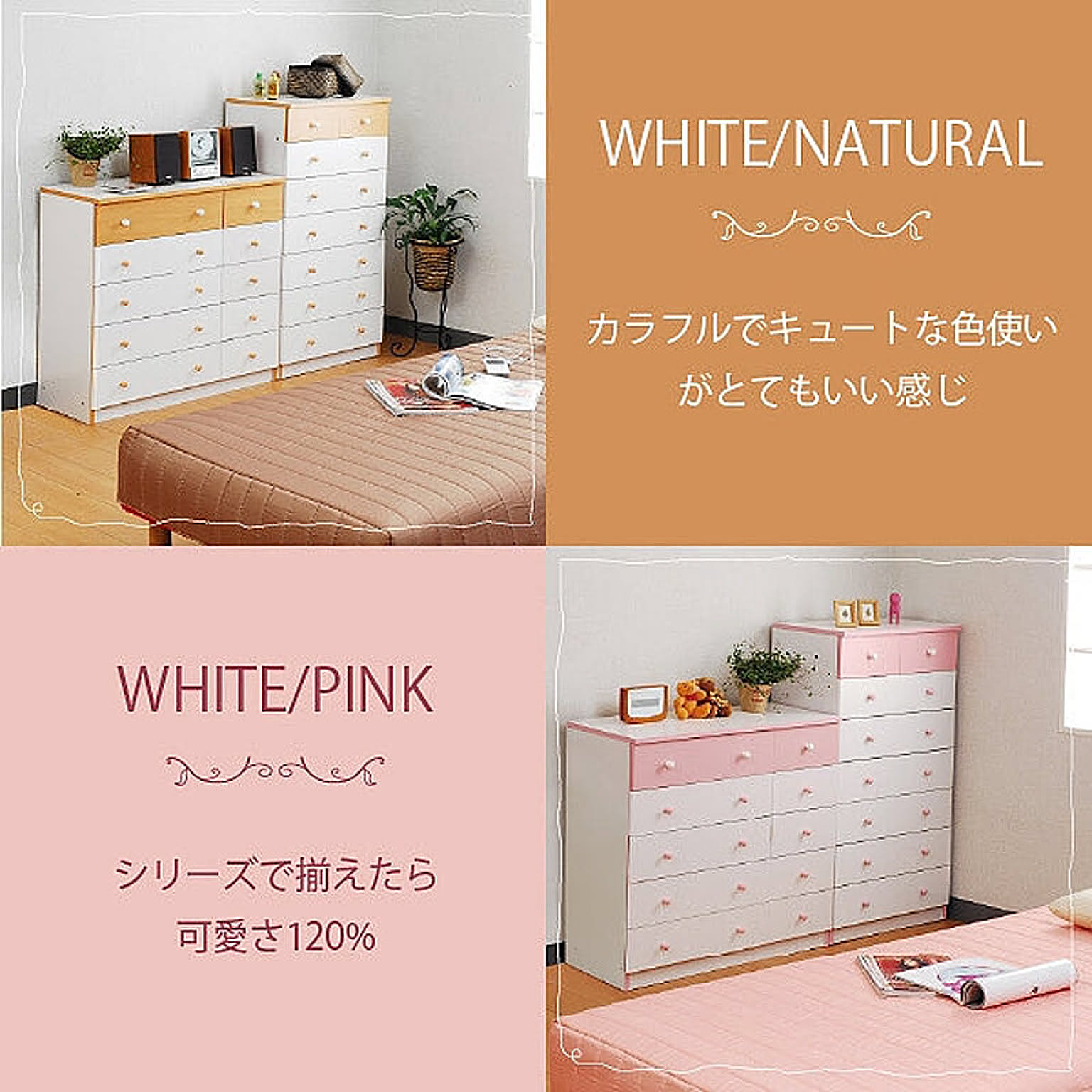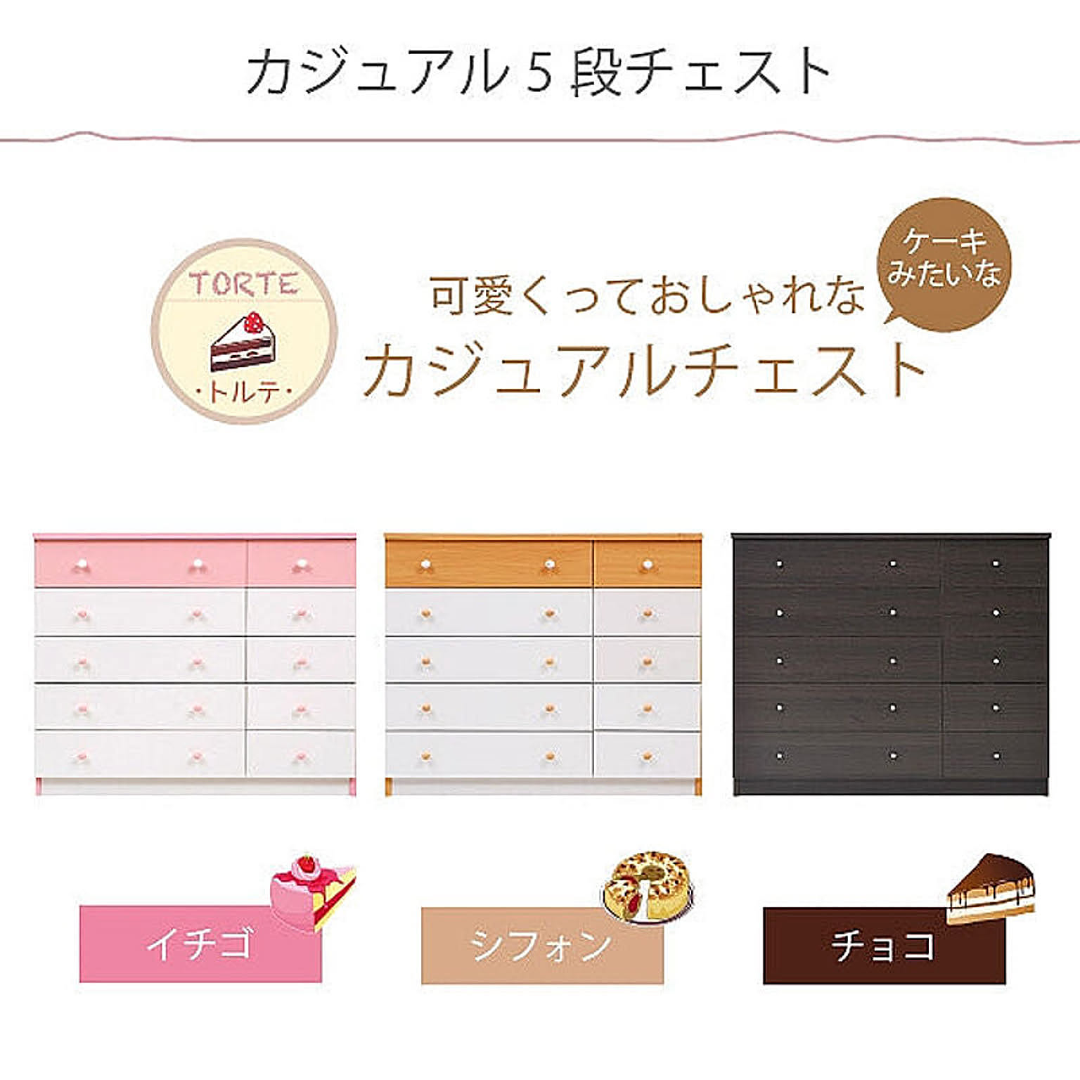 かわいいピンクとさわやかなナチュラル、シックなダークブラウンをご用意。お子様から大人まで幅広い世代にピッタリのシンプルなデザイン。引き出しには衣類から小物までたっぷり収納。