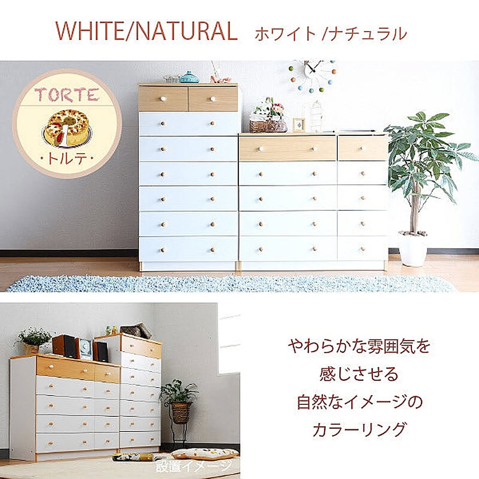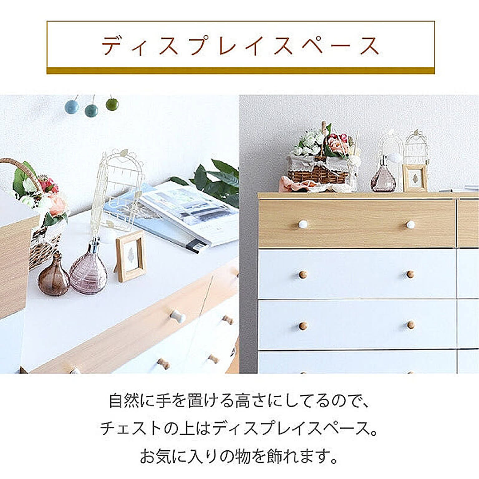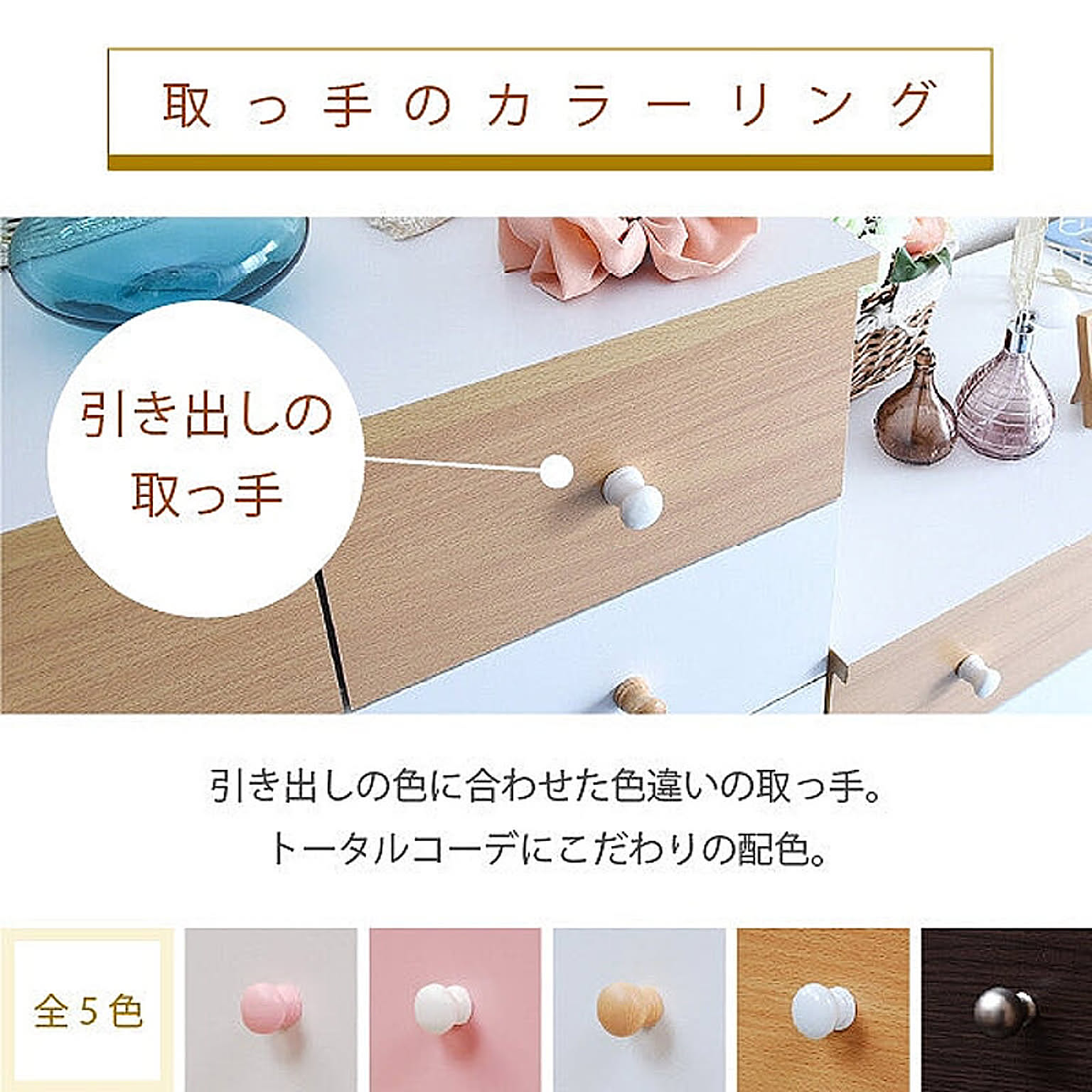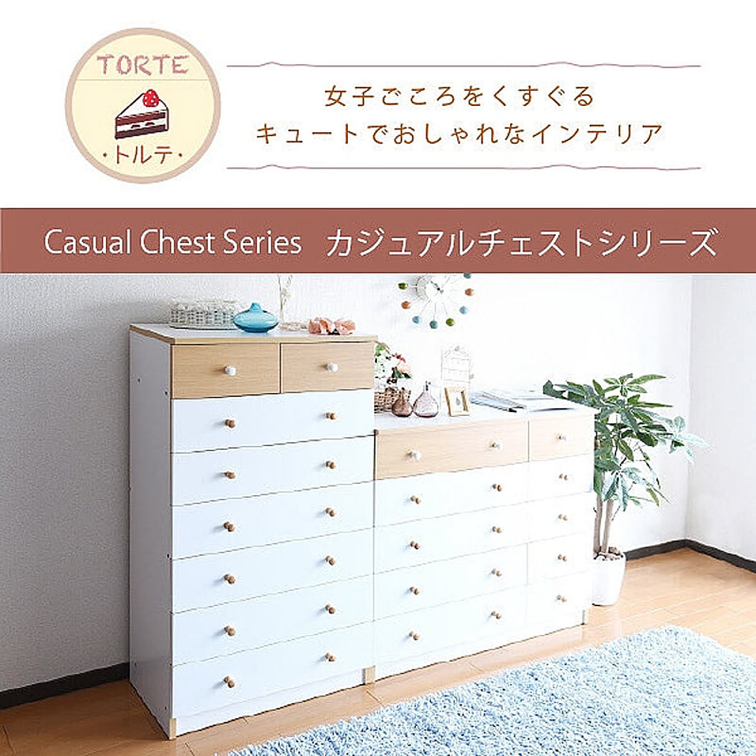 かわいいピンクとさわやかなナチュラル、シックなダークブラウンをご用意。お子様から大人まで幅広い世代にピッタリのシンプルなデザイン。引き出しには衣類から小物までたっぷり収納。