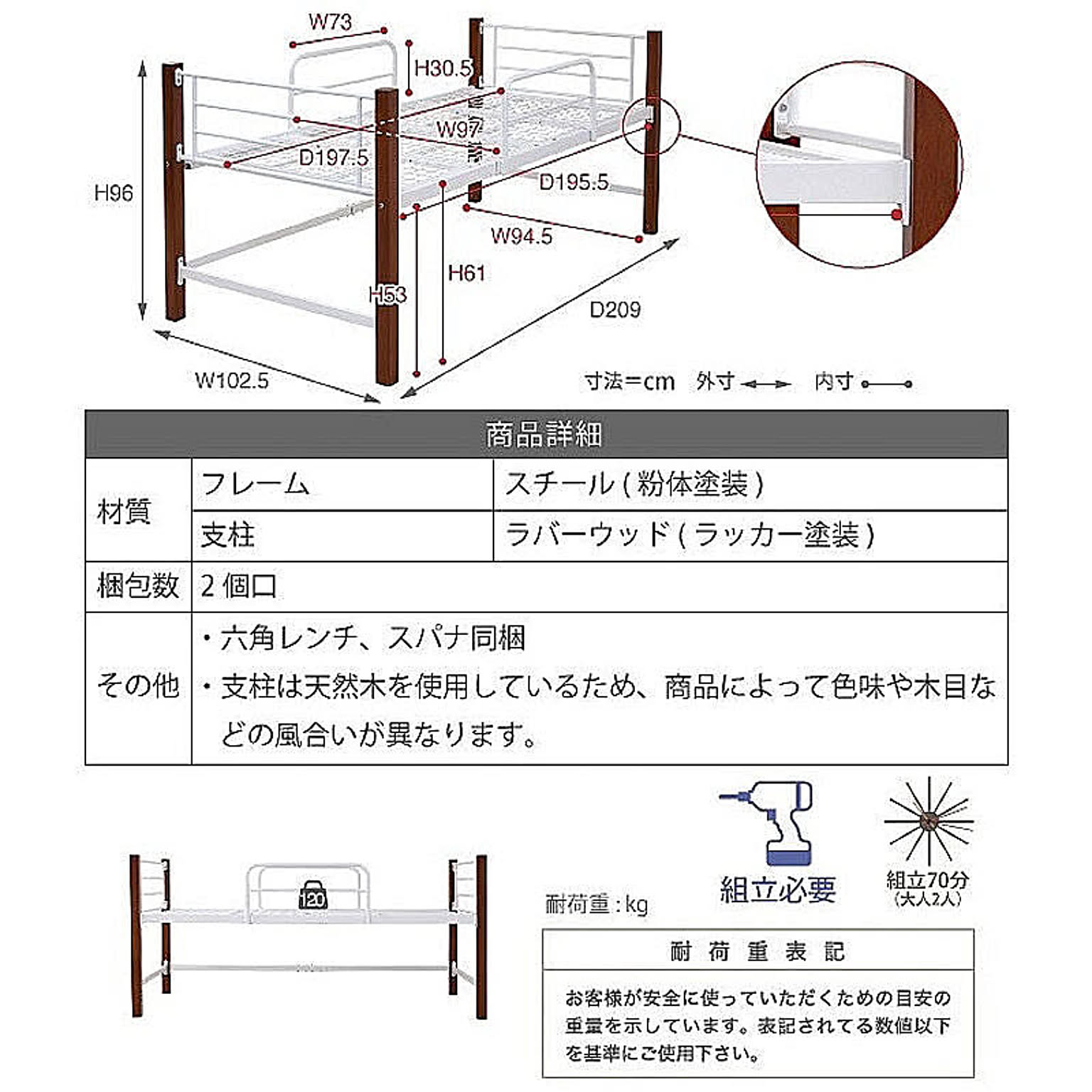 [外寸]幅102.5×奥行209×高さ96cm [内寸] (床面)幅97×奥行197.5cm (サイドガード)幅73×高さ30.5cm (床面高さ)高さ61cm (床面下)幅94.5×奥行195.5×高さ53cm