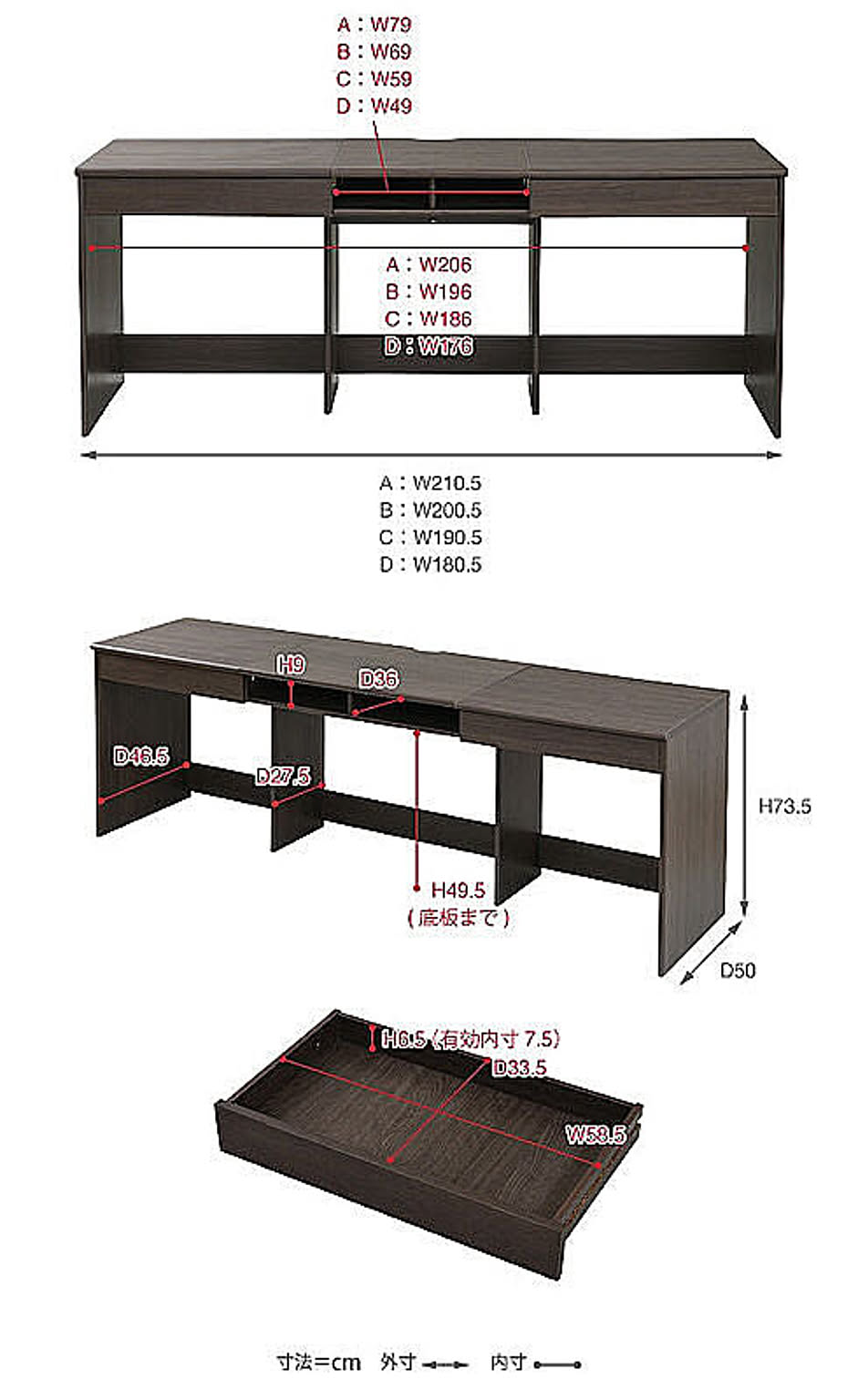 (脚部)幅(A)206(B)196(C)186(D)176×奥行46.5×高さ49.5cm