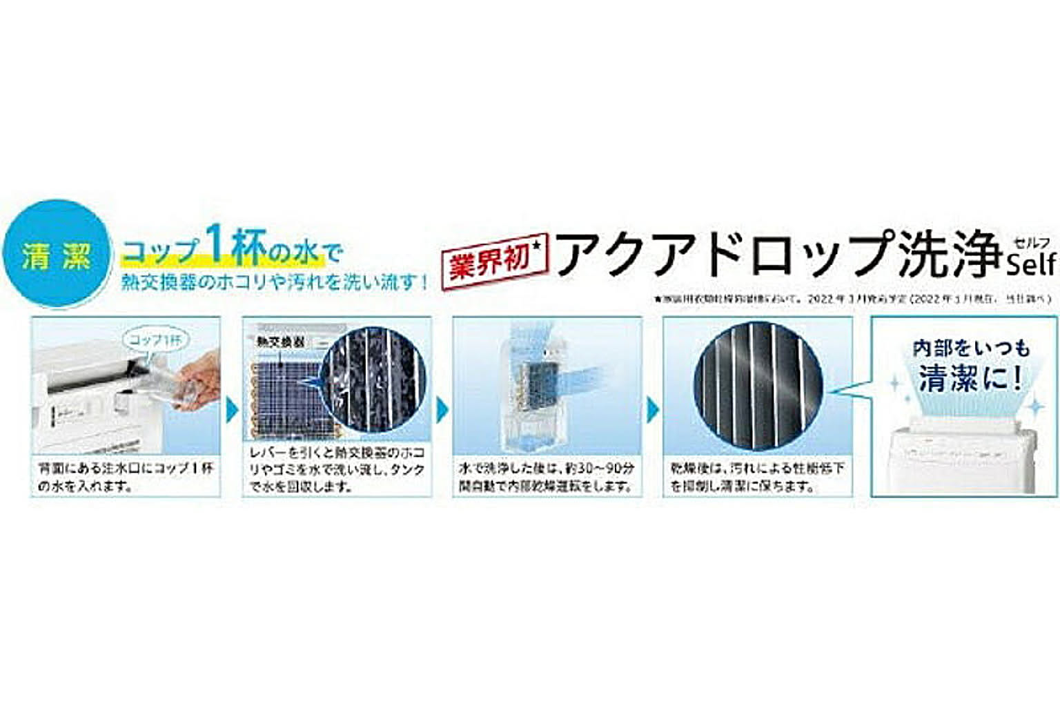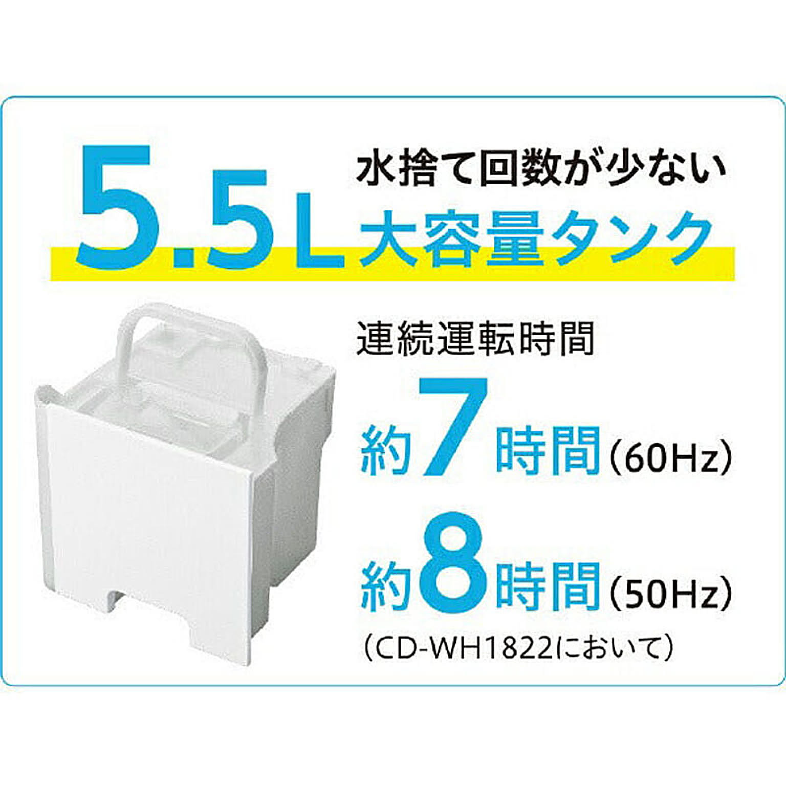 メーカー:コロナJAN:4906128385332型番:CD-WH1822■商品説明■●「300Wヒーター温風と速乾Wルーバーで業界トップクラスのスピード衣類乾燥。●シーンに合わせて、標準・eco・集中速乾の3つの衣類乾燥モード搭載。●業界初の清潔機能、アクアドロップ洗浄セルフ搭載。コップ1杯の水で熱交換器に付着したホコリや汚れを洗い流します。■仕様■・サイズ(約):657×378×235mm