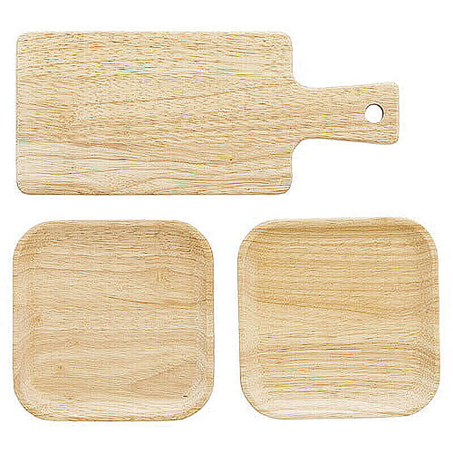 カッティングボードセット303木製のプレートで食卓をおしゃれなカフェのように。割れ物ではないので、お子様の食器としてもご使用いただけます。ラバーウッドは、地球と環境に優しいエコな木材です。●材質 天然木(ラバーウッド) ●セット内容 ウッドプレート(16×16×1.5cm)×2、カッティングボードM(13×31×1.5cm)×1 ●本体重量 約570g ●生産国 VNM ※注釈 天然木を使用の為、サイズや色合い、木目が多少異なる場合がございます。