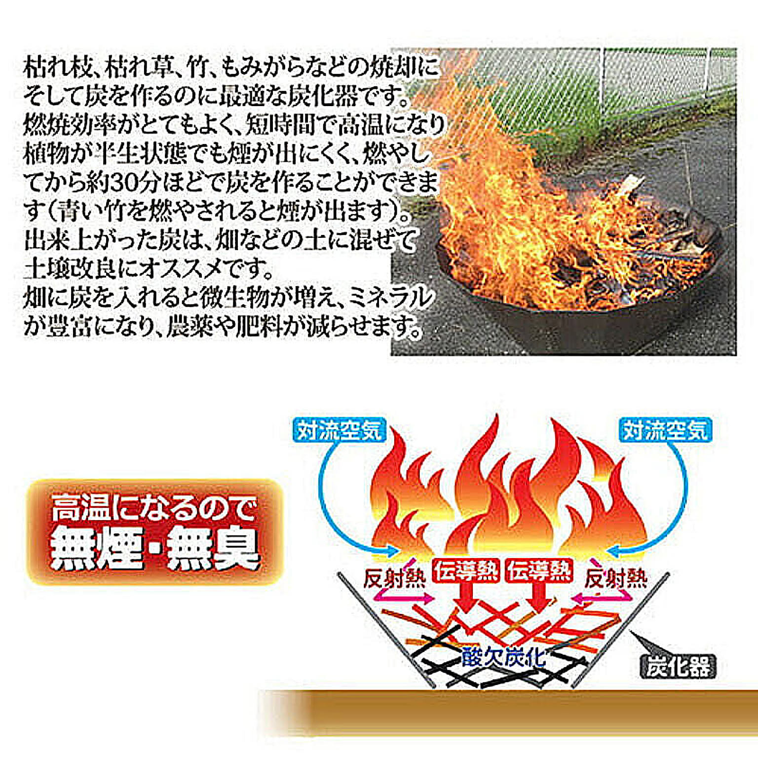 枯れ枝、枯れ草、竹、もみがらなどの焼却に、そして炭を作るのに最適な炭化器です。燃焼効率がとてもよく、短時間で高温になり植物が半生状態でも煙が出にくく、燃やしてから約30分ほどで炭を作ることができます(青い竹を燃やされると煙が出ます)。出来上がった炭は、畑などの土に混ぜて土壌改良にオススメです。畑に炭を入れると微生物が増え、ミネラルが豊富になり、農薬や肥料が減らせます。