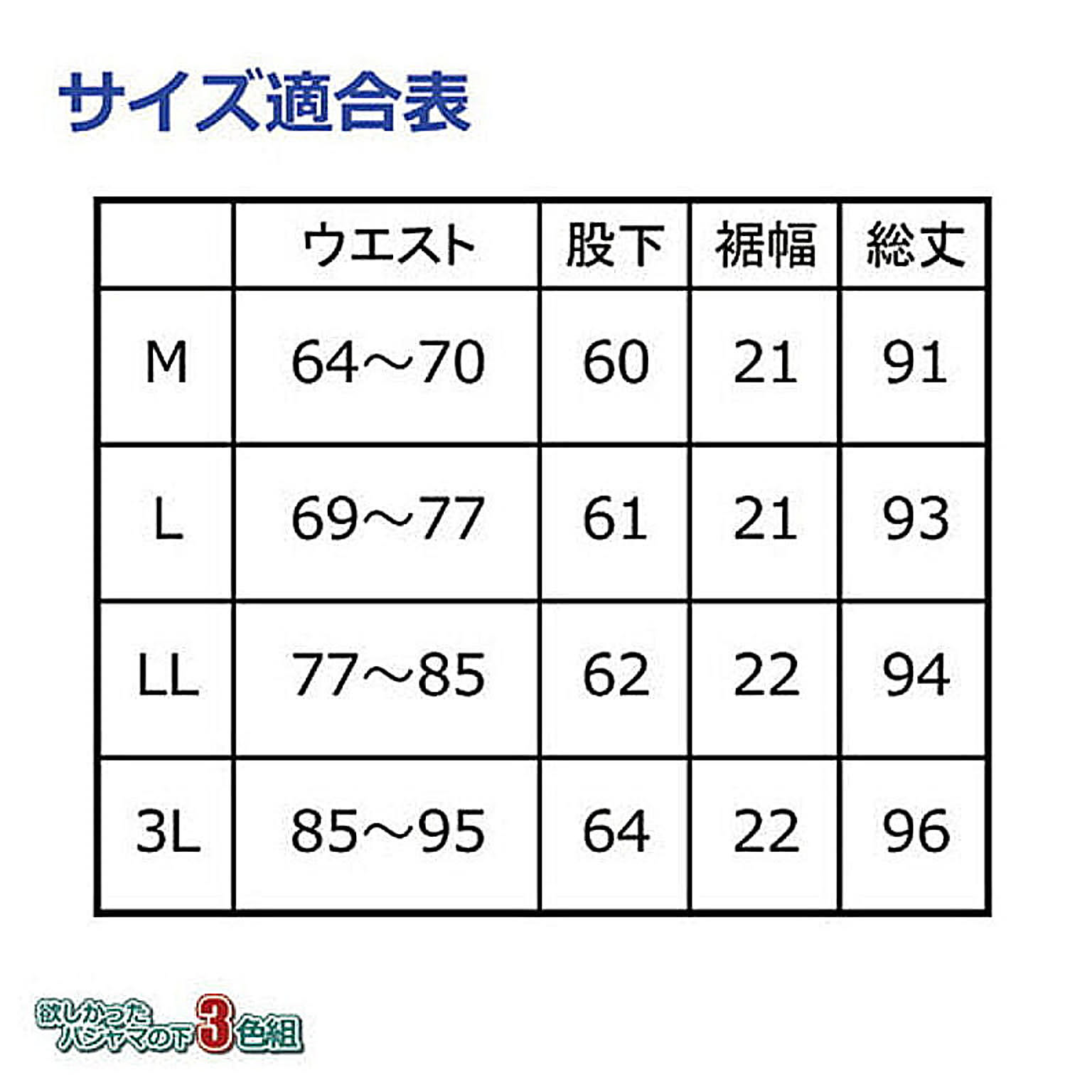 夏場など気温が高い夜、「パジャマは下だけで十分!」という方にオススメの下だけパジャマです。3色セットなので、洗い替えにも便利で、パジャマとしてだけでなく部屋着用としても。綿素材100%なので優しい風合いで、気持ち良く着ていただけます。腰部分はゴム入りで、ゴムの取り替え口も付いてます。●適応サイズ:ウエスト85?95cm・股下64cm・裾幅22cm・総丈96cm