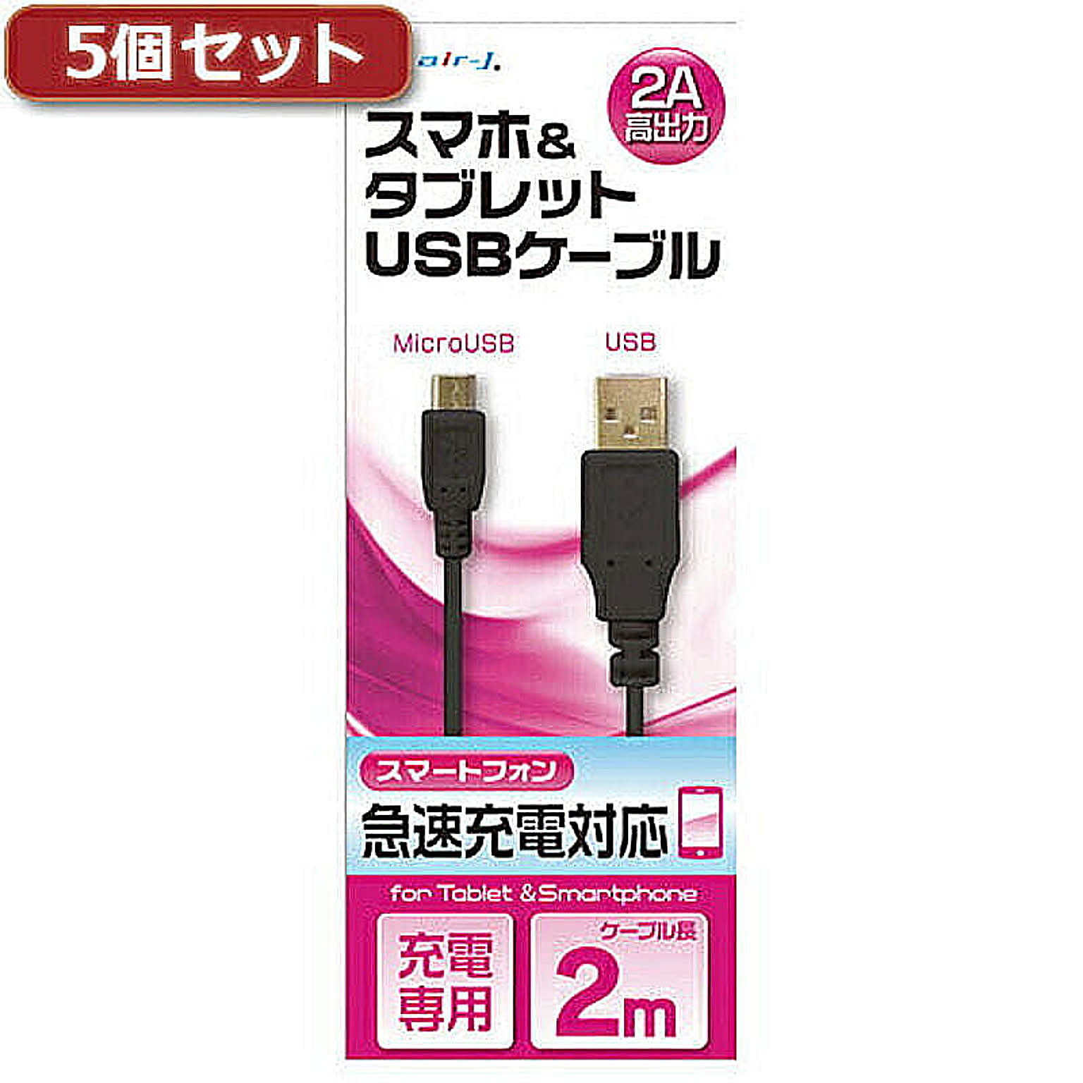 5個セット エアージェイ USB 2Aカラーケーブル 2M BK UKJ2AN-2MBKX5 管理No. 4589452958733