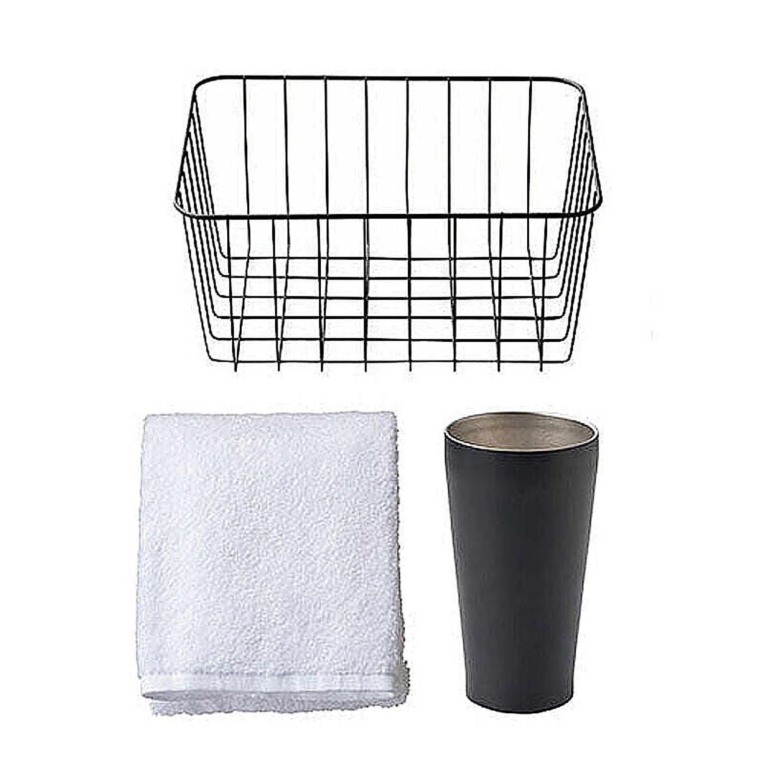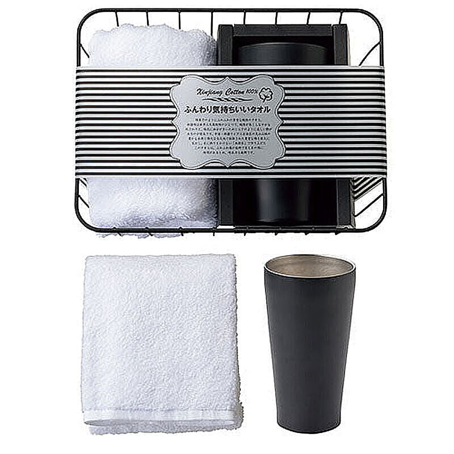 柔らかい肌触りが魅力のタオルと結露しにくいタンブラーを、シンプルシックなアイアンカゴに入れて。肌ざわり良いフェイスタオルと真空タンブラーのセット貴重な繊維で作られたふわふわのタオルと、真空二重構造タンブラーのセット。タンブラーは保温、保冷に優れていて、シンプルで飽きのこないデザインも魅力。◎セット内容・材質/フェイスタオル(33×84cm、綿100%)×1 、真空二重構造タンブラー(φ7.5×13.6cm、350ml、18-8ステンレス)×1 、アイアンカゴ(17×23×11cm、鉄)×1