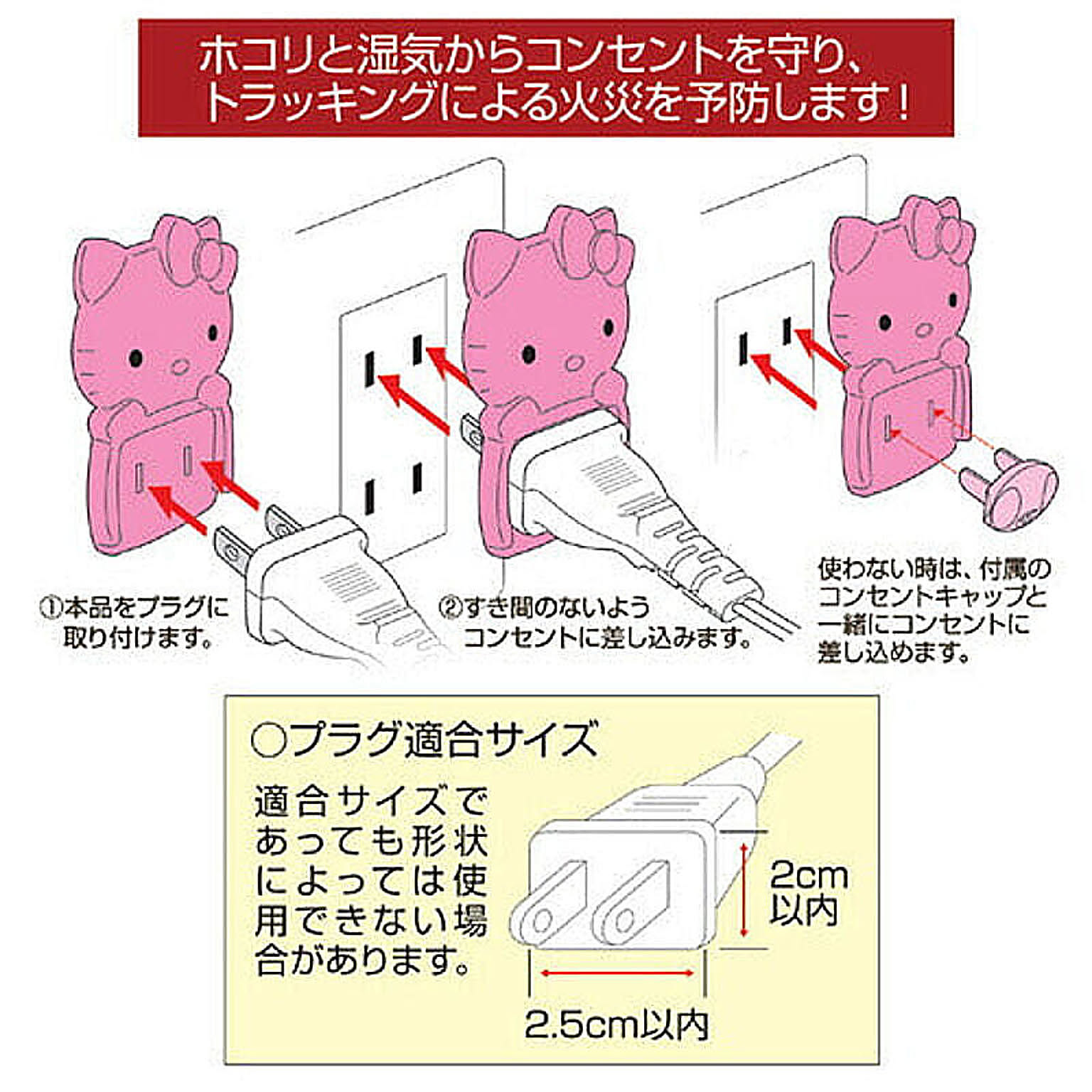 最近の火災原因の一つとして問題になっているトラッキング火災を防止するカバーとして新開発されました。トラッキング火災とは、コンセントにプラグを差し込んだままにしたところにホコリが溜まり、電流が流れて発電・発火することです。これを防止するために、コンセントとプラグの隙間をカバーすることで防止が可能です。「ハローキティのコンセントカバー」は、大人気のハローキティが私たちを見守ってくれるような可愛らしいニューデザインで、大学生のアイデアで誕生したことでも話題になり、現代の若者の高いセンスが「癒し」と「安心」を共存させてます。使用していないコンセントには付属のコンセントキャップでさらにカバーできます。●サイズ 上用/約6.2×4.1×0.8cm 下用/約3.5×4.7×0.7cm
