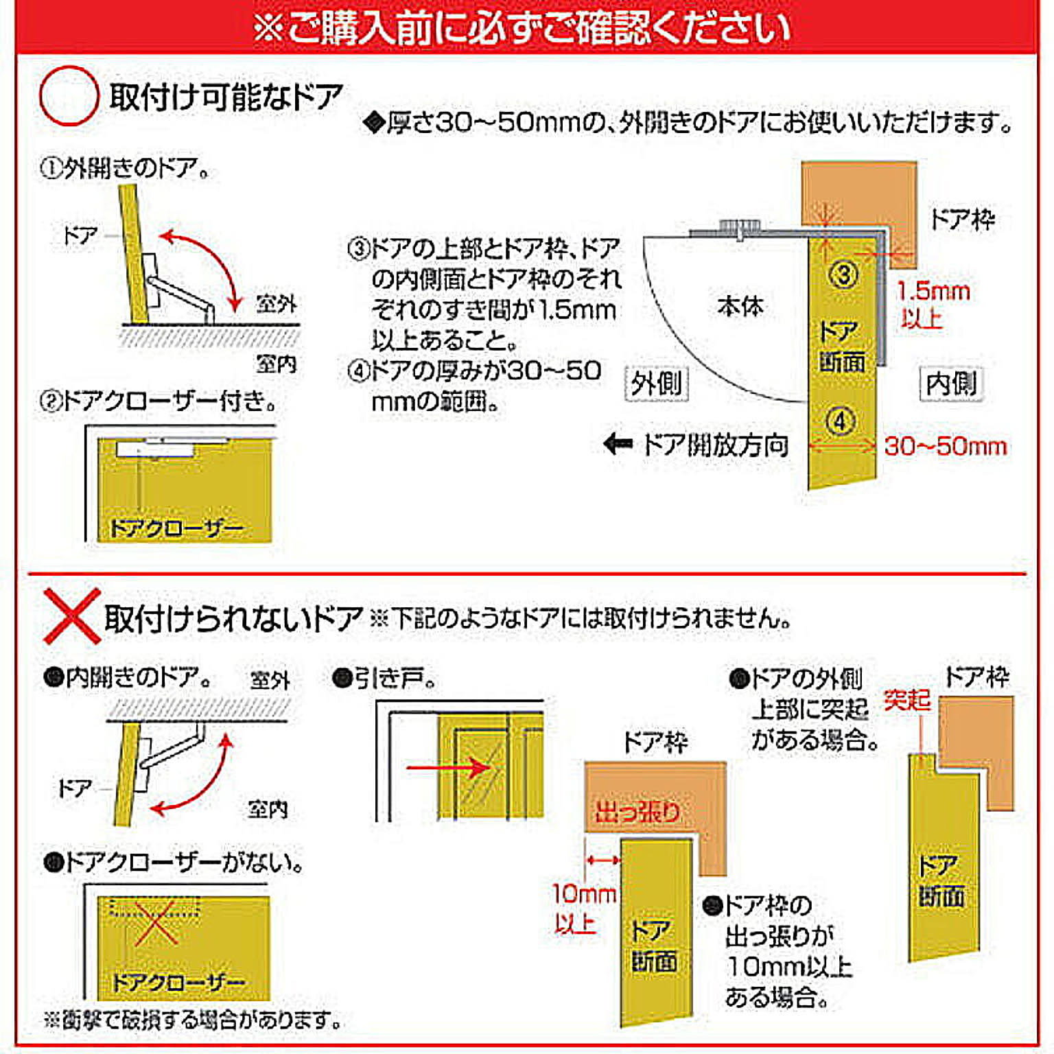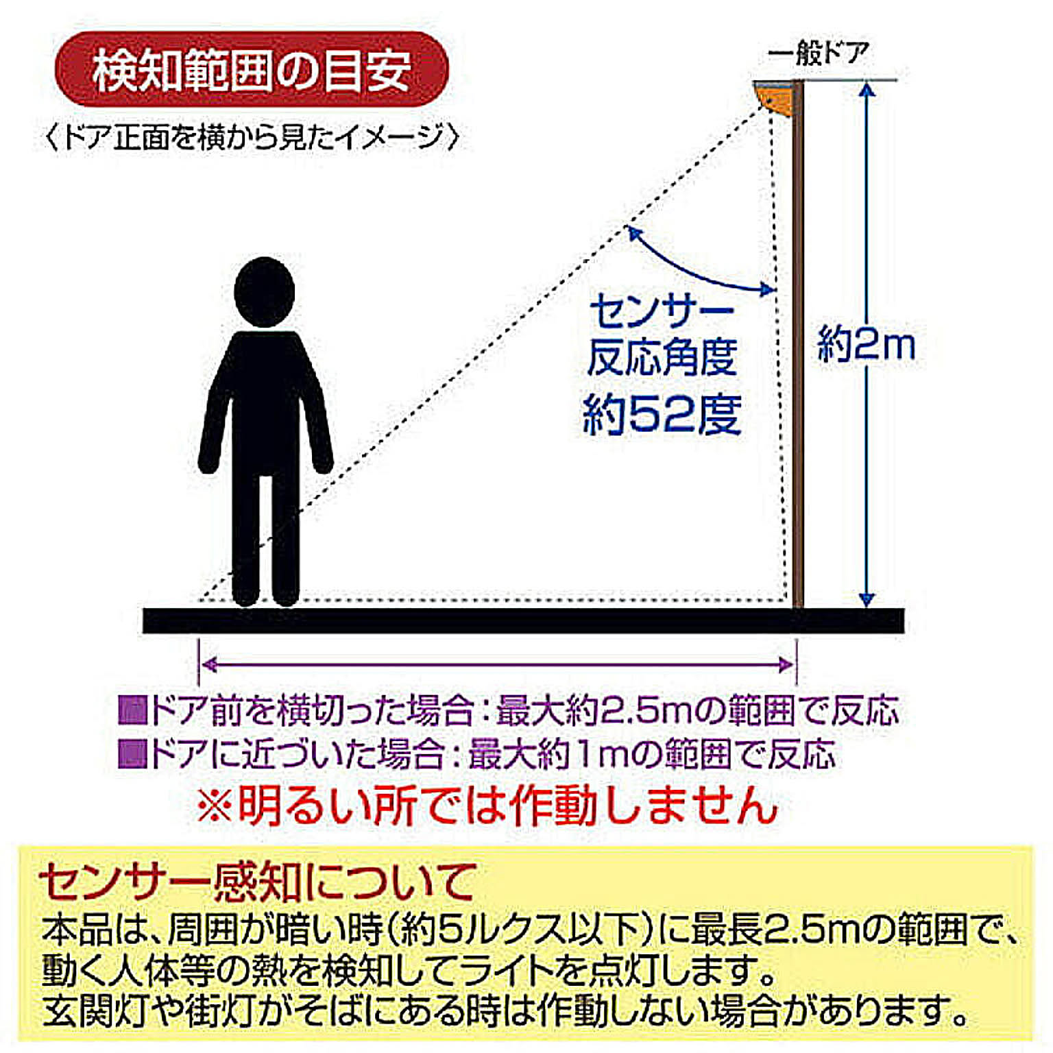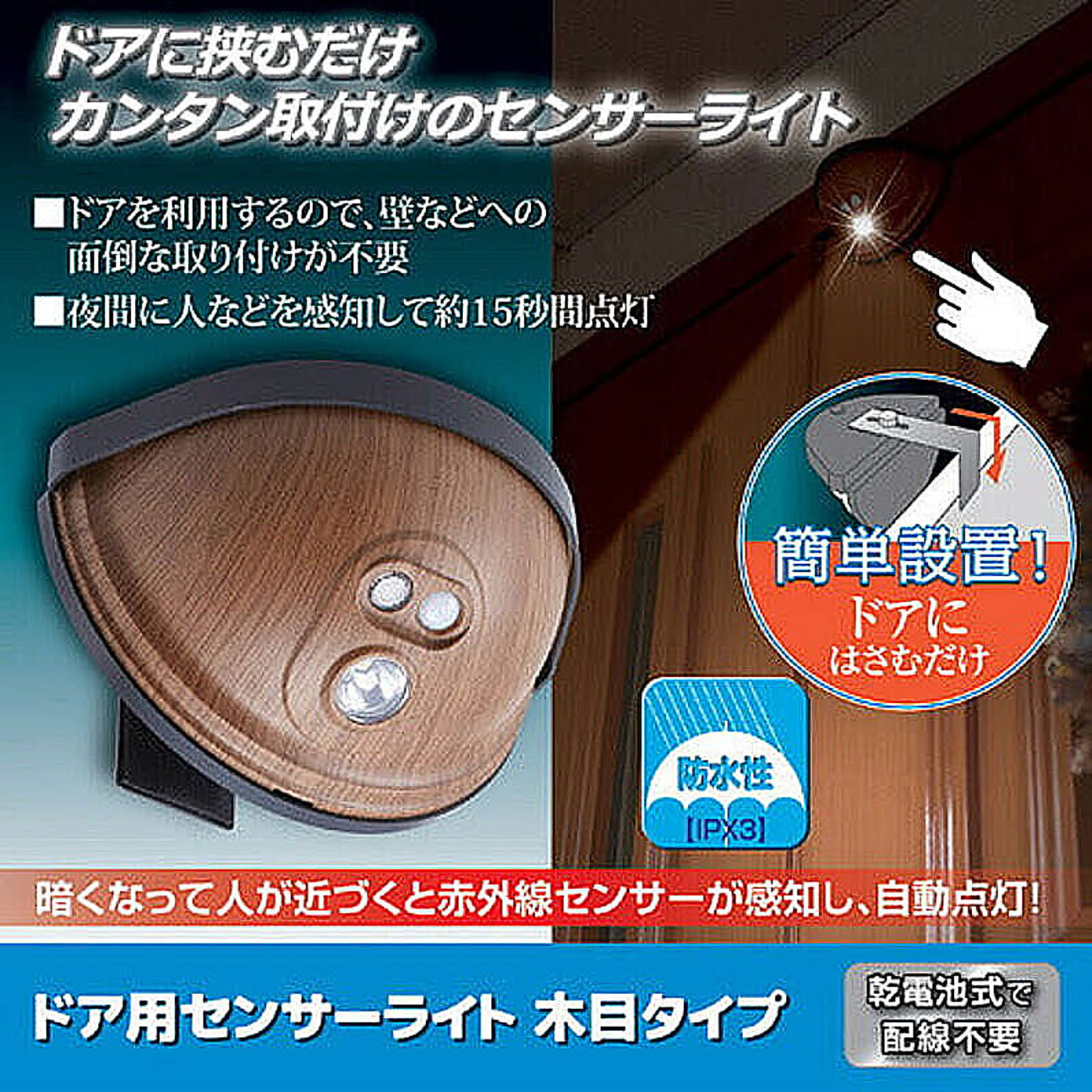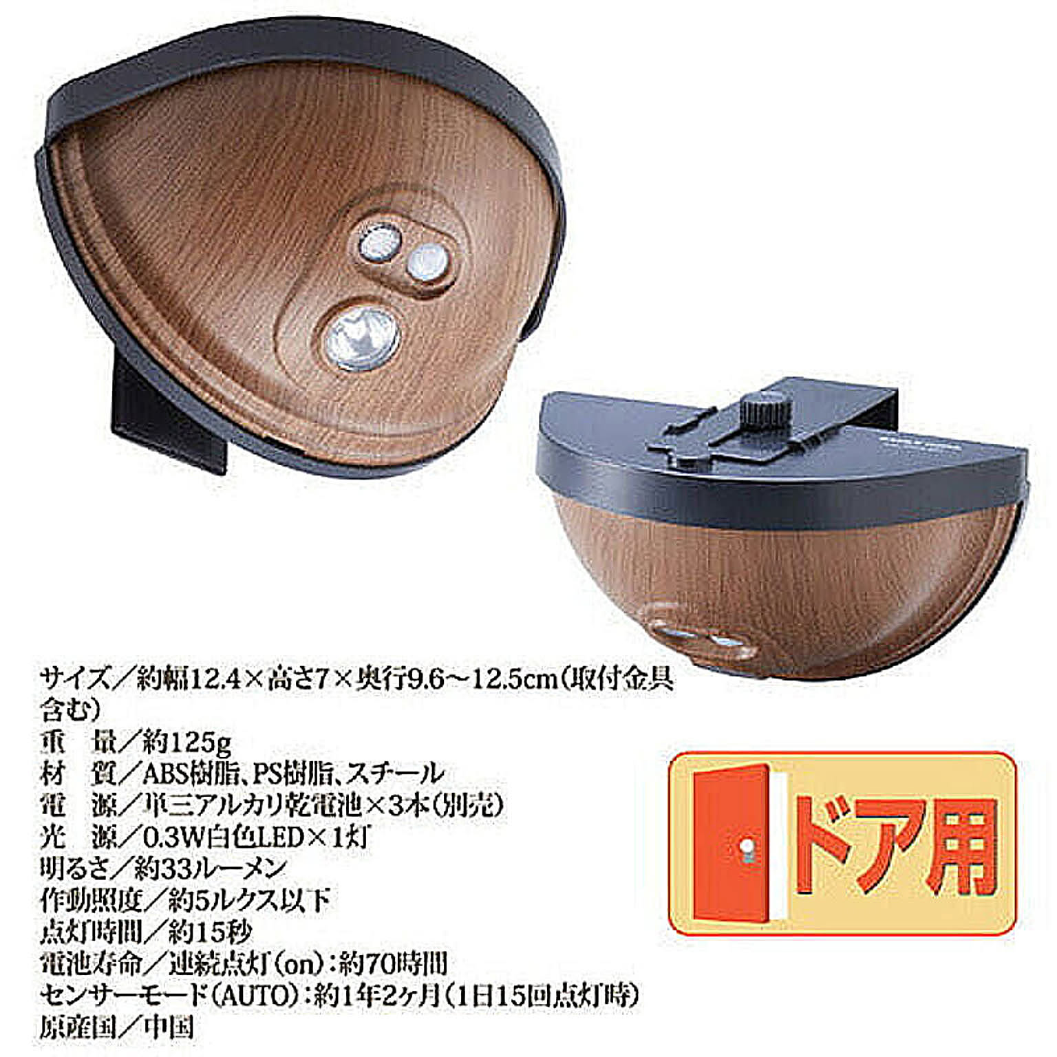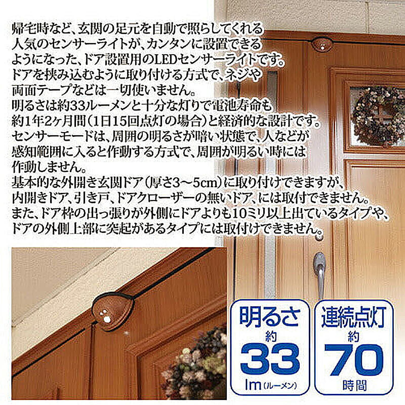帰宅時など、玄関の足元を自動で照らしてくれる人気のセンサーライトが、カンタンに設置できるようになった、ドア設置用のLEDセンサーライトです。ドアを挟み込むように取り付ける方式で、ネジや両面テープなどは一切使いません。明るさは約33ルーメンと十分な灯りで電池寿命も約1年2ヶ月間(1日15回点灯の場合)と経済的な設計です。センサーモードは、周囲の明るさが暗い状態で、人などが感知範囲に入ると作動する方式で、周囲が明るい時には作動しません。基本的な外開き玄関ドア(厚さ3?5cm)に取り付けできますが、内開きドア、引き戸、ドアクローザーの無いドア、には取付できません。また、ドア枠の出っ張りが外側にドアよりも10ミリ以上出ているタイプや、ドアの外側上部に突起があるタイプには取付けできません。●サイズ 約幅12.4×高さ7×奥行9.6?12.5cm(取付金具含む)