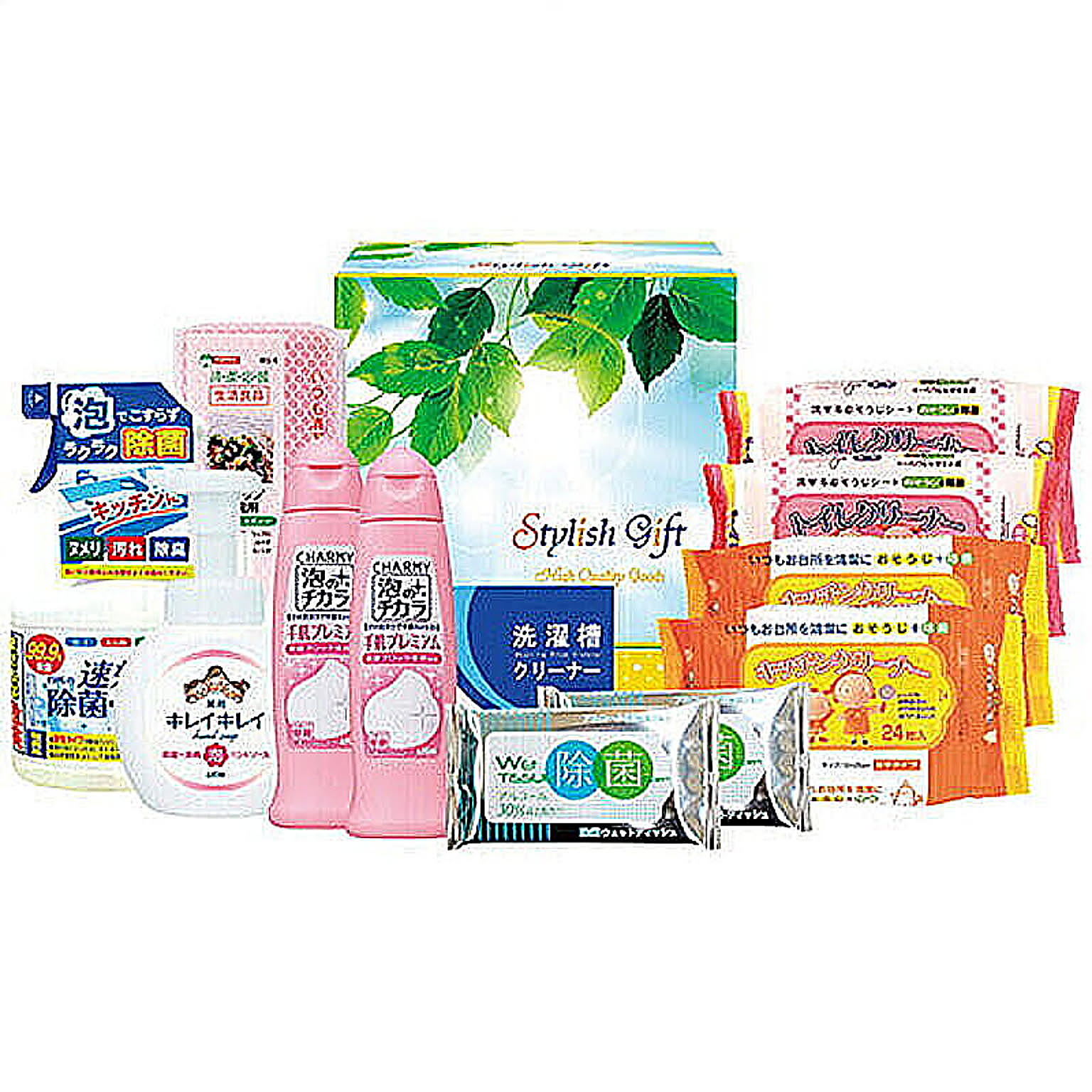 日々の暮らしに清潔空間をプロデュース。 除菌にこだわったアイテムを詰合せました。240mlチャーミー泡のチカラ手肌プレミアム2本・250mlキレイキレイ薬用泡ハンドソープポンプ・400ml台所の速効!除菌・漂白泡スプレー各1本・ウェットティッシュスリム除菌タイプ(10枚入)・キッチンクリーナー(24枚入)・トイレクリーナー(24枚入)各2個・洗濯槽クリーナー(4.5g×3個)・抗菌ネットスポンジ各1個[日本製][中国製]