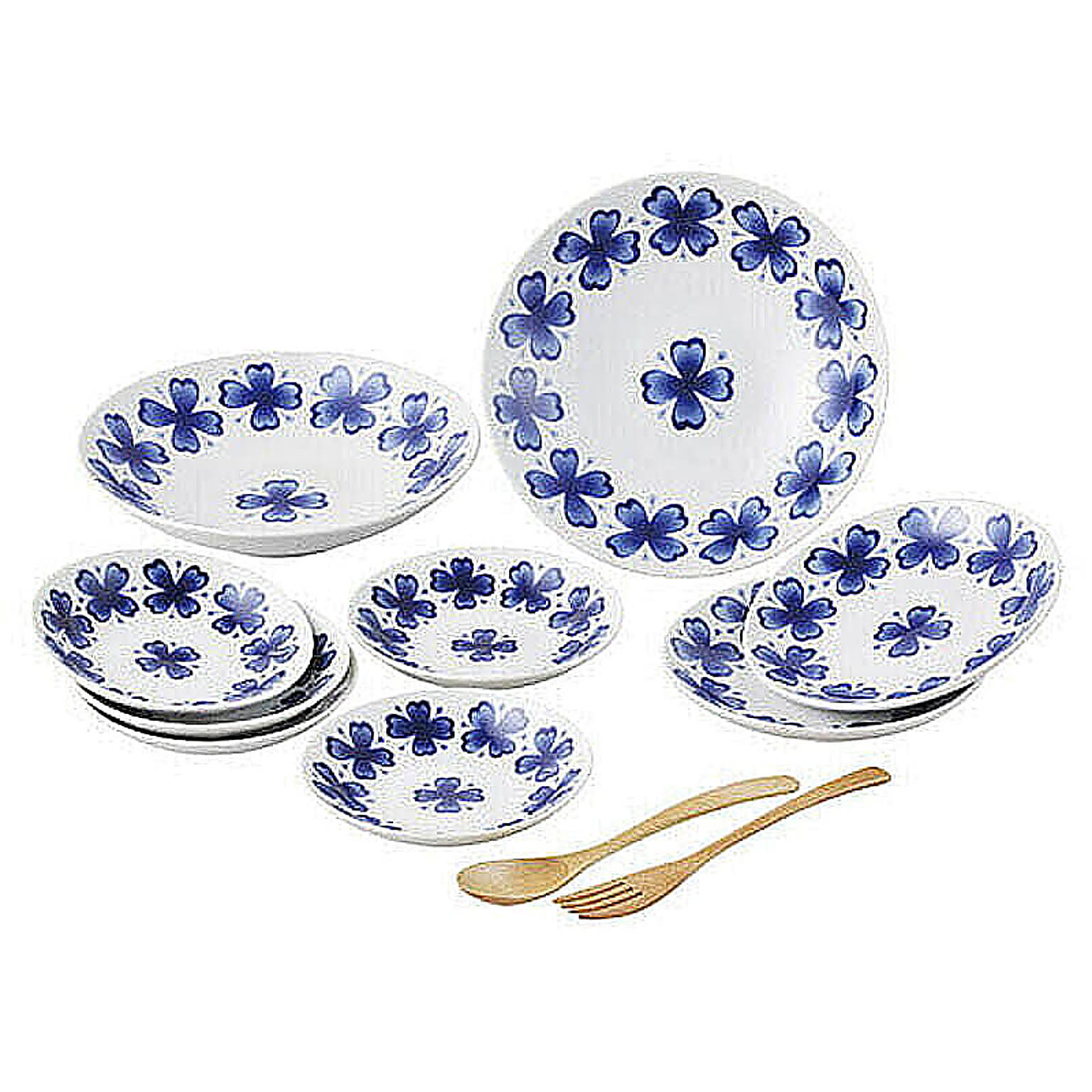 マルチプレートセットサイズの異なるプレートがあれば、急なお客様や大人数にも対応できます。落ち着いた藍色も魅力です。●材質 プレート 磁器、スプーン・フォーク 天然木 ●セット内容 プレートL(径21.5×4.7cm)・プレートM(径16.3×2.8cm)×各2、プレートS(径14×3cm)×5、スプーン・フォーク×各1 ●本体重量 約2.3kg ●生産国 JPN