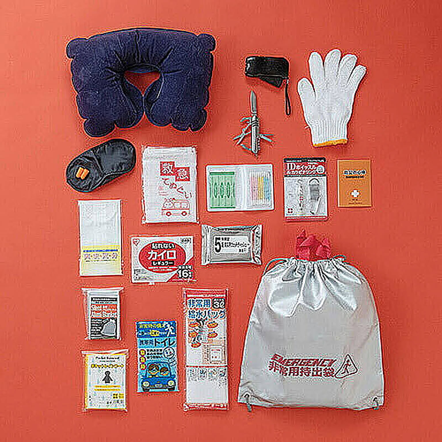 ●セット内容:非常持出袋(34×39cm)、IDホイッスル&カラビナリング、静音アルミブランケット、給水袋3リットル用、ダイナモLEDライト、レインコート、8徳ナイフ、ネックピロー、アイマスク、耳栓、携帯用トイレ、救急てぬぐい、綿棒&絆創膏、使い捨てカイロ、ウェットティッシュ、マスク、軍手、防災の心得