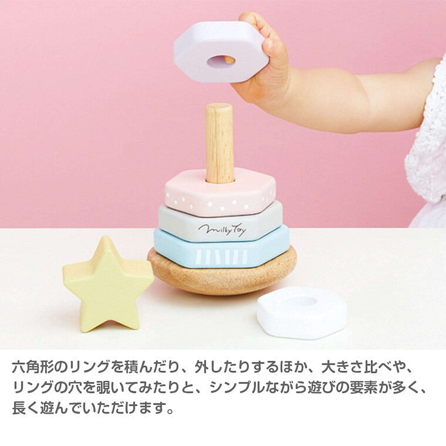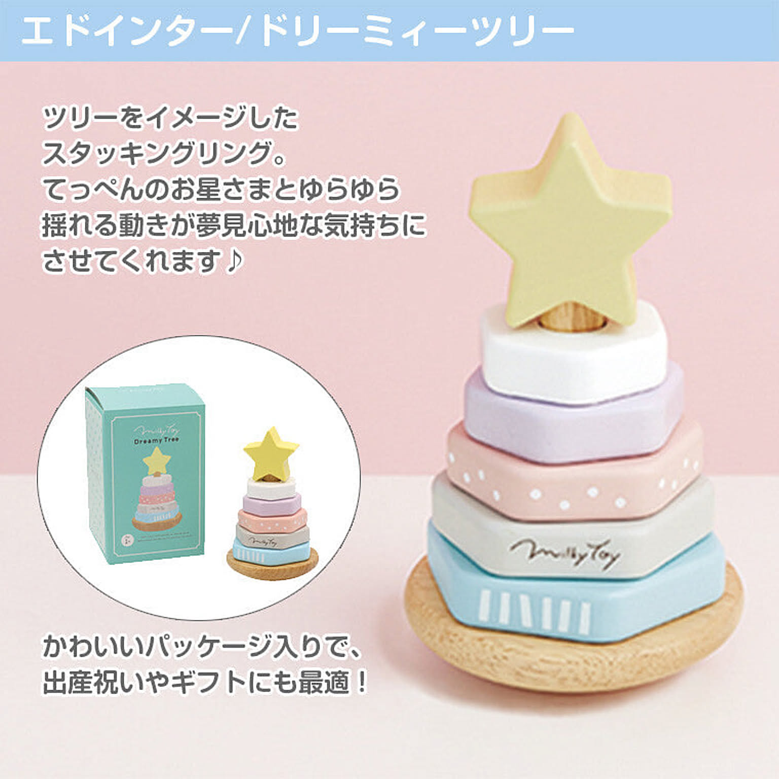 【特徴】インテリアにもおしゃれなベビーカラーが可愛い木製玩具シリーズ。ツリーをイメージしたスタッキングリング。てっぺんのお星様とゆらゆら揺れる動きが夢見心地な気持ちにさせてくれます♪かわいいパッケージ入りで出産祝いやギフトに最適! 【サイズ】直径約10cm×H12.5cm 【対象年齢】1歳頃~ 【セット内容】土台×1、リング×5、お星様×1