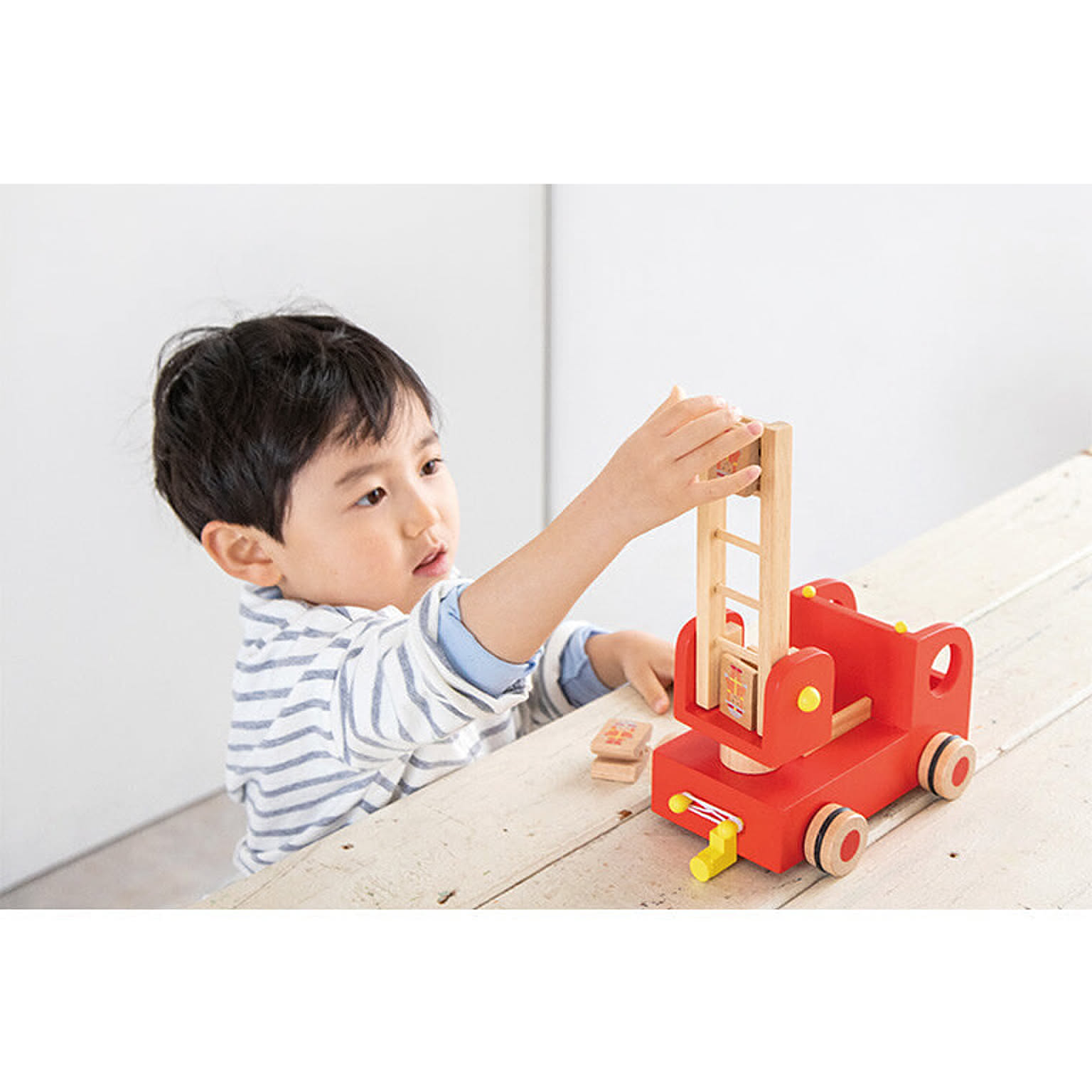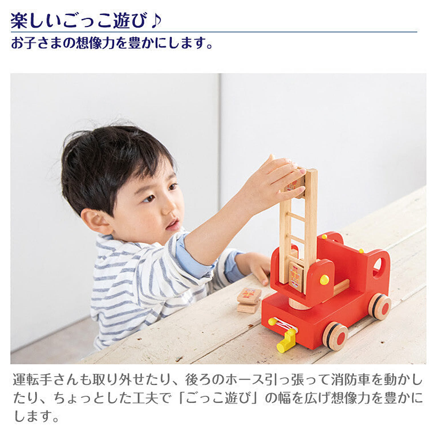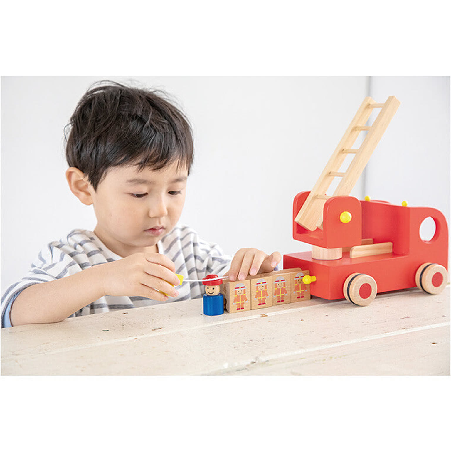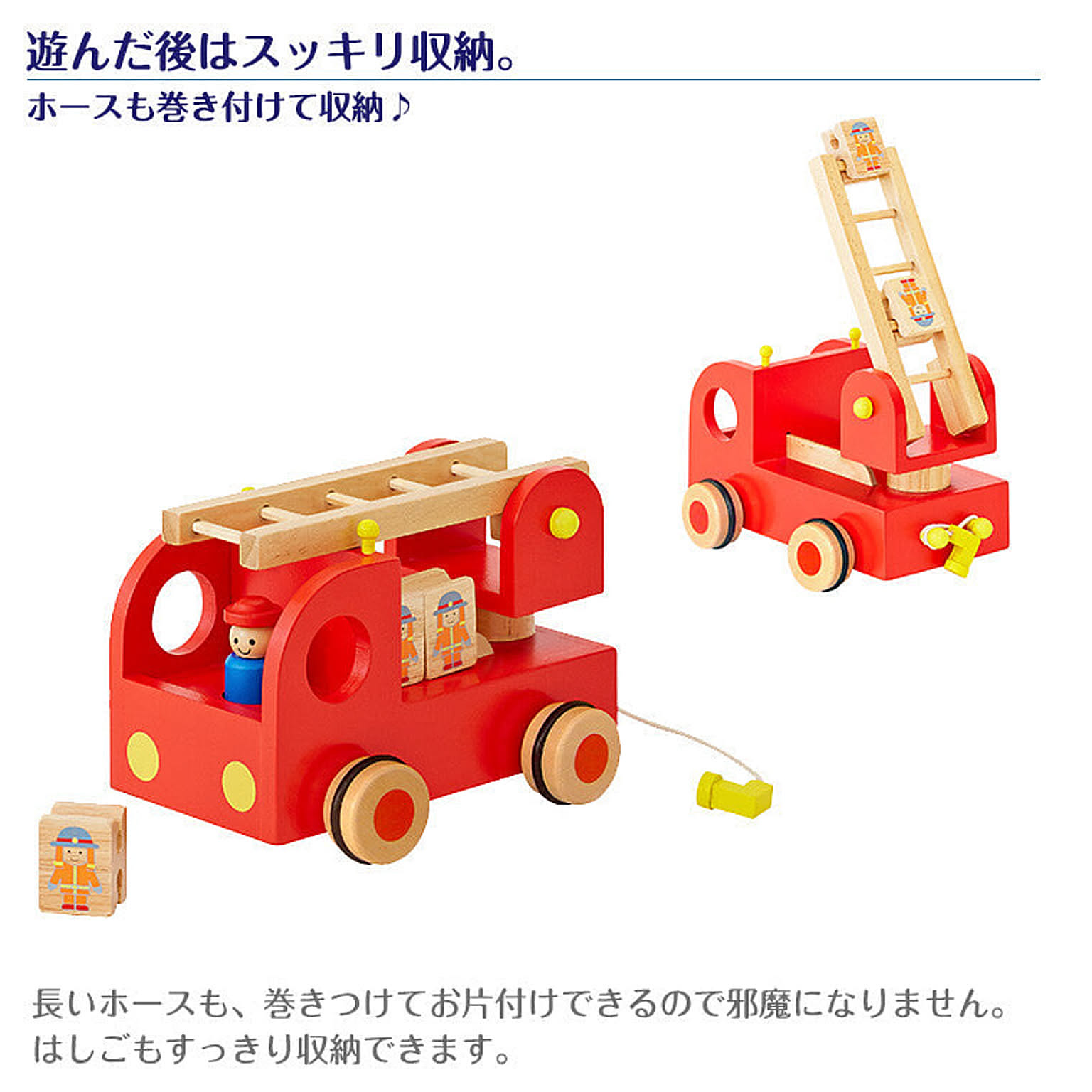 【特徴】4人の消防隊員さんをのせたはしご車。はしごを斜めに上げて、消防隊員さんをはしごの上に引っ掛けると、カタカタと回転しながら降りていきます。 はしごは角度を調整したり、360度回転します。 ドライバーさんを取りはずしたり、ホースを伸ばしたり、ごっこあそびの幅を広げます。 繰り返しあそびを通して集中力を高め想像力を広げます。 【サイズ】21.5×15×13.5cm(最少パーツ)3.0×2.5×4.0cm 【対象年齢】3歳~ 【セット内容】本体、ドライバー、消防隊員×4
