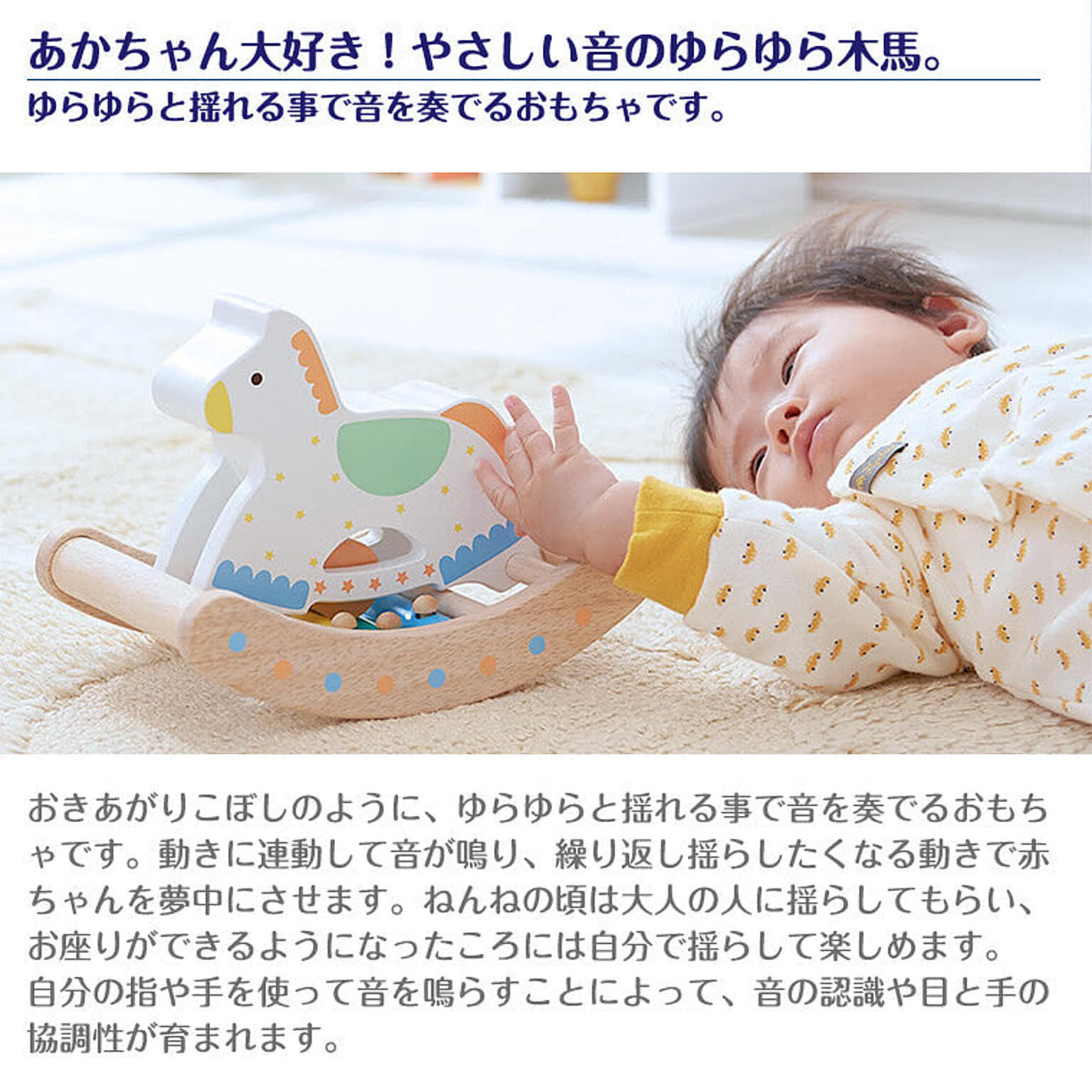 【特徴】おきあがりこぼしのように、ゆらゆらと揺れる事で音を奏でるおもちゃです。動きに連動して音が鳴り、繰り返し揺らしたくなる動きで赤ちゃんを夢中にさせます。ねんねの頃は大人の人に揺らしてもらい、お座りができるようになったころには自分で揺らして楽しめます。自分の指や手を使って音を鳴らすことによって、音の認識や目と手の協調性が育まれます。 【サイズ】22.7×14.2×16.6㎝ 【対象年齢】生後半年頃~