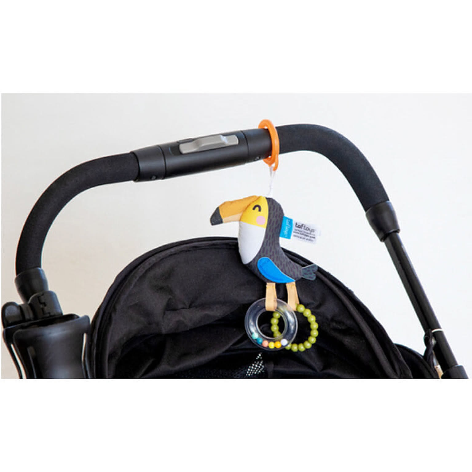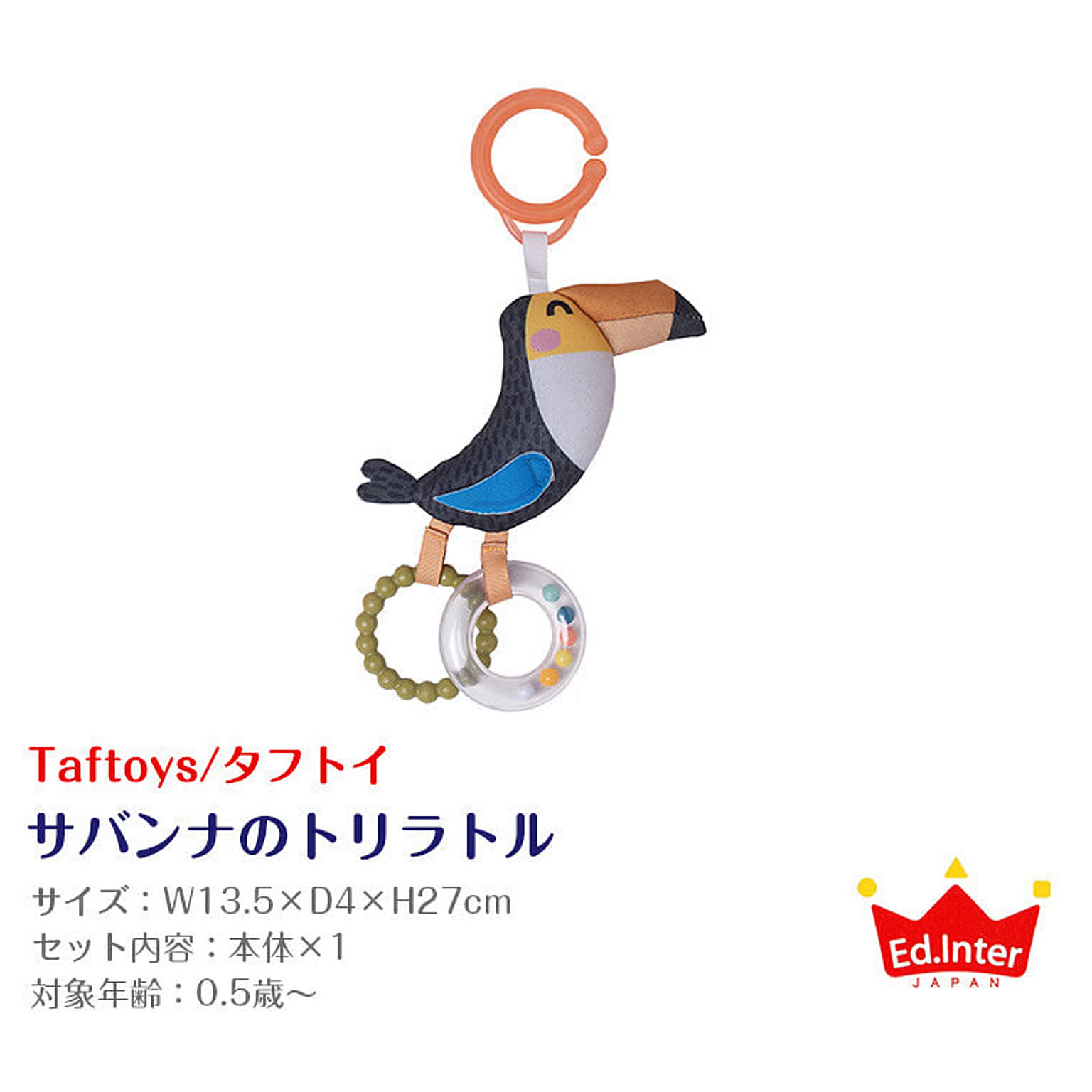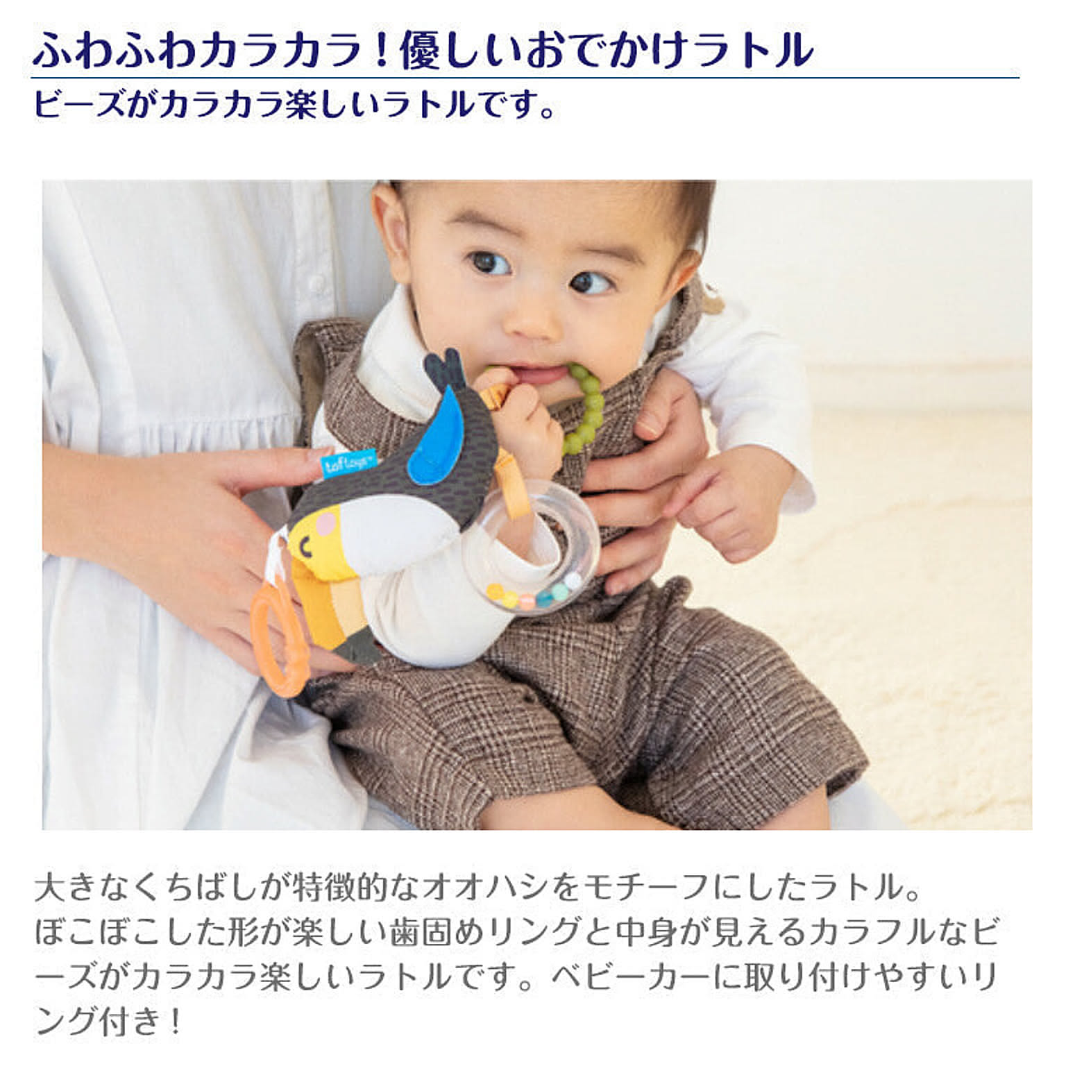 【特徴】大きなくちばしが特徴的なオオハシをモチーフにしたラトル。ぼこぼこした形が楽しい歯固めリングと中身が見えるカラフルなビーズがカラカラ楽しいラトルです。 【サイズ】W13.5×D4×H27cm 【対象年齢】0.5歳~ 【セット内容】本体×1