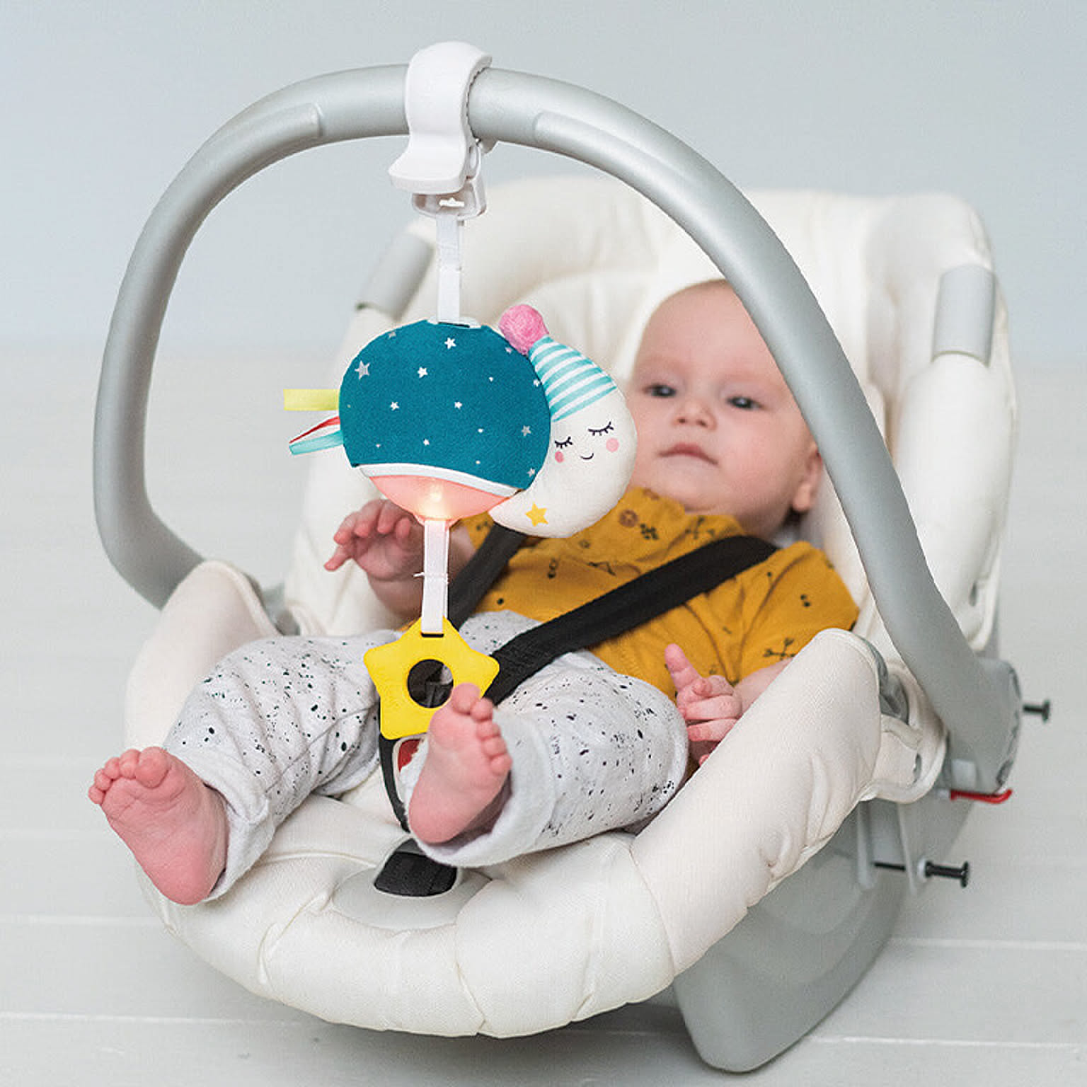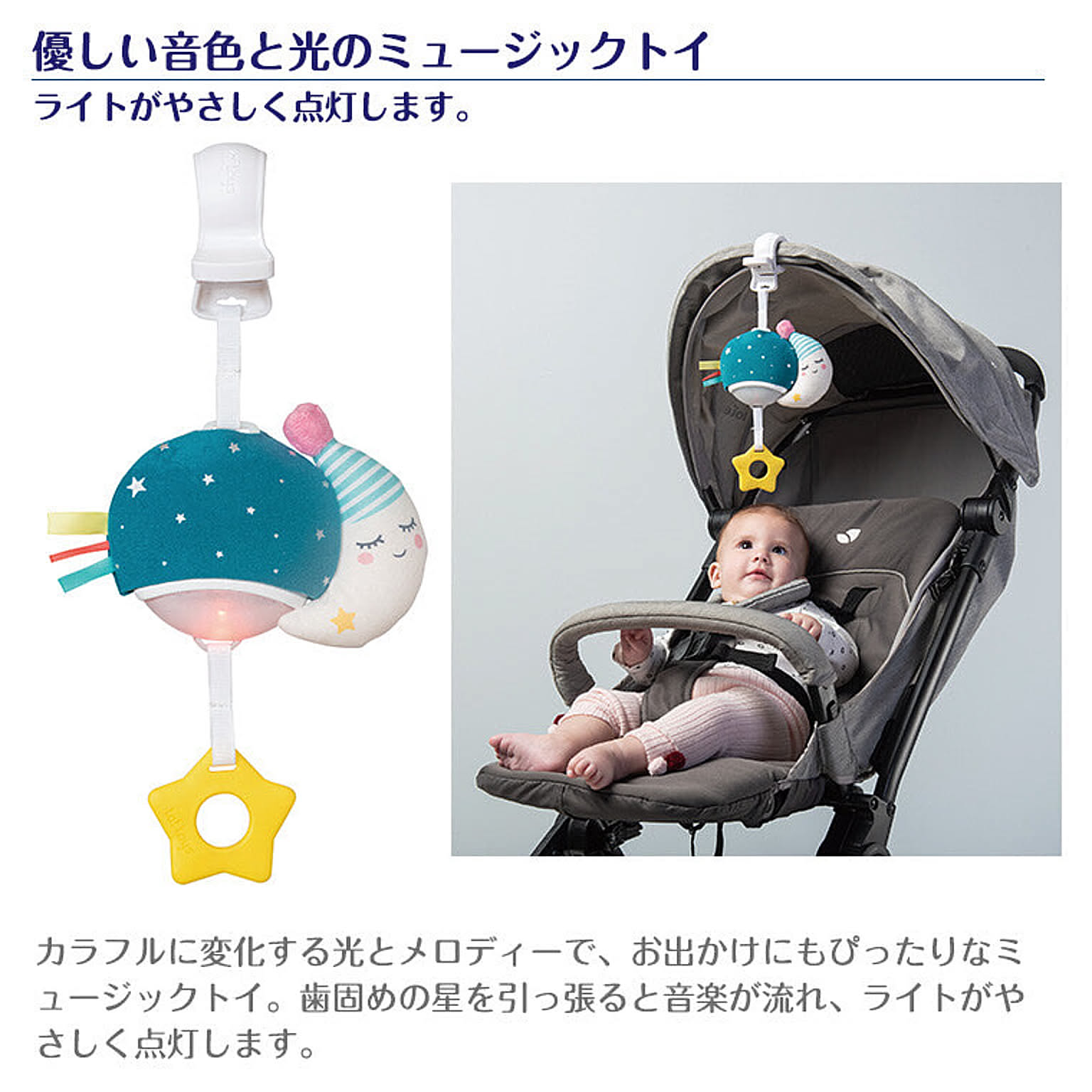 【特徴】カラフルに変化する光とメロディーで、お出かけにもぴったりなミュージックトイ。歯固めの星を引っ張ると音楽が流れ、ライトがやさしく点灯します。 【サイズ】W14×D5.2×H28.5cm 【対象年齢】0.5歳~ 【セット内容】本体×1