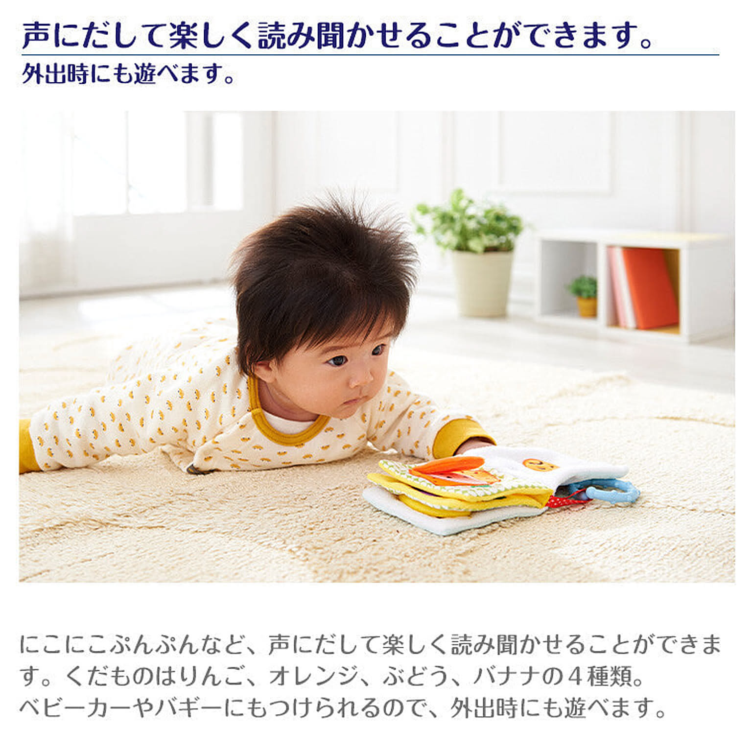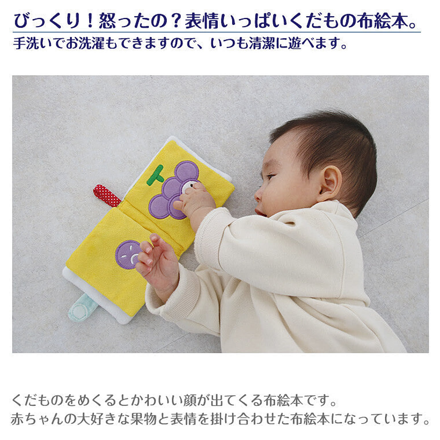 これから生まれてくる赤ちゃんのために購入しました。 初めて買った布絵本、色合いも肌触りもとても良いです!何より、めくると出てくる果物たちの表情がほんとに可愛い♡ 洗濯機OKなのも嬉しいポイントです。 ページごとに、カシャカシャしたり、プピ!と音が鳴ったり、赤ちゃんが楽しくなる仕掛けがあって、子どもに使うのが楽しみになりました♪ 対象年齢が生後半年からだったので、少し眠っていてもらって、時期が来たら活躍してもらおうと思っています。