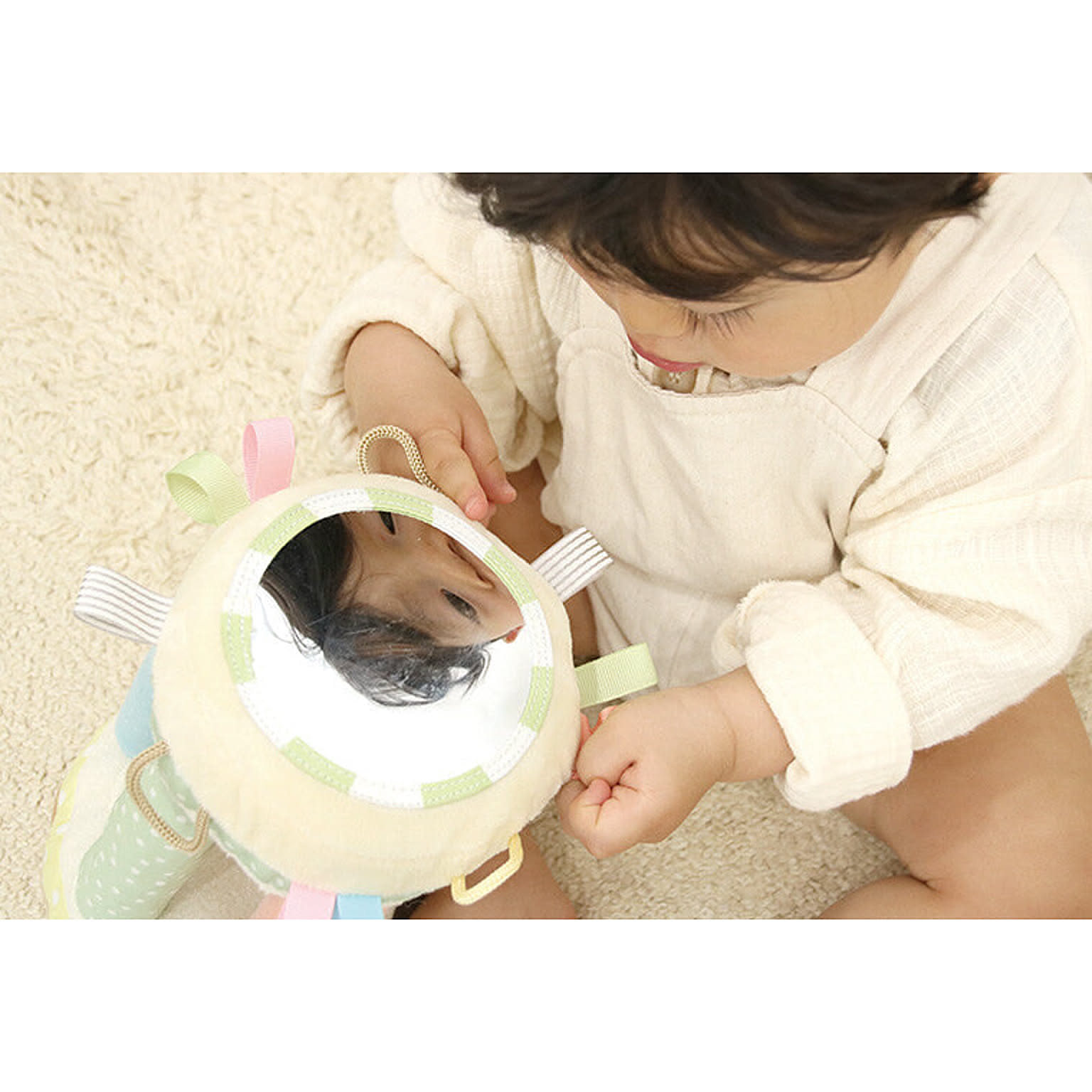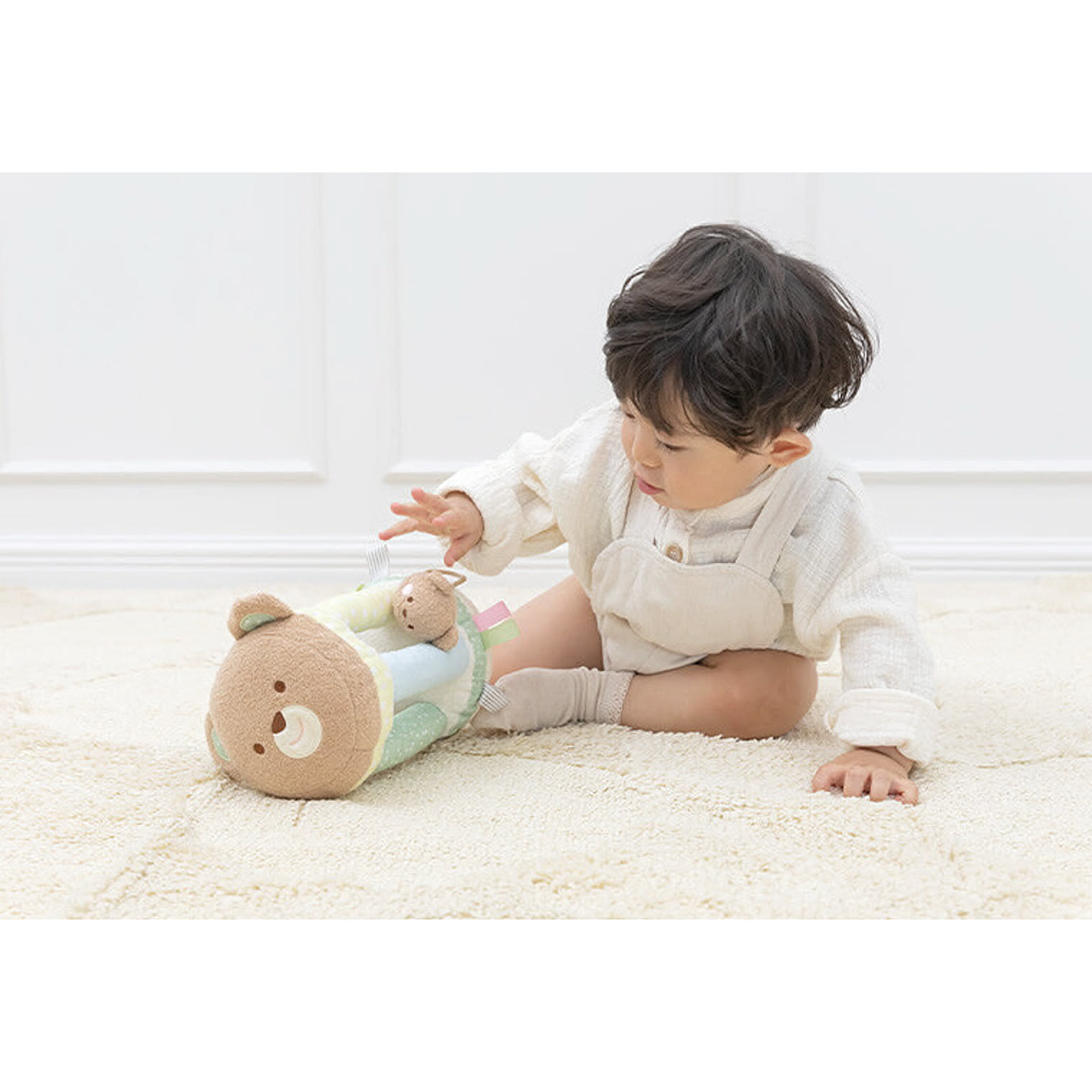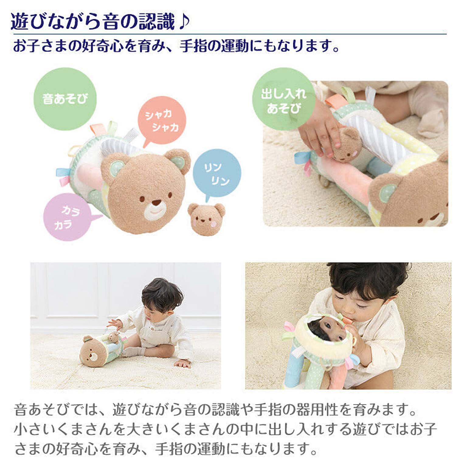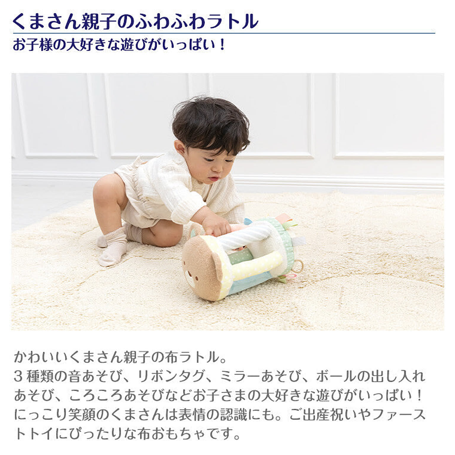【特徴】かわいいくまさん親子の布ラトル。3種類の音あそび、リボンタグ、ミラーあそび、ボールの出し入れあそび、ころころあそびなどお子さまの大好きな遊びがいっぱい!にっこり笑顔のくまさんは表情の認識にも。ご出産祝いやファーストトイにぴったりな布おもちゃです。 【サイズ】14×14×20cm(本体) 【対象年齢】0.5歳~ 【セット内容】本体、ボール×各1
