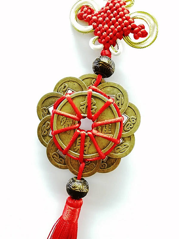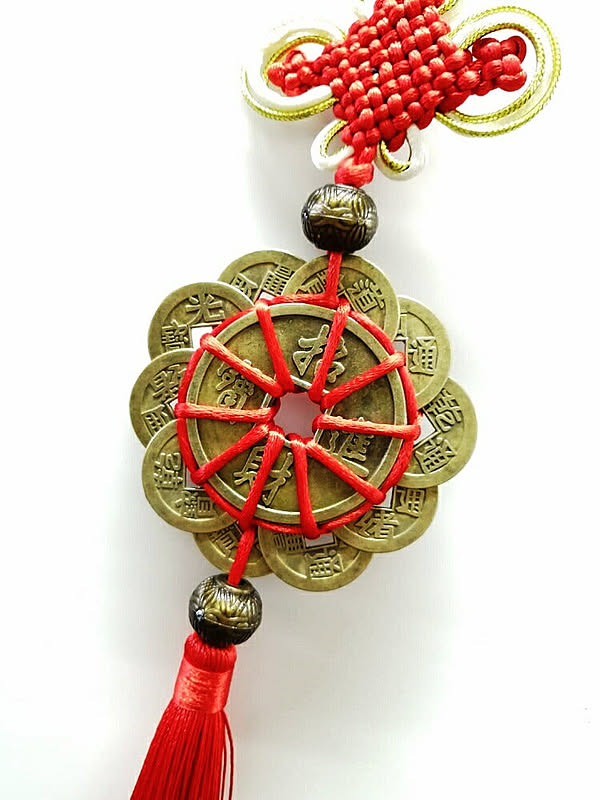 表と裏に大きな風水八卦銭が1枚ずつあり、その間に、10枚の小さな風水古銭があります。