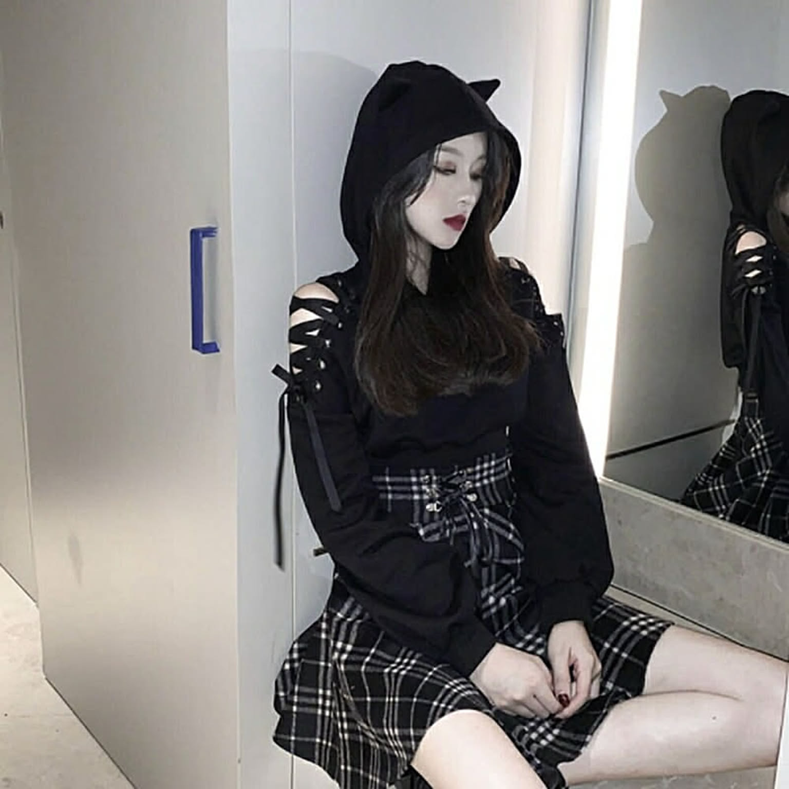 へそ出しスタイルの伸縮性のあるおしゃれで可愛い猫耳パーカートップスです