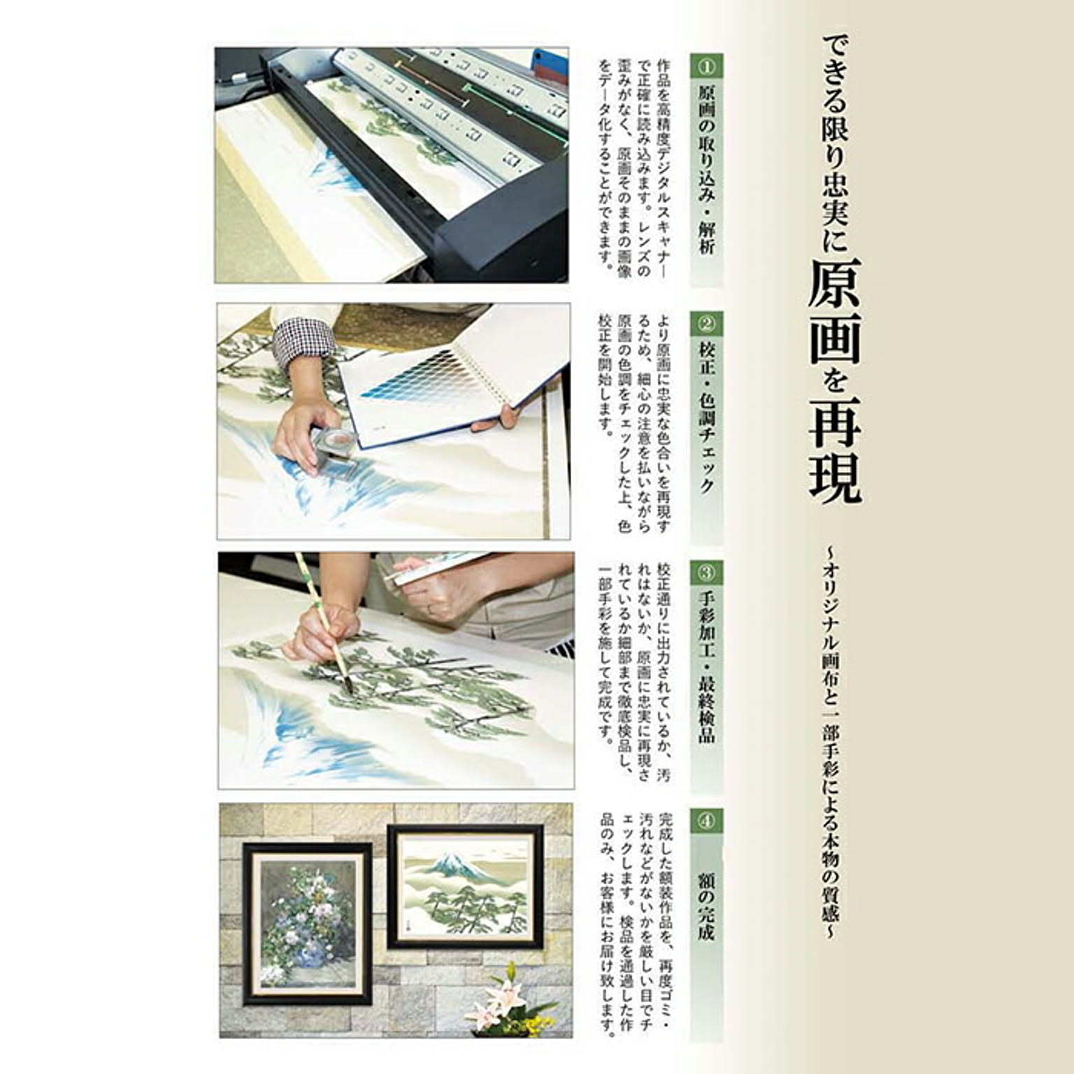 有名美術館がレプリカを制作するため採用している最先端ジグレ版画技法で特製新絹本画布に表現し、最終仕上げは手彩による補色が加えられ、リアル感を醸し出しています。時間がたっても色調が変化しにくく、美しさが変わりません。