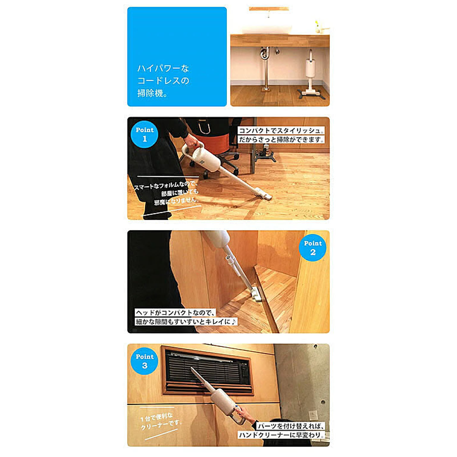 使うときも使わないときも、たたずまいの美しいクリーナーができました。 立たせたまま置いておけるフロアスタンドも付属しますので、 使わない時も邪魔にならず、インテリアに調和するデザインです。 コードレスクリーナーの弱点であった吸引力に着目、しっかり吸引できるハイパワー90W仕様。 軽量で長寿命、充電時の劣化が少ないリチウムイオンバッテリー搭載。 標準で約1時間の連続運転が可能なので、隅々まですっきりお掃除できます。