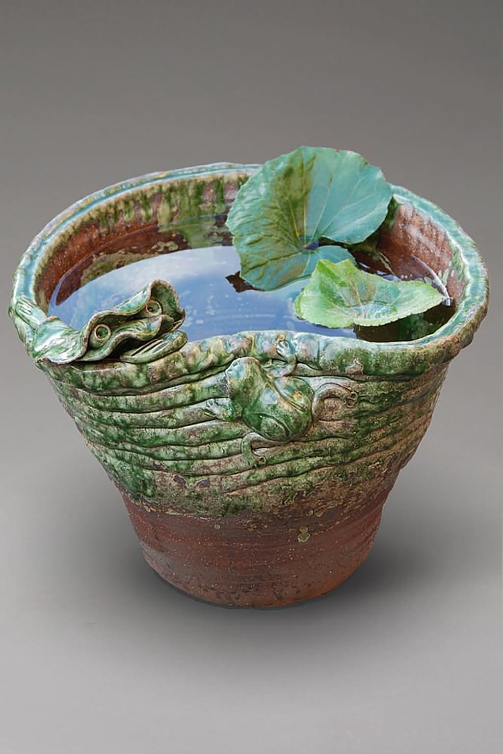 信楽特有の土味を発揮して、登窯、窖窯の焼成によって得られる温かみのある火色(緋色)の発色と自然釉によるビードロ釉と焦げの味わいに特色づけられ、土と炎が織りなす芸術として“わびさび”の趣を今に伝えている。