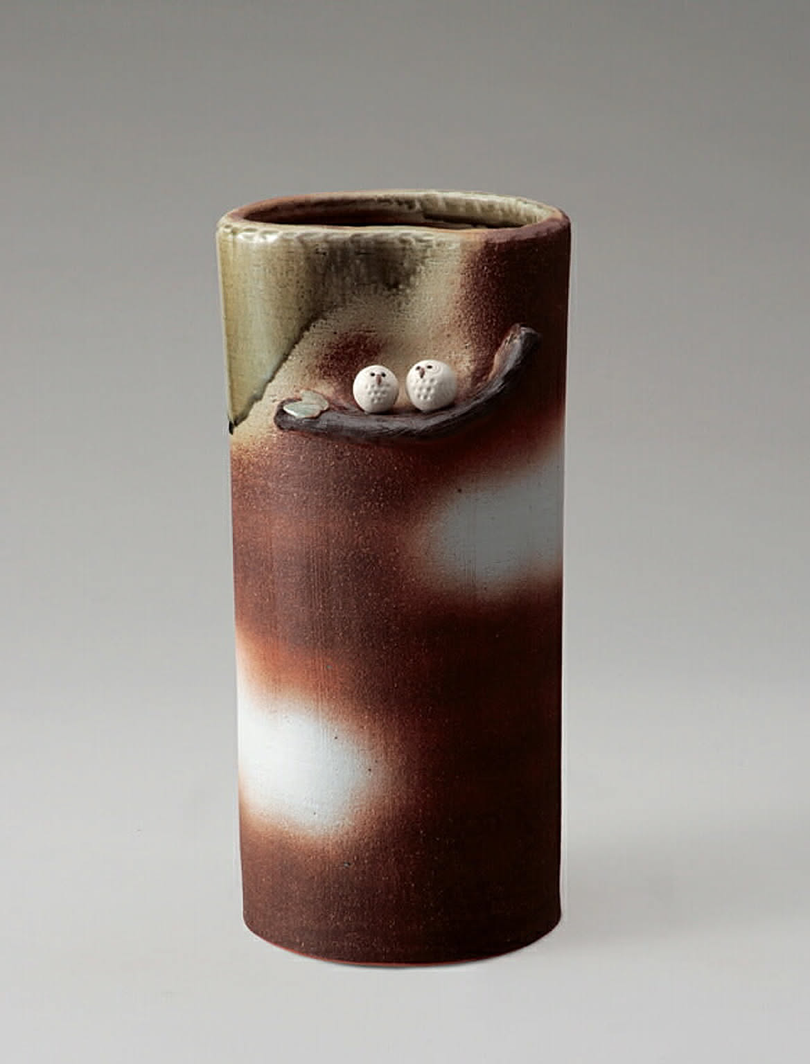 信楽特有の土味を発揮して、登窯、窖窯の焼成によって得られる温かみのある火色(緋色)の発色と自然釉によるビードロ釉と焦げの味わいに特色づけられ、土と炎が織りなす芸術として“わびさび”の趣を今に伝えている。
