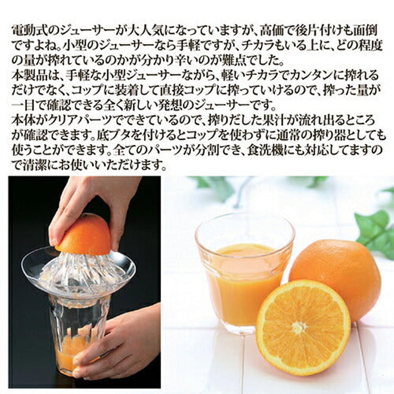 電動式のジューサーが大人気になっていますが、高価で後片付けも面倒ですよね。小型のジューサーなら手軽ですが、チカラもいる上に、どの程度の量が搾れているのかが分かり辛いのが難点でした。本製品は、手軽な小型ジューサーながら、軽いチカラでカンタンに搾れるだけでなく、コップに装着して直接コップに搾っていけるので、搾った量が一目で確認できる全く新しい発想のジューサーです。本体がクリアパーツでできているので、搾りだした果汁が流れ出るところが確認できます。底ブタを付けるとコップを使わずに通常の搾り器としても使うことができます。全てのパーツが分割でき、食洗機にも対応してますので清潔にお使いいただけます。●サイズ:約幅15×奥行14.5×高さ10cm