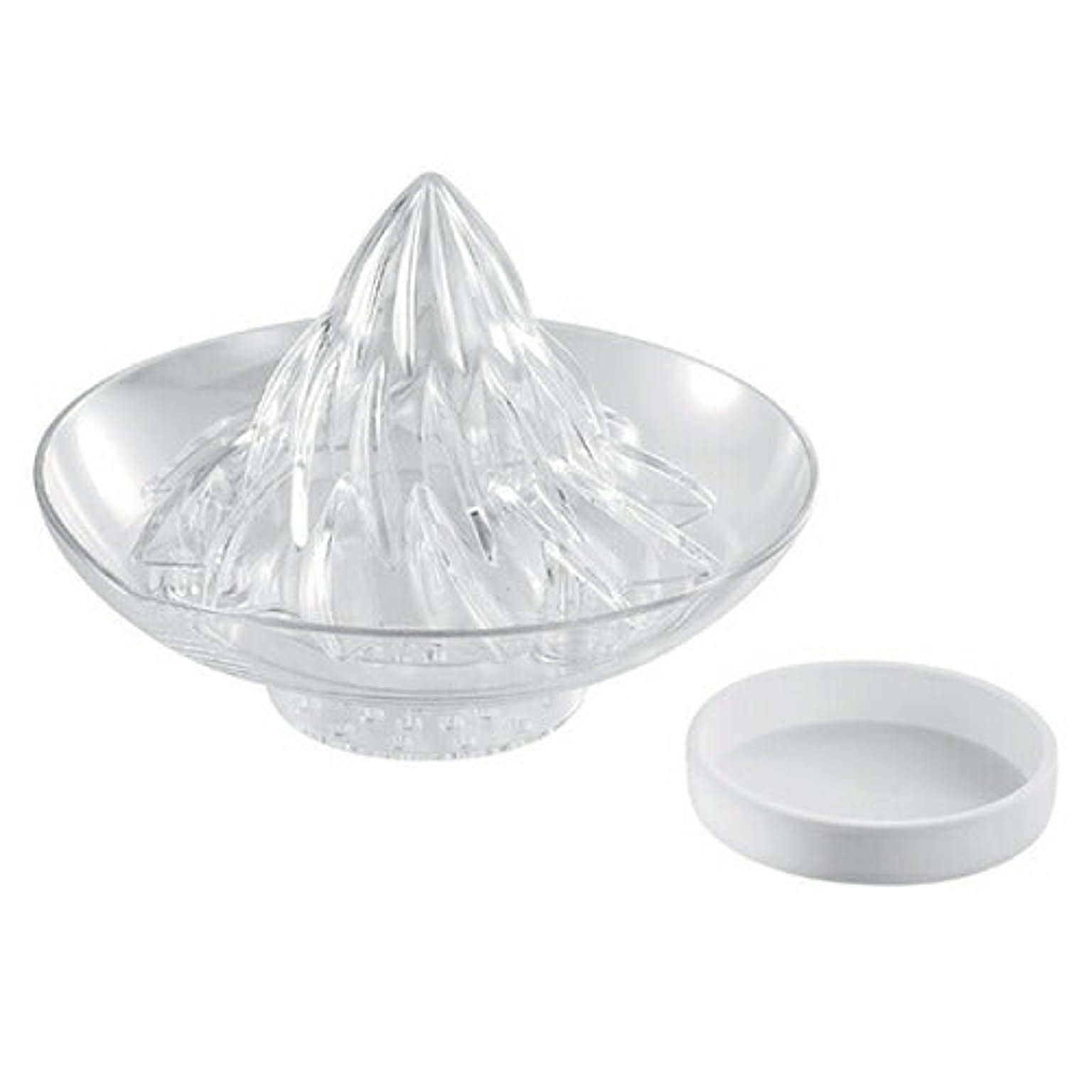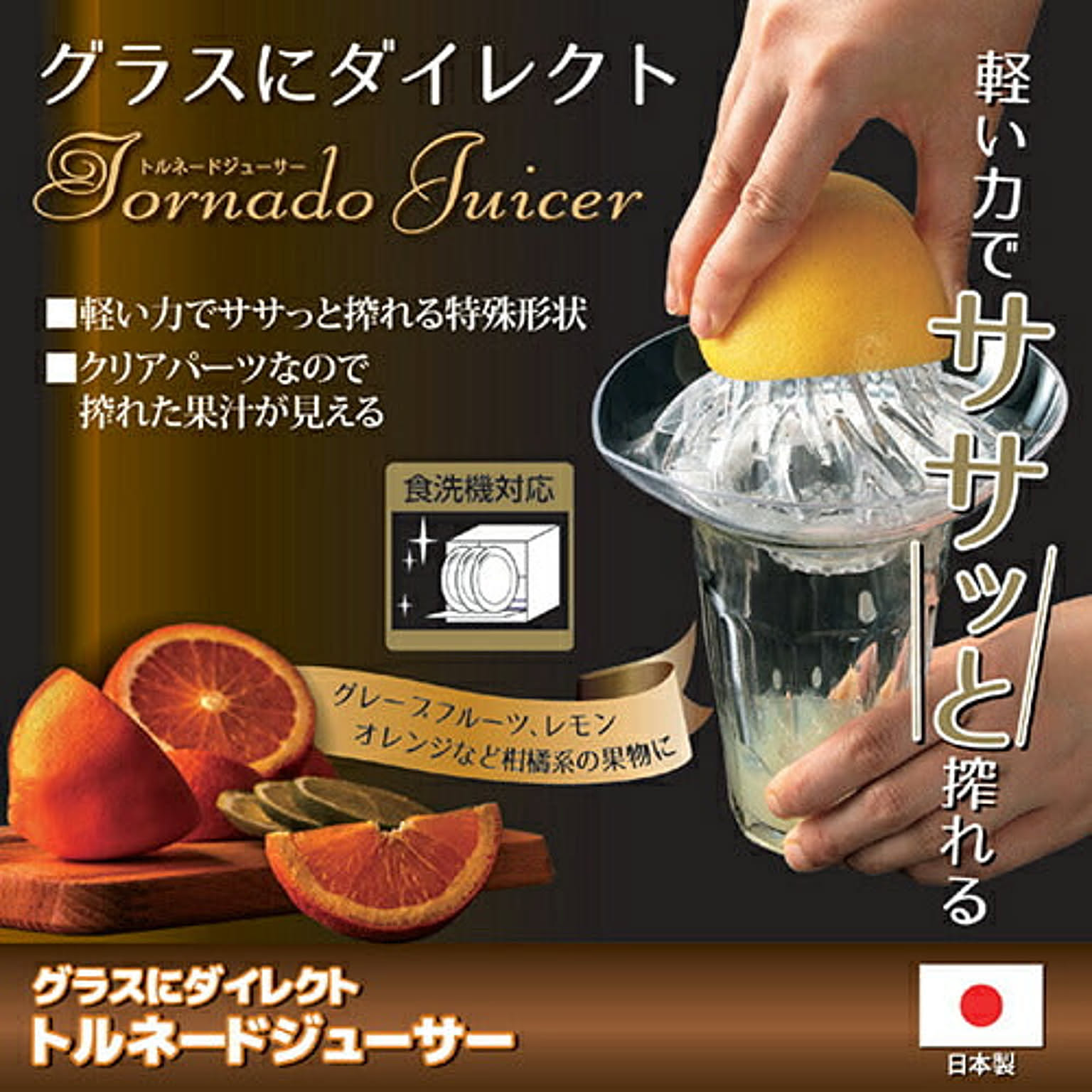 グラスに乗せたままでも搾れる新感覚ジューサー●軽い力でササっと搾れる特殊形状●クリアパーツなので搾れた果汁が見える