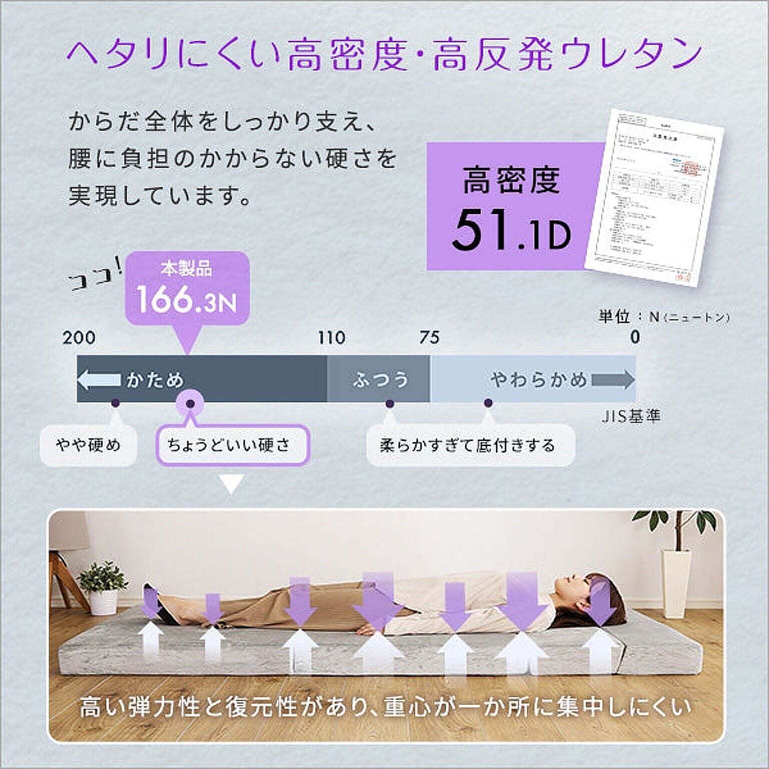 ・ヘタリにくい高密度・高反発ウレタン使用。からだ全体をしっかり支え、腰に負担のかからない硬さを実現しています。