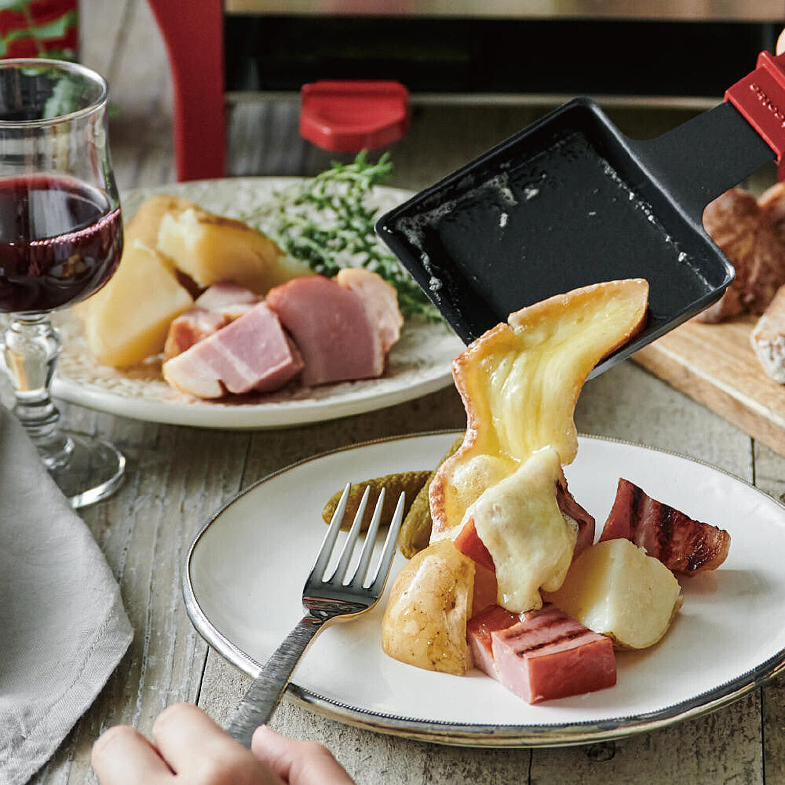 焼きあがった食材に溶けたチーズをかけて♪レストランでおなじみのラクレットを自宅で堪能。付属のココットを使って、これ1台でチーズフォンデュも!