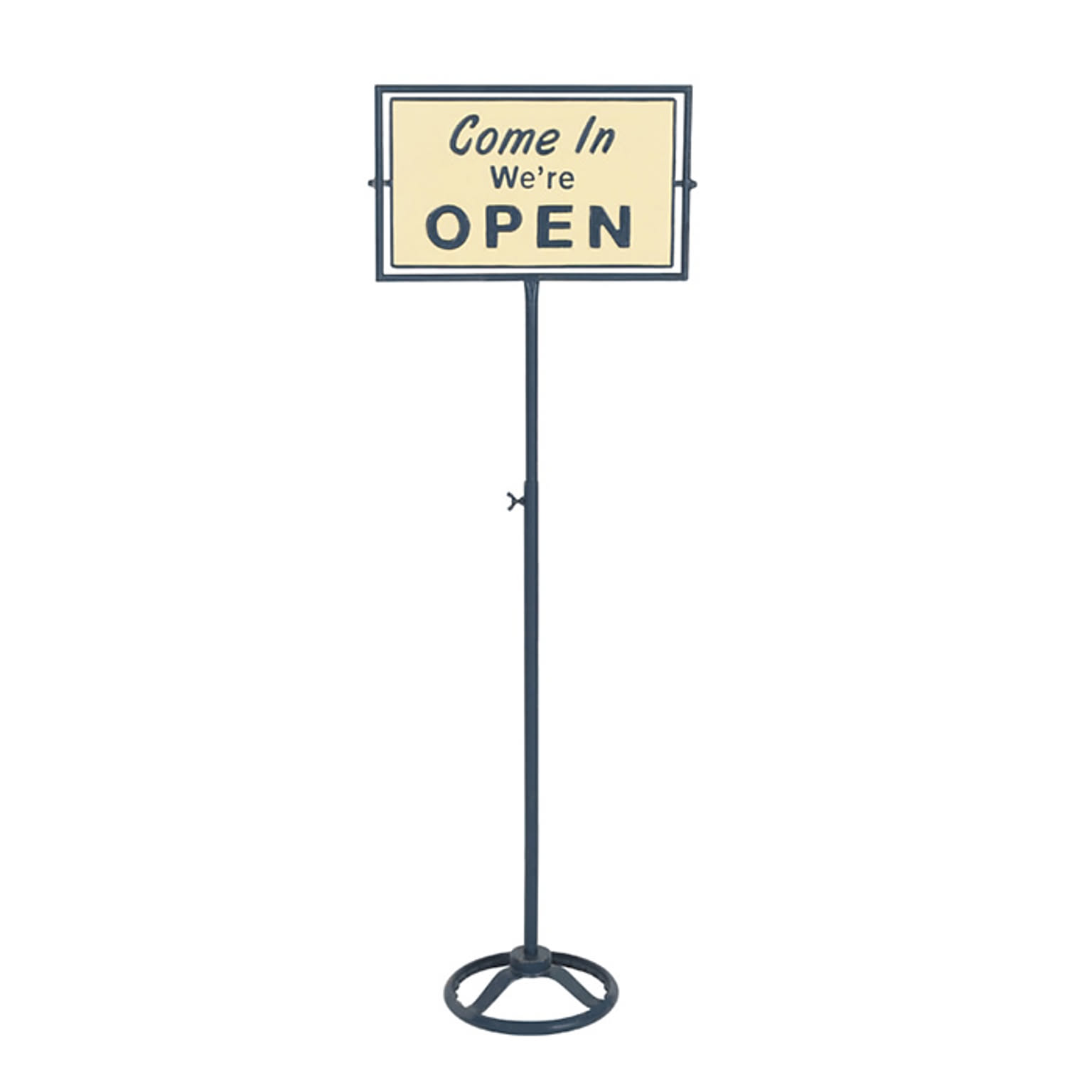 慌てて店仕舞いをした店主が、くるくるっとサインを回して家路に急ぐ。海外の古い映画のような光景が描けるサインスタンド。看板部分を回転させることで、“OPEN”、“CLOSE”が切り替わります。程よくレトロな佇まいと、親しみやすいフォント、選べるカラーに、こだわり屋の店主も納得です。ソフトな印象のネイビー。
