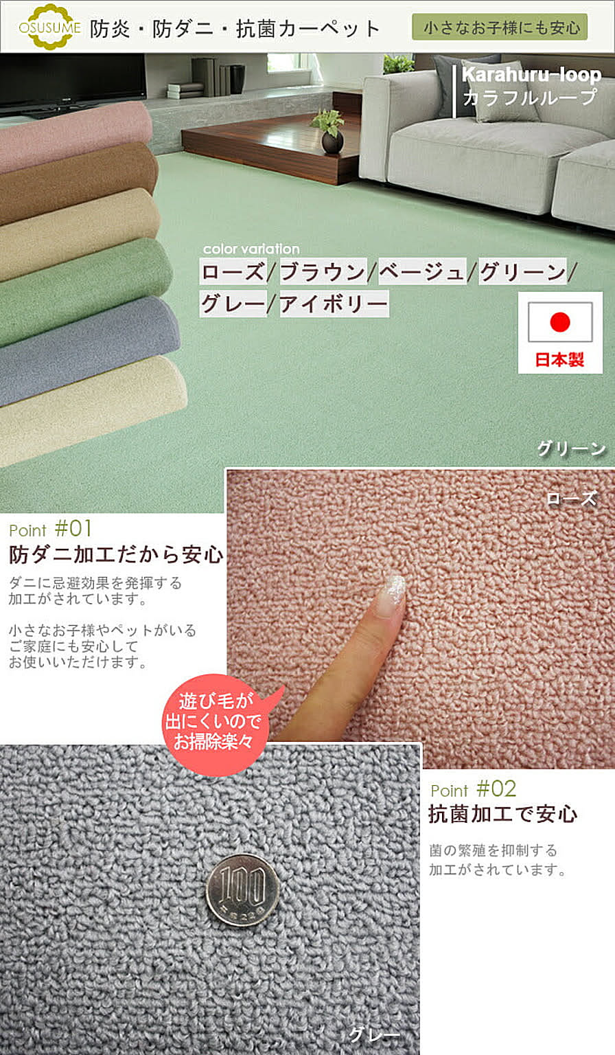 明るめの色と柔らかい肌触りが好評なループタイプの日本製カーペットです。