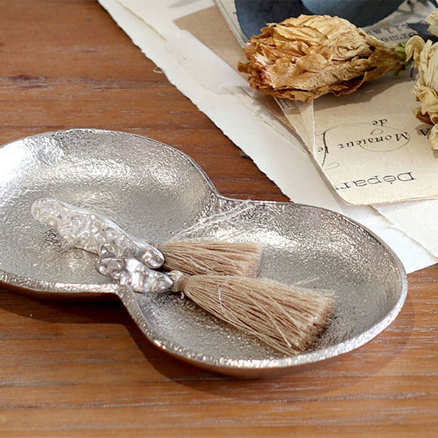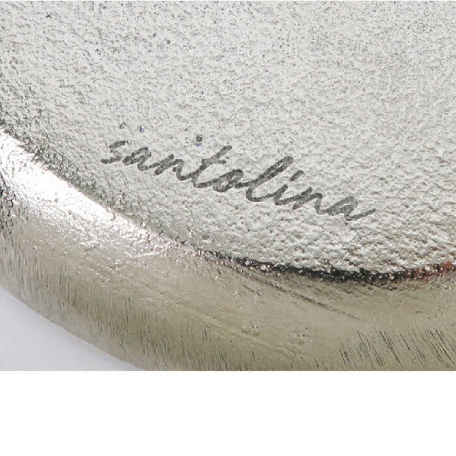 アルミ本来のシルバー色を活かしたハンドメイドのアルミトレイ。アクセサリーや鍵、ステーショナリーなどの収納に。デスクにあると便利なアイテムです。形が歪なところや、表面の凹凸の個体差など、多様な表情が魅力のひとつ。アンティークな風合いがデスクに置いてあるだけで雰囲気をグッと引き締めてくれますよ。ダブルトレイは小さめのアクセサリーなどの収納におすすめのサイズ感。同じシリーズのサイズ違いで並べても◎裏面には「santolina」のロゴが刻印されています。製品仕様サイズ約 W125×d65×h12mm素材アルミ重量約53g原産国インド備考1点1点手作り商品のため、商品に若干の傷がある場合がございます。小傷、塗装ムラのある商品が含まれます。ご了承ください。
