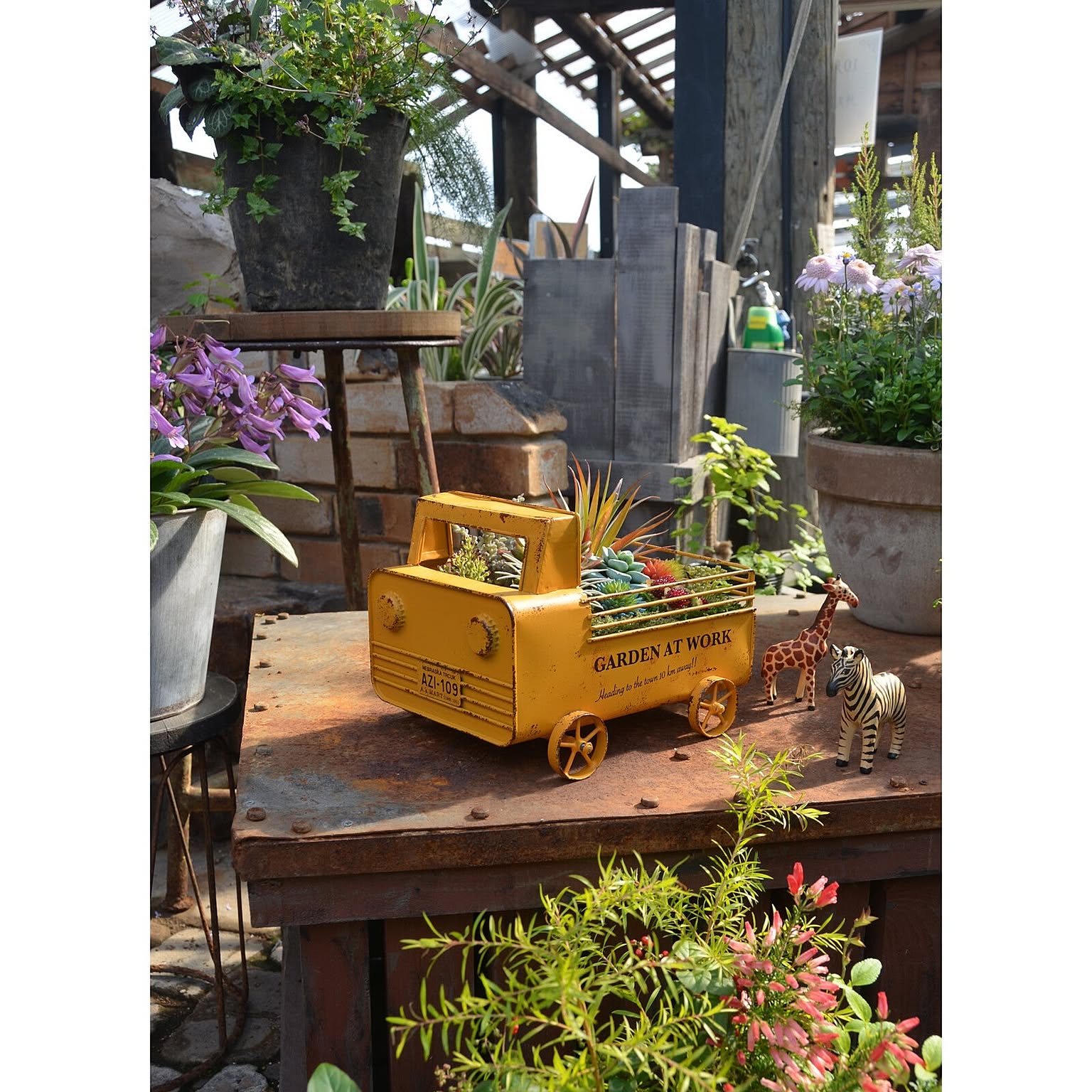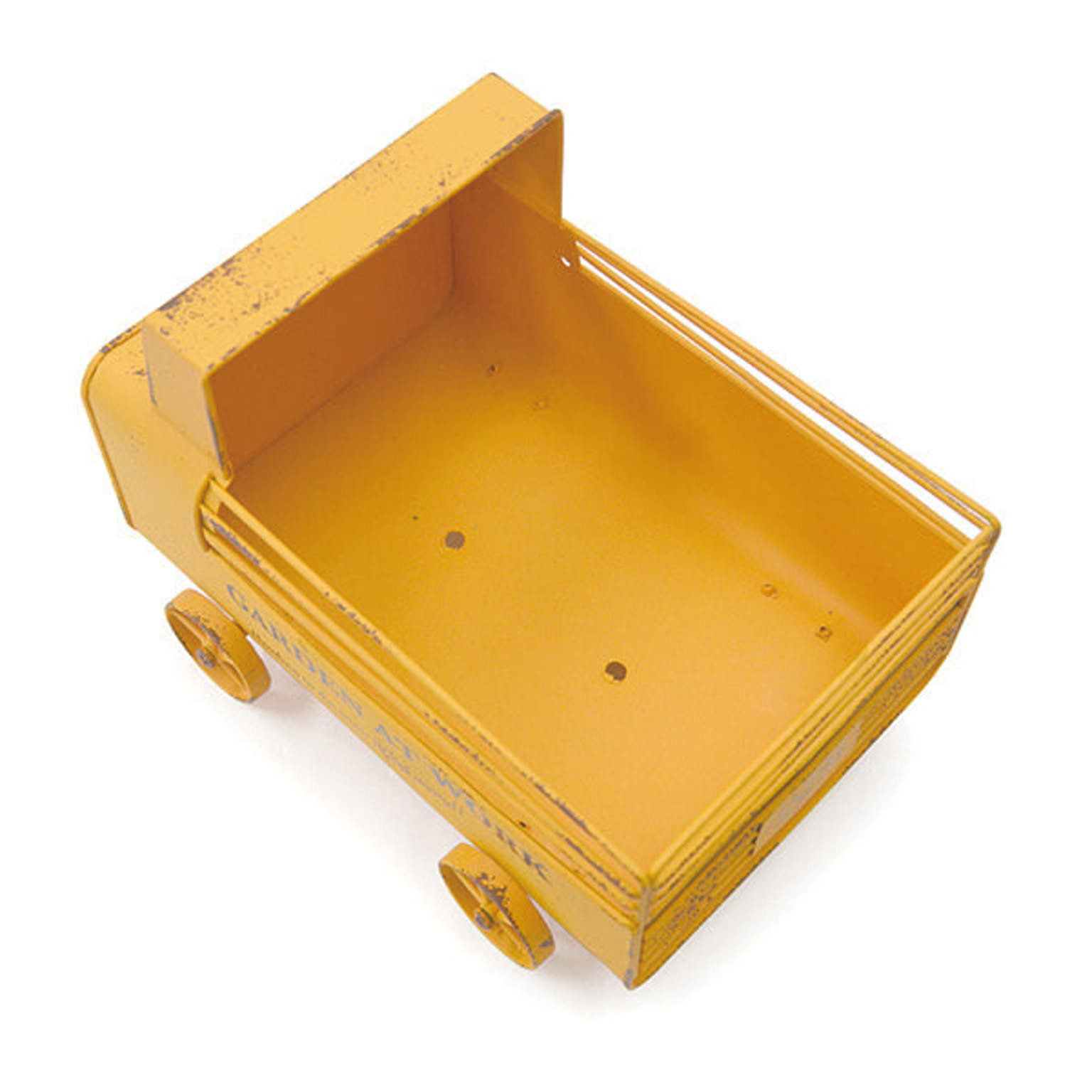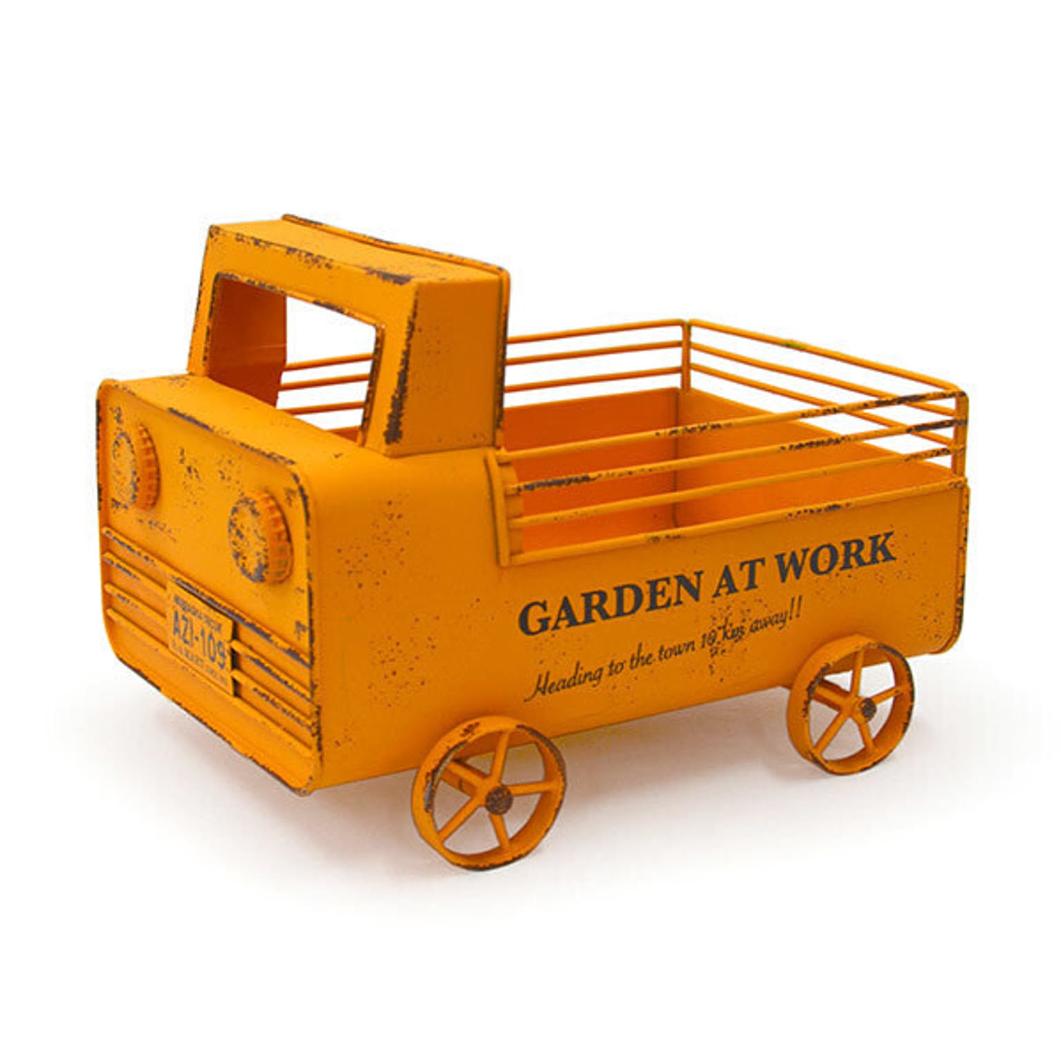 鮮やかな黄色が映える軽トラ型のユニークなプランター。 オイル缶をカットした本体部分に、ライト部分はボトルの王冠を使用等、リメイクの 良さを追求したこだわりのデザインとなっております。 要所要所に見える塗装の剥げた感じで自慢のアンティーク風加工も忘れずに。 細かな手作業が垣間見える柵の部分もしっかりとしたスチール製で職人が一つ一つ溶接しています。