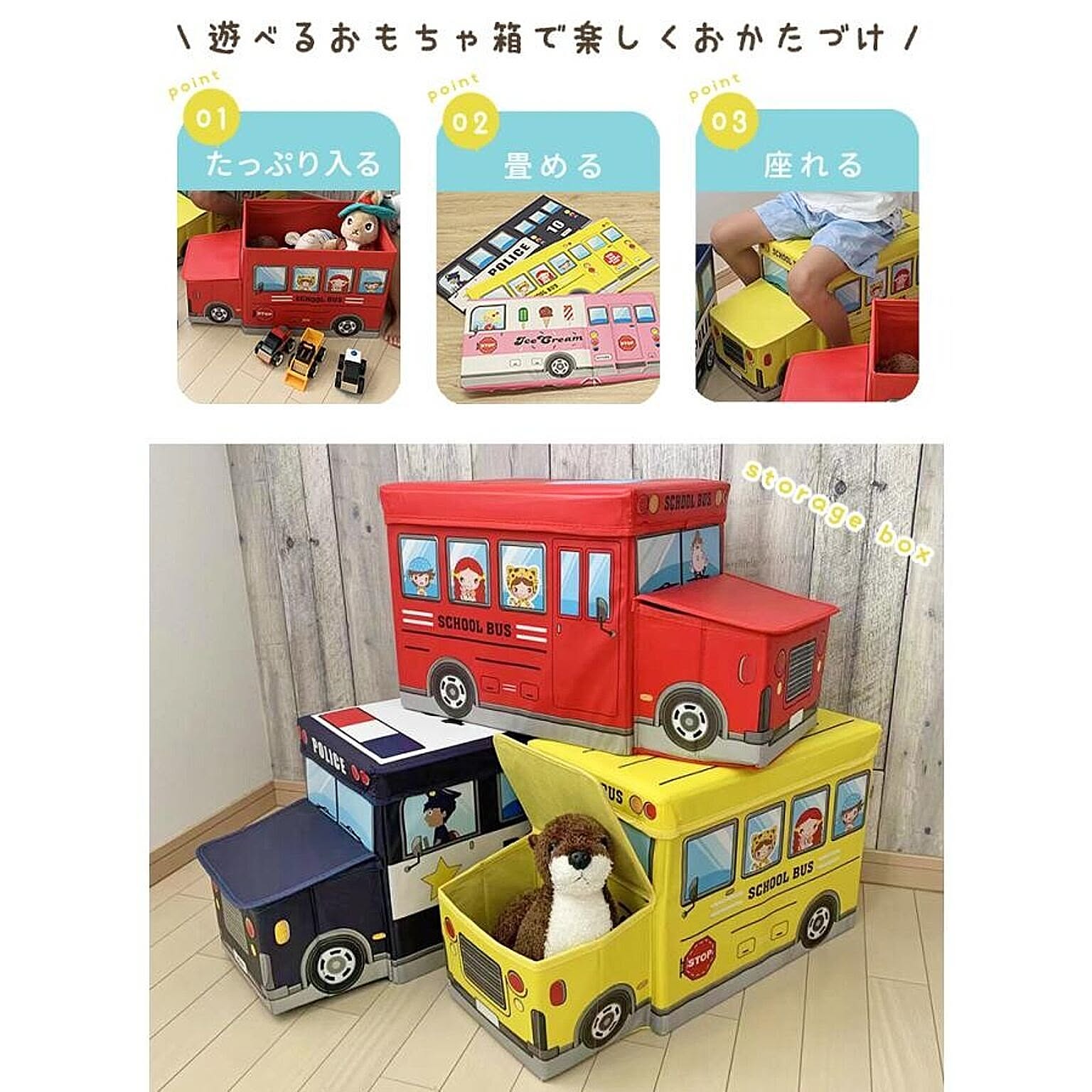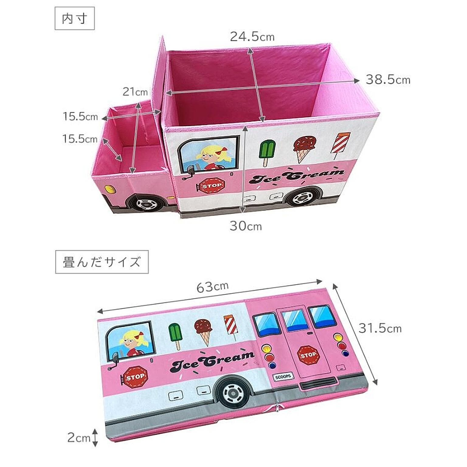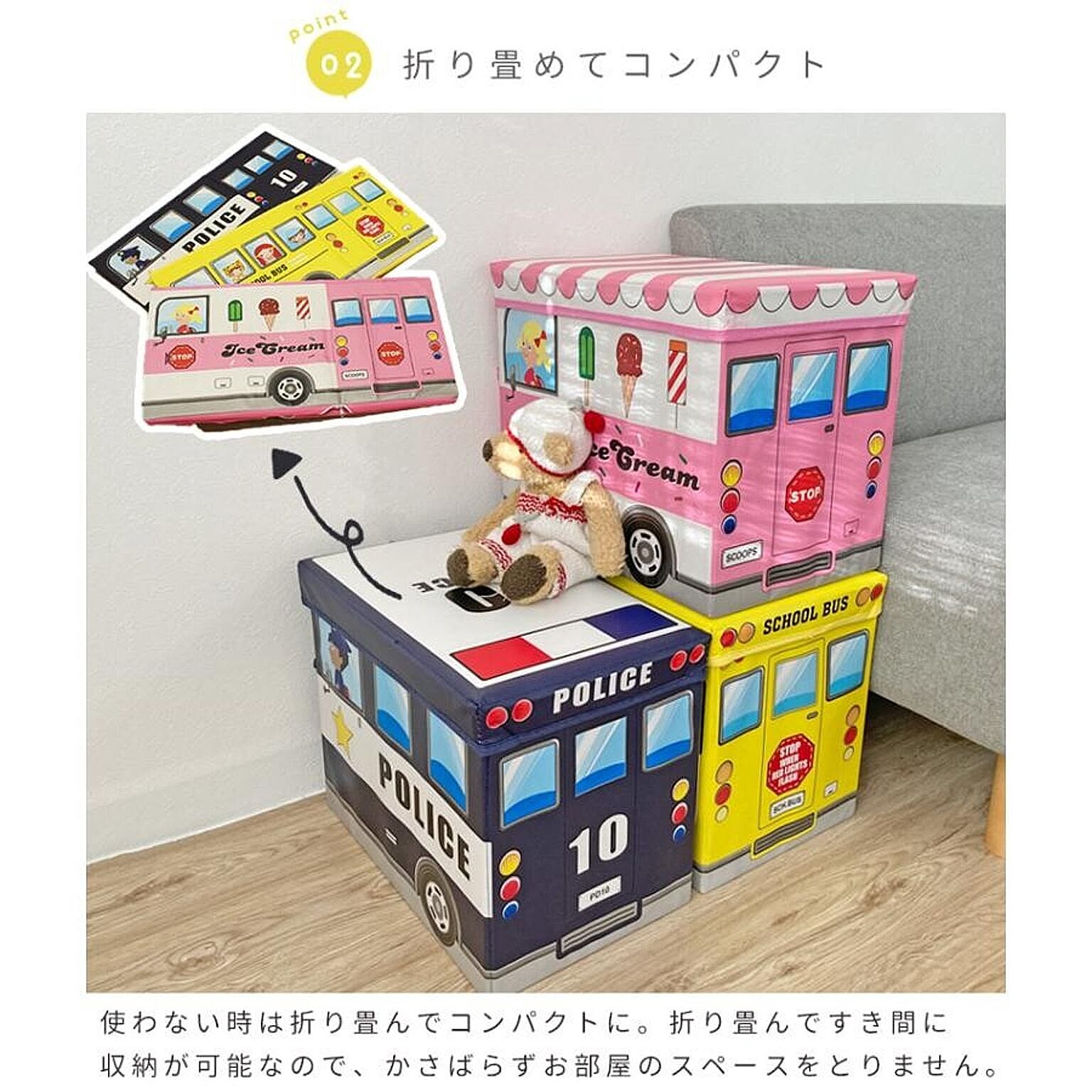 遊べるおもちゃ箱で楽しみながらお片付け サイズ:約57×27×31cm 【ふた】 外側:ポリエステル 中材:MDF 内側:不織布 【本体】 外側:ポリエステル 中材:MDF 内側:不織布 重量 約1.35kg 耐荷重 約60kg 製造国 中国製 収納 スツール ベンチ BOXスツール おもちゃ ソファー イス おもちゃボックス 送料無料 ポリス 警察 バス アイスクリーム 遊べる 折り畳み 黄色 青 紺 ピンク かわいい おもちゃ入れ 収納ボックス おもちゃ収納