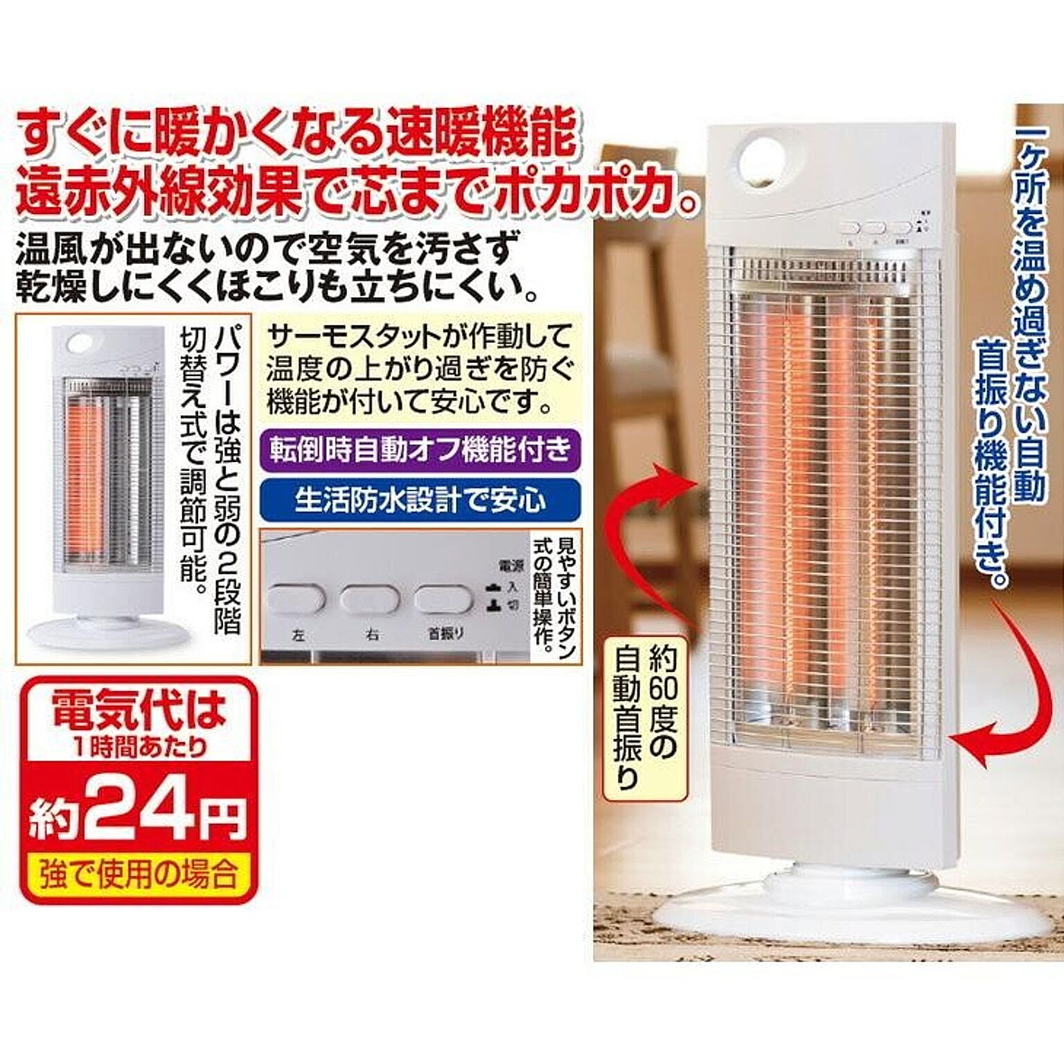 体すぐに暖かくなる速暖機能遠赤外線効果で芯までポカポカ。 温風が出ないので空気を汚さず乾燥しにくくほこりも立ちにくい。 一ヶ所を温め過ぎない自動首振り機能付き。 約60度の自動首振り。 サーモスタットが作動して温度の上がり過ぎを防ぐ機能が付いて安心です。 パワーは強と弱の2段階切替え式で調節可能。 転倒時自動オフ機能付き。 生活防水設計で安心。 見やすいボタン式の簡単操作。