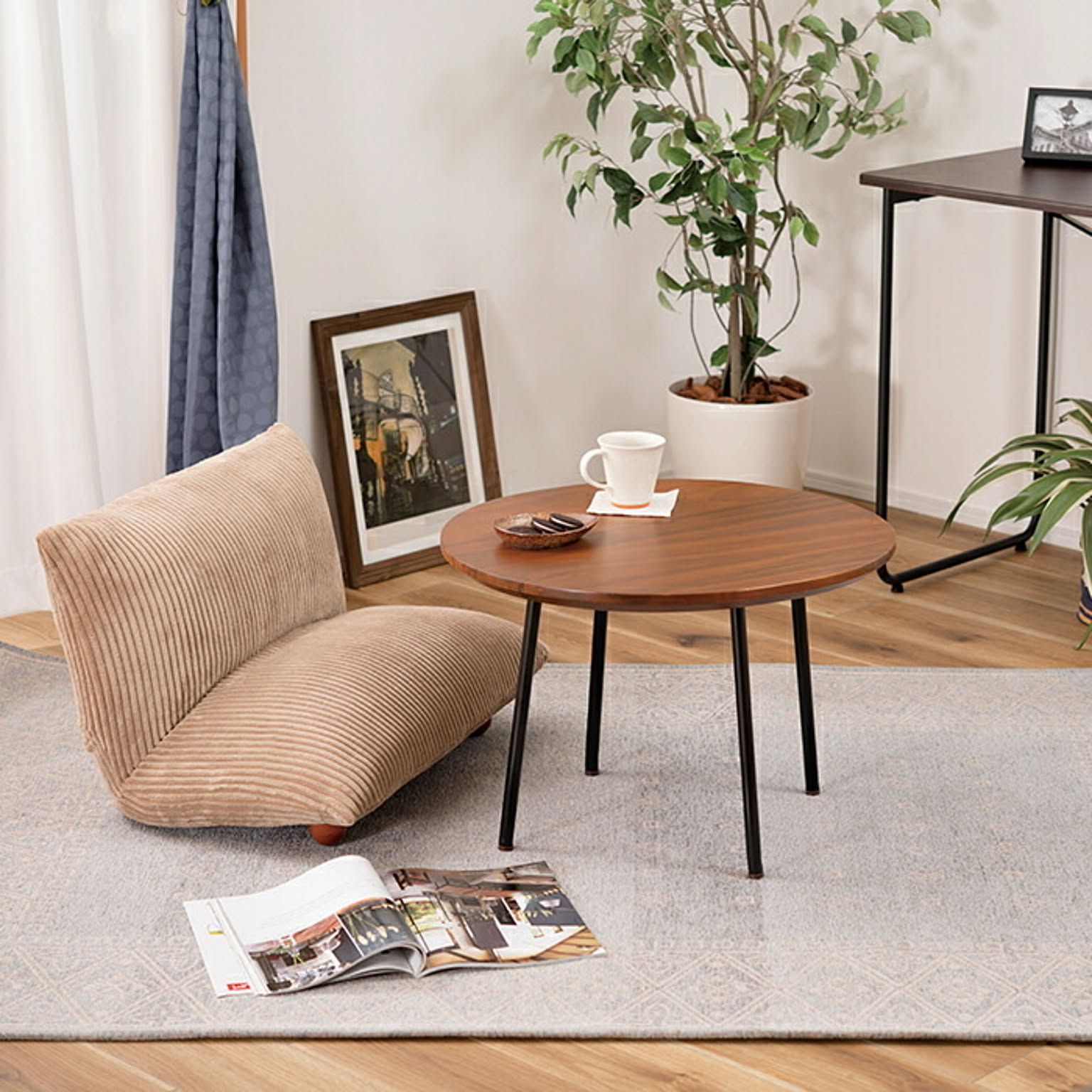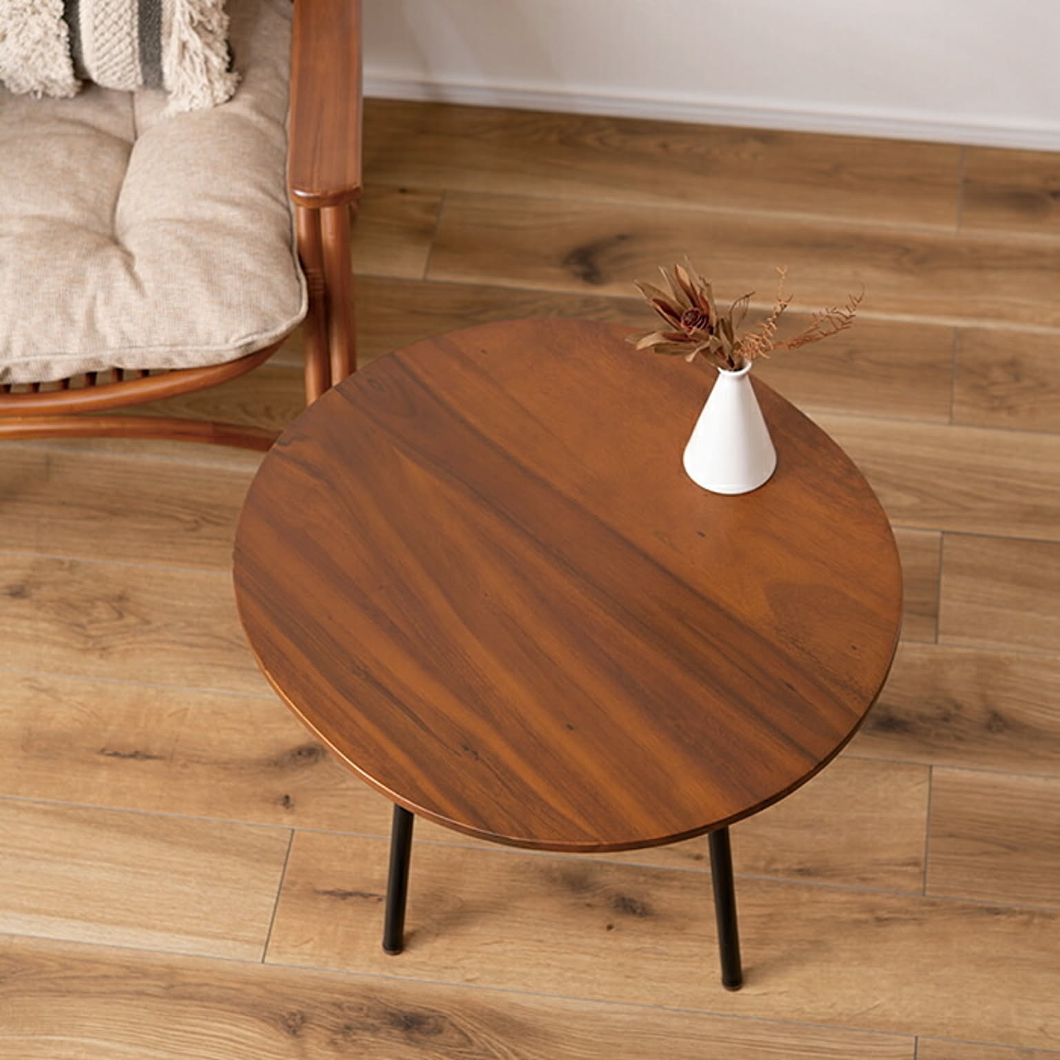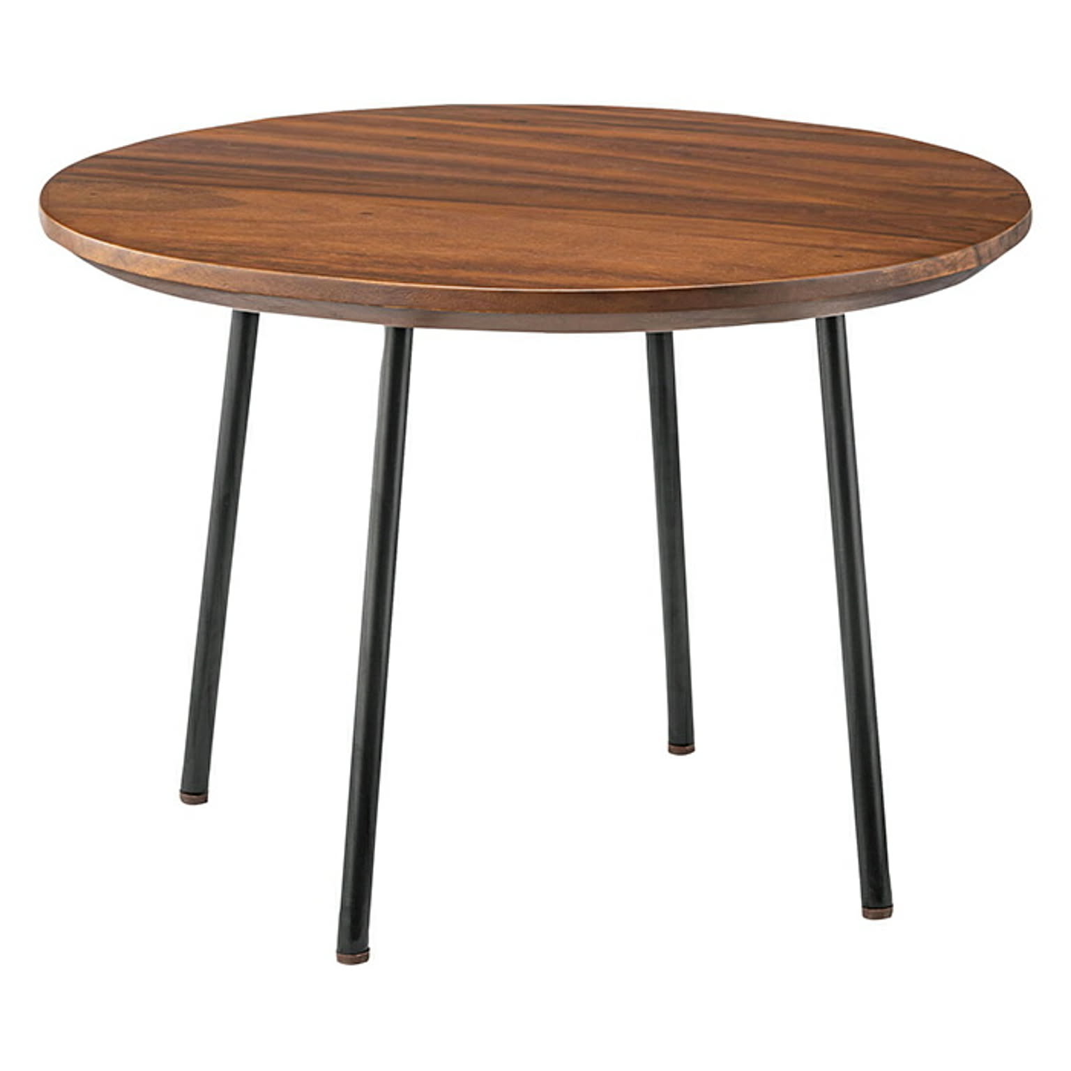 ひとつひとつ違う木の表情を活かした個性的な天板と細身でシャープなスチール脚とのバランスが、シンプルで使いやすいテーブルです。天板は正円ではなく、切り株のような素朴なラインに仕上げ、個性をより演出します。