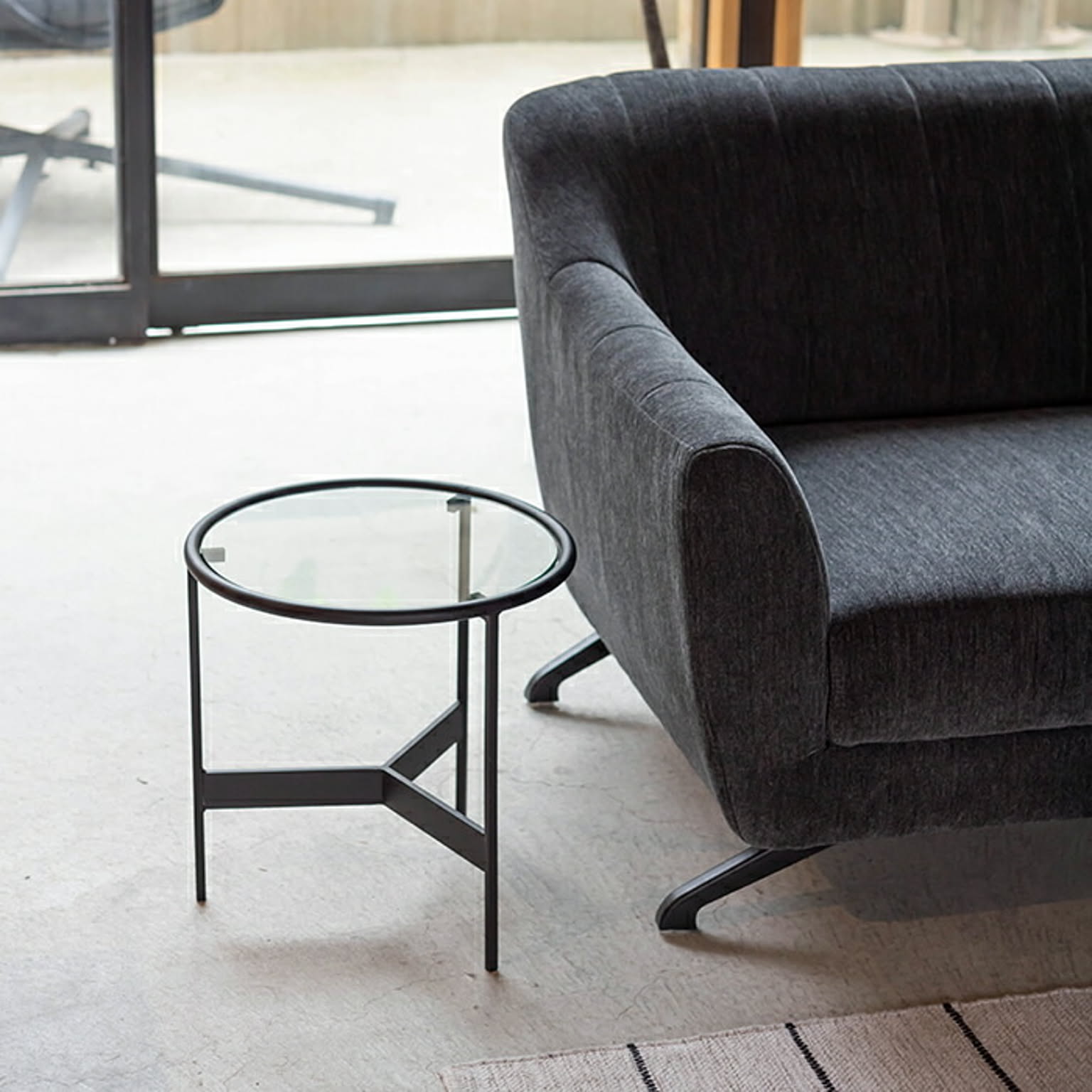 シンプルでスタイリッシュなガラステーブル。マットなブラックアイアンの滑らかな曲線とハードなガラスを組み合わせたローテーブル。脚部は10mm角のシャープなラインが際立ち、透明なガラス天板との組み合わせは圧迫感の無い開放的な空間を演出します。