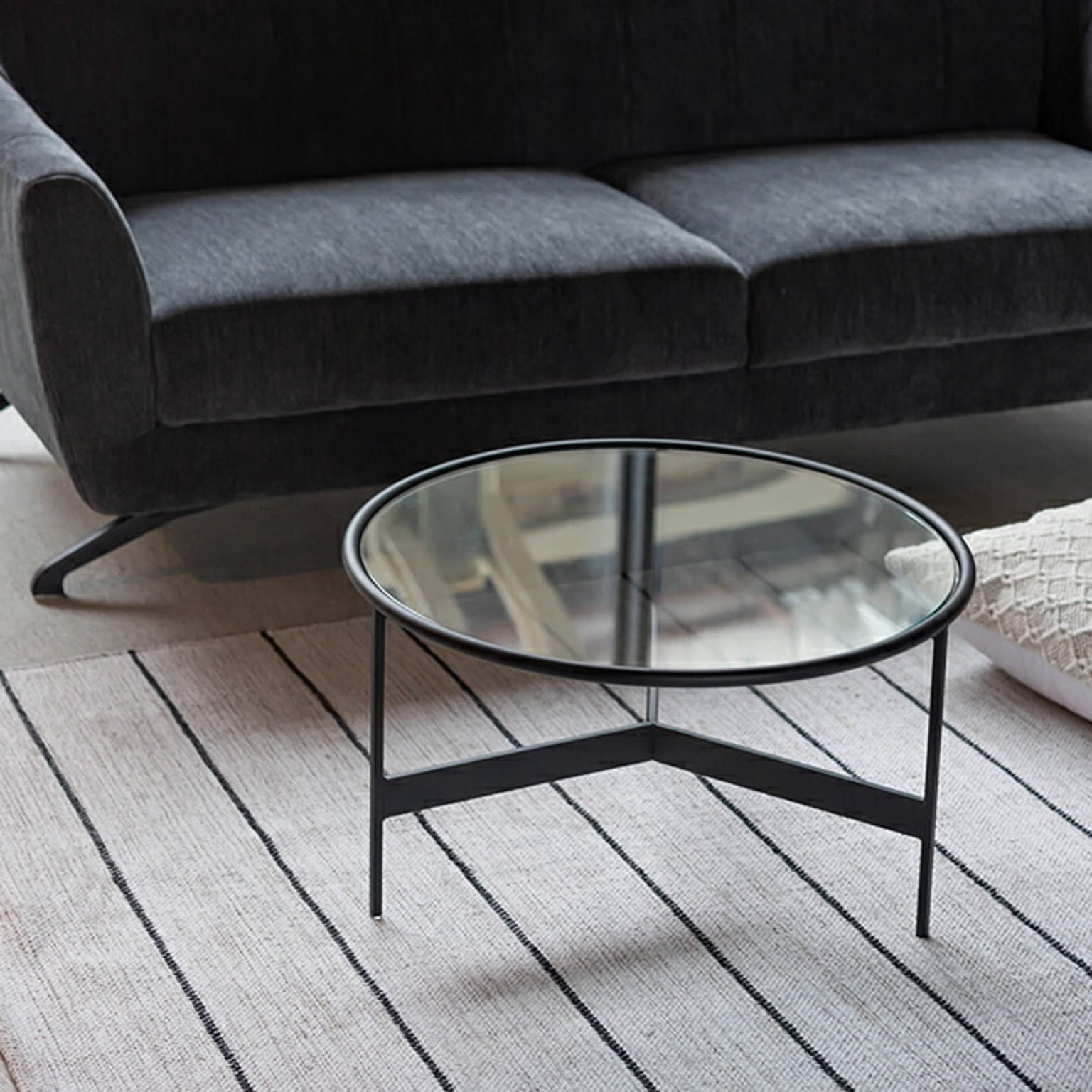 シンプルでスタイリッシュなガラステーブル。マットなブラックアイアンの滑らかな曲線とハードなガラスを組み合わせたローテーブル。脚部は10mm角のシャープなラインが際立ち、透明なガラス天板との組み合わせは圧迫感の無い開放的な空間を演出します。