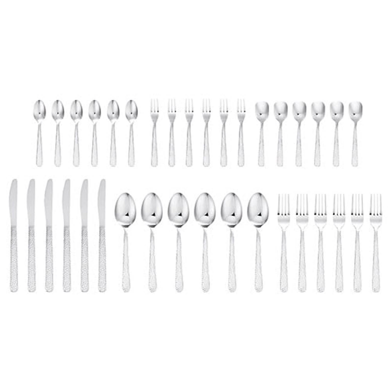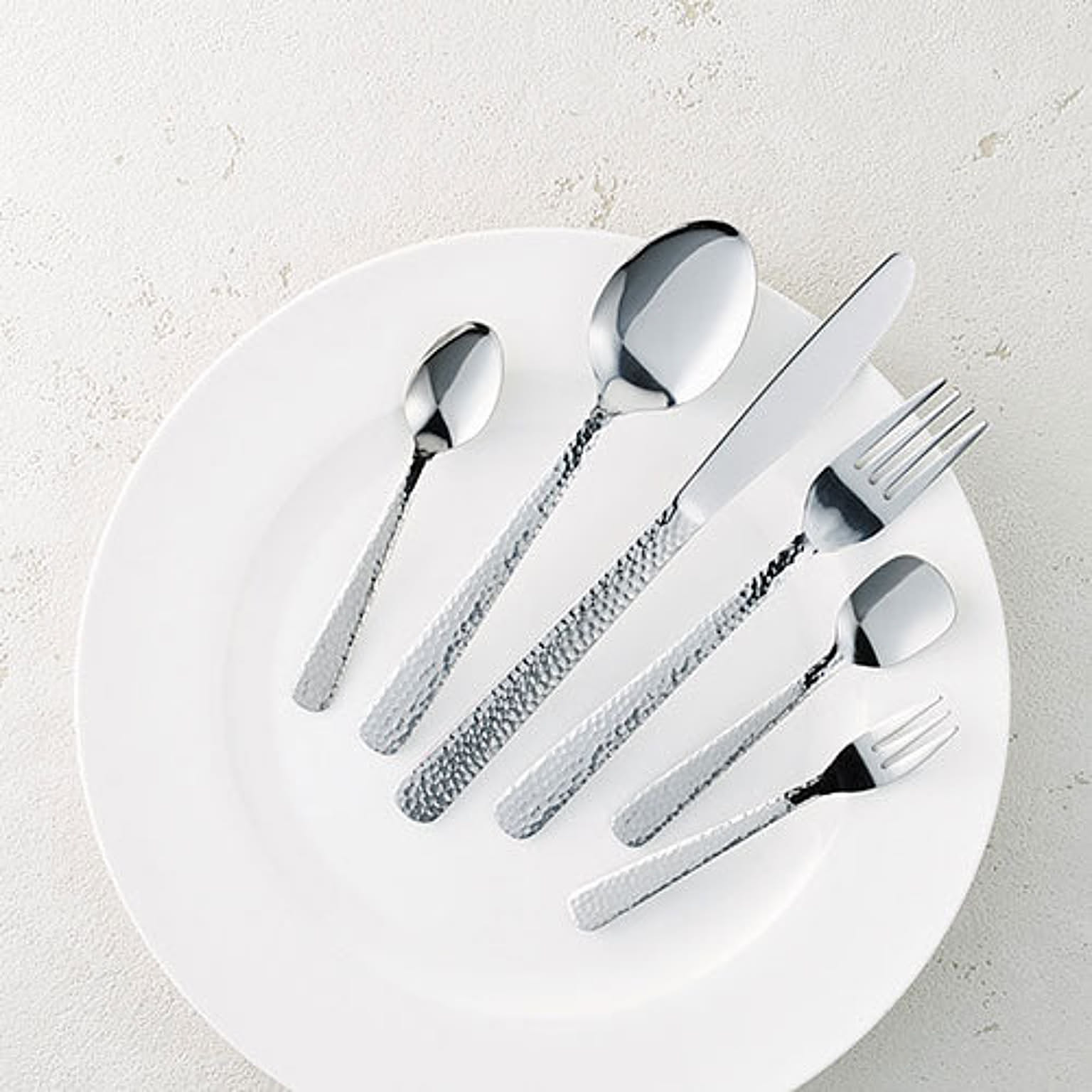 金属食器世界でも有名な金属加工の産地である新潟県燕市にて職人が手掛けたカトラリー。ハンドル部分には鎚目が入っており、職人の技が垣間見られます。家庭用食洗機使用可。メーカー品番:170-208 材質:ステンレススチール セット内容:ディナーナイフ・ディナースプーン・ディナーフォーク・コーヒースプーン・ヒメフォーク・アイスクリームスプーン×各6 本体重量:約952g 生産国:JPN