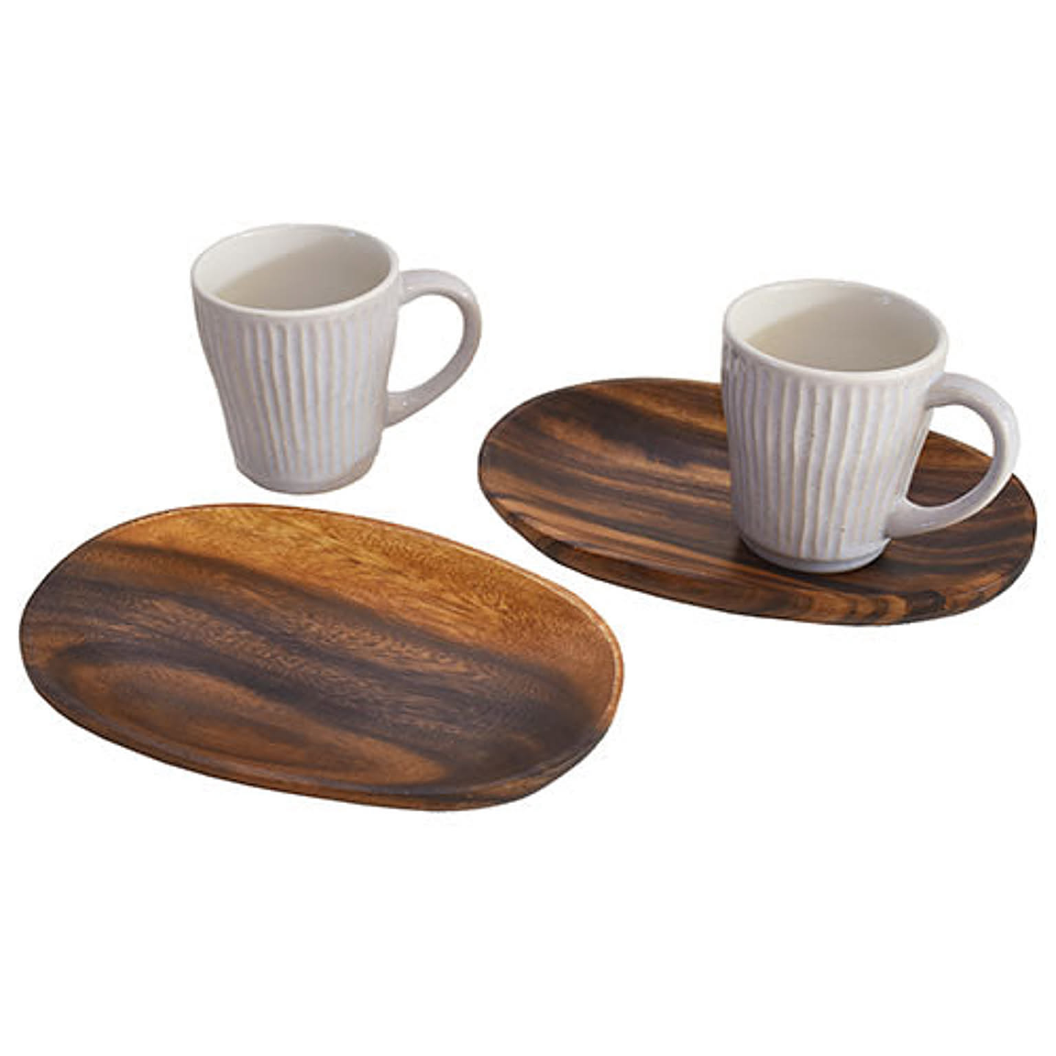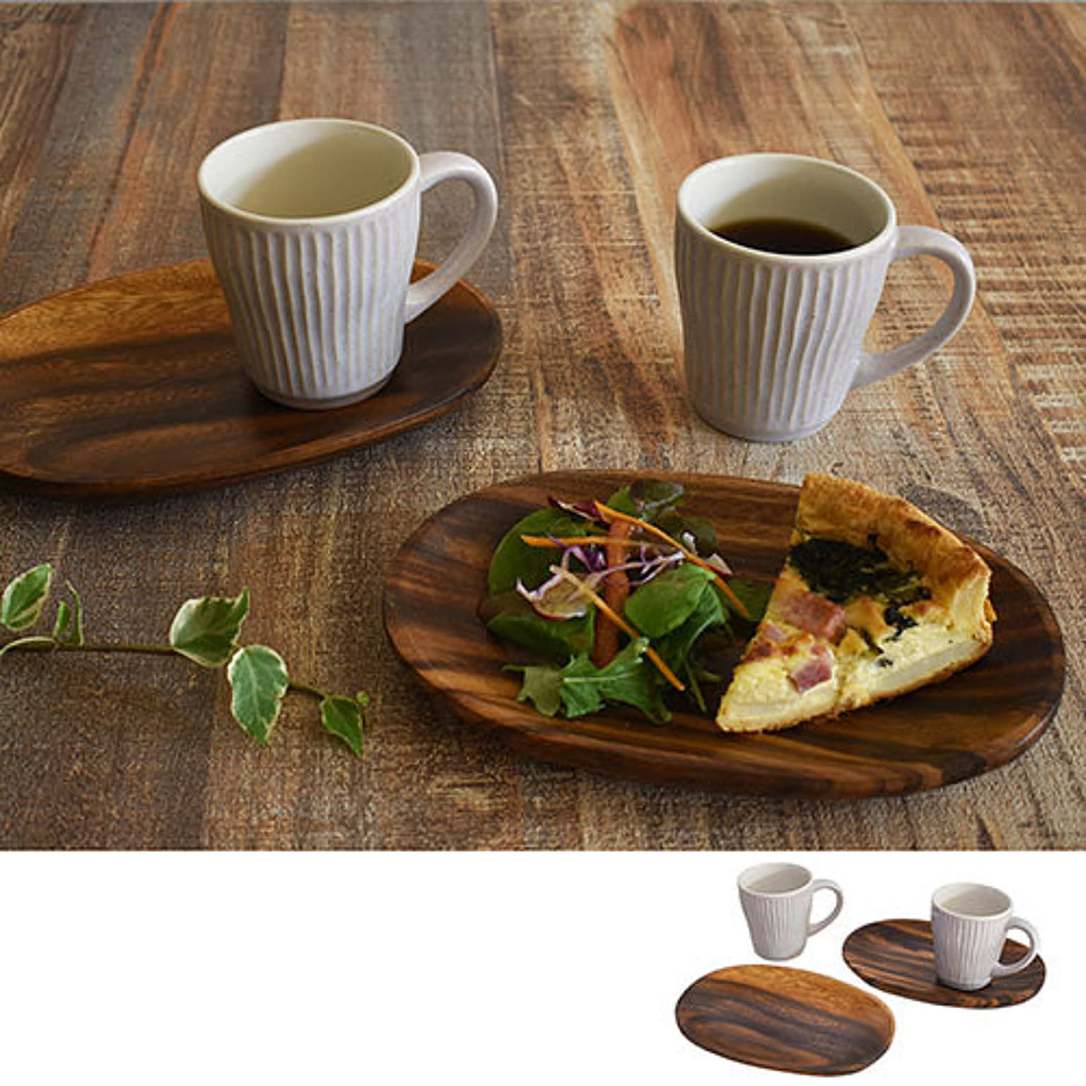 カフェ気分になれる、ナチュラルプレート。やさしい風合いとナチュラルなあたたかさで、波紋のようなレリーフの中に生まれる釉薬のグラデーションが美しいマグカップと、天然木で色合いや木目がひとつずつ異なるトレーのセットです。アカシアのトレーを上手に使っておうちでカフェ気分に。◎セット内容・材質/マグカップ(Φ8.4×12×9.6cm、330ml、磁器)×2、トレー(約15.4×22.6×2.5cm、天然木:アカシア)×2