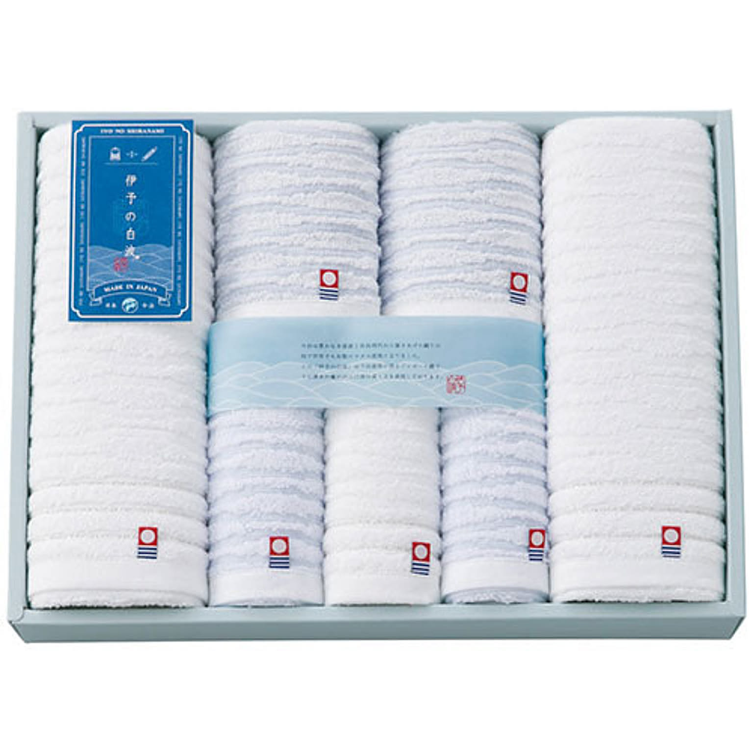 お歳暮・お中元、出産祝い、父の日や母の日ギフトに。タオルセット【伊予の白波】は今治の誇るジャガード織で、その湧水や瀬戸内の白波の美しさを表現しております。パイル部分には緩く撚り上げた国産紡績糸を使用しているので、柔らかな風合いです。60×110cmバスタオル2枚・33×75cmフェイスタオル3枚・33×35cmウォッシュタオル2枚・綿100%・[日本製] 箱サイズ:38.8×28.5×5.7cm・80サイズ・1000g メーカー型番:IY2090